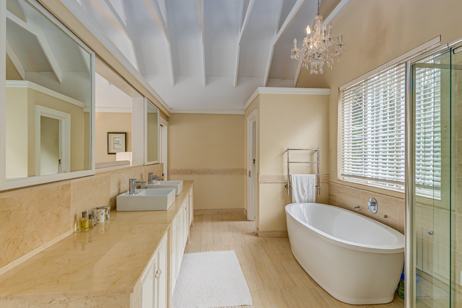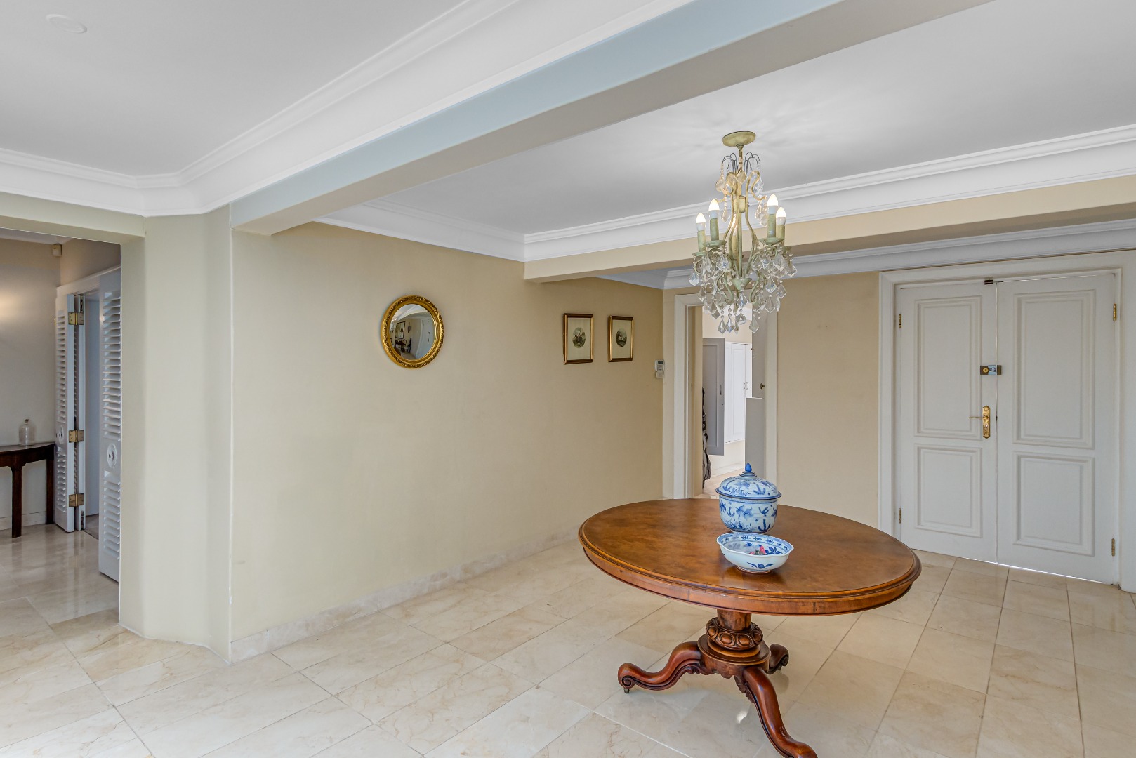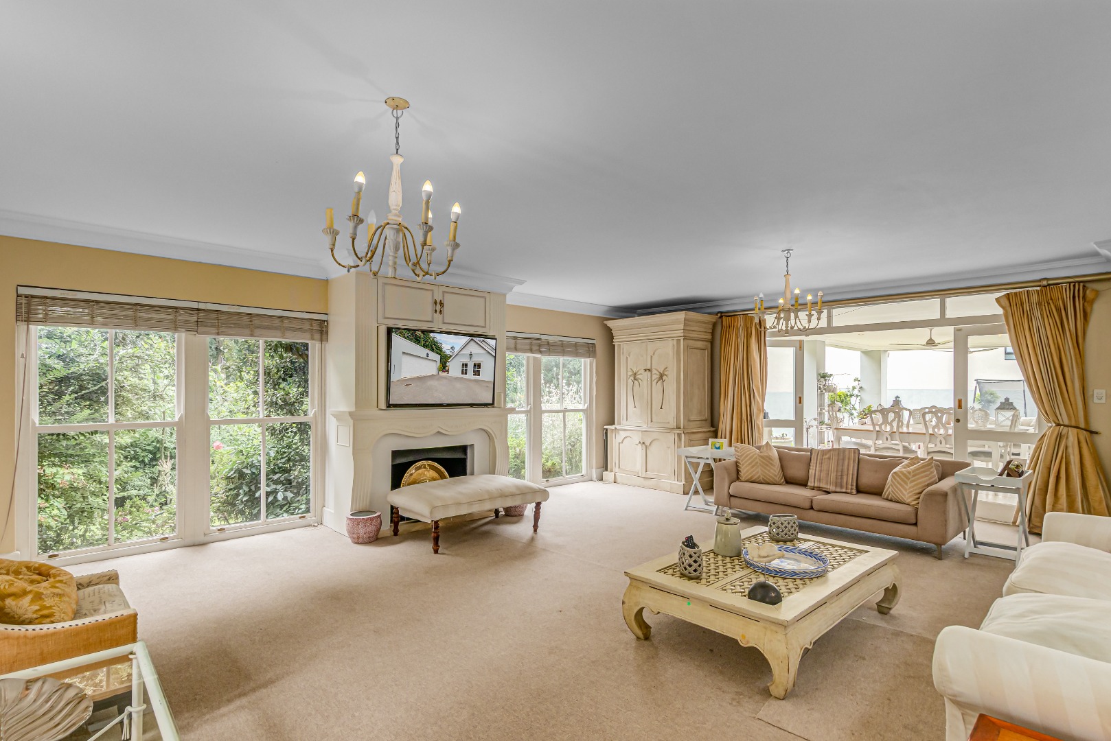 At the heart of the home is a luxurious open-plan gourmet kitchen featuring a substantial central island with integrated gas hob and oven, cream cabinetry, Crema Marfil marble floor tiles and countertops, and premium appliances, perfectly suited to both sophisticated entertaining and everyday living.