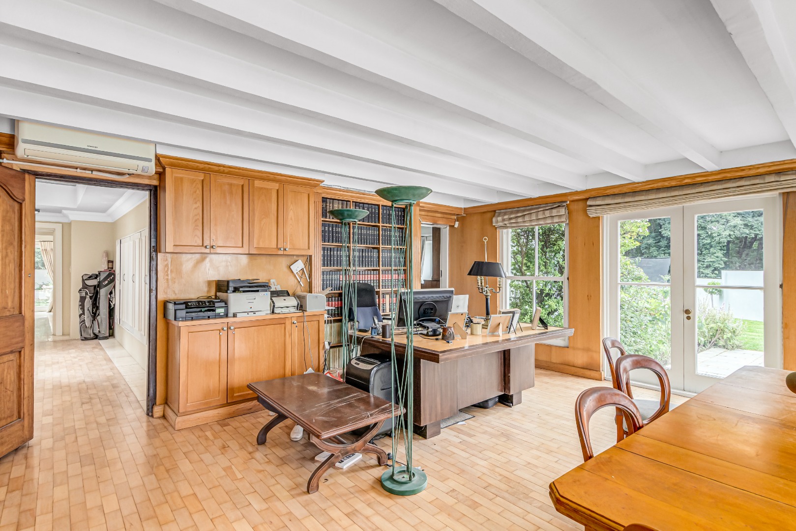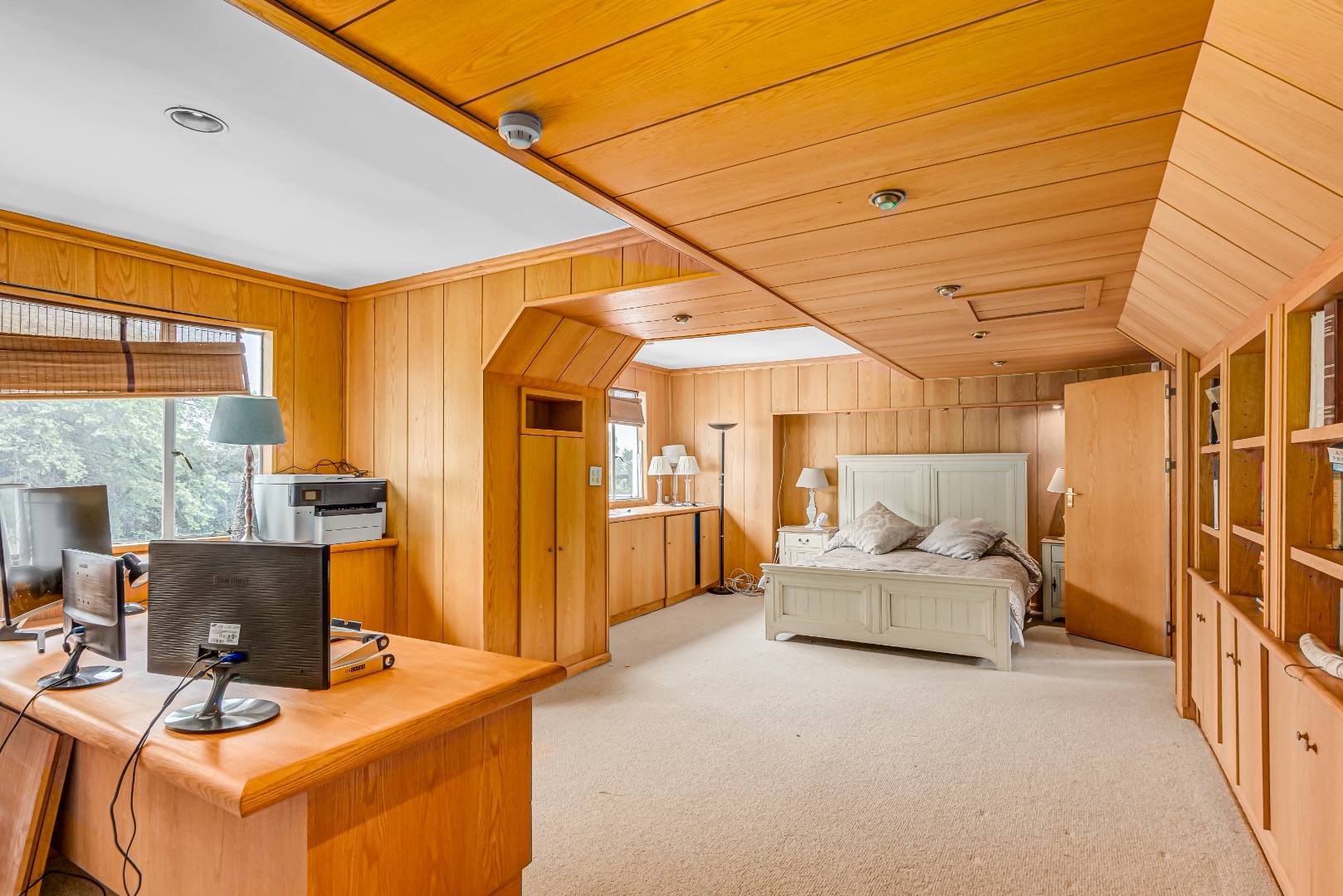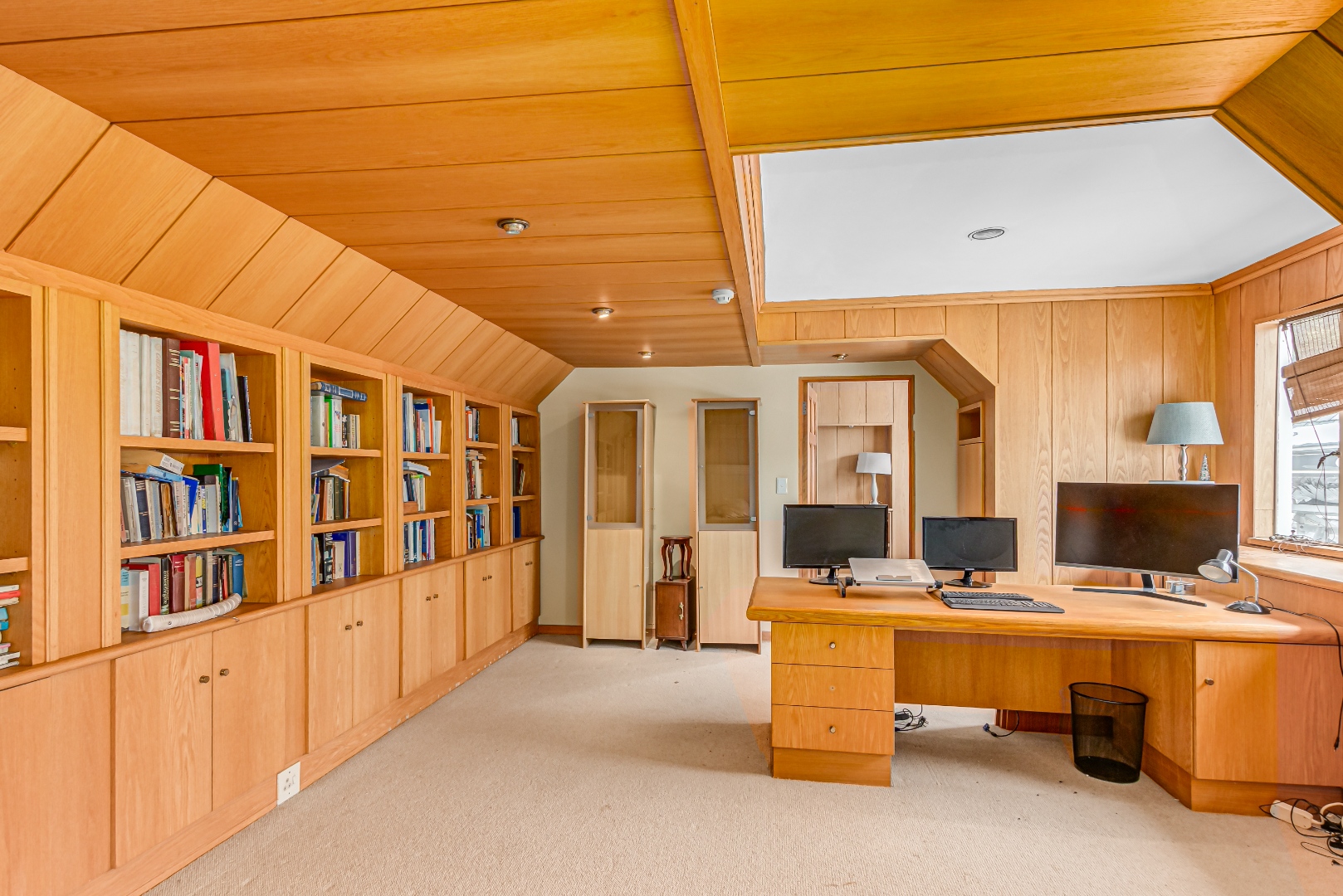 • Oak-paneled study with fitted cabinets and bookshelves
