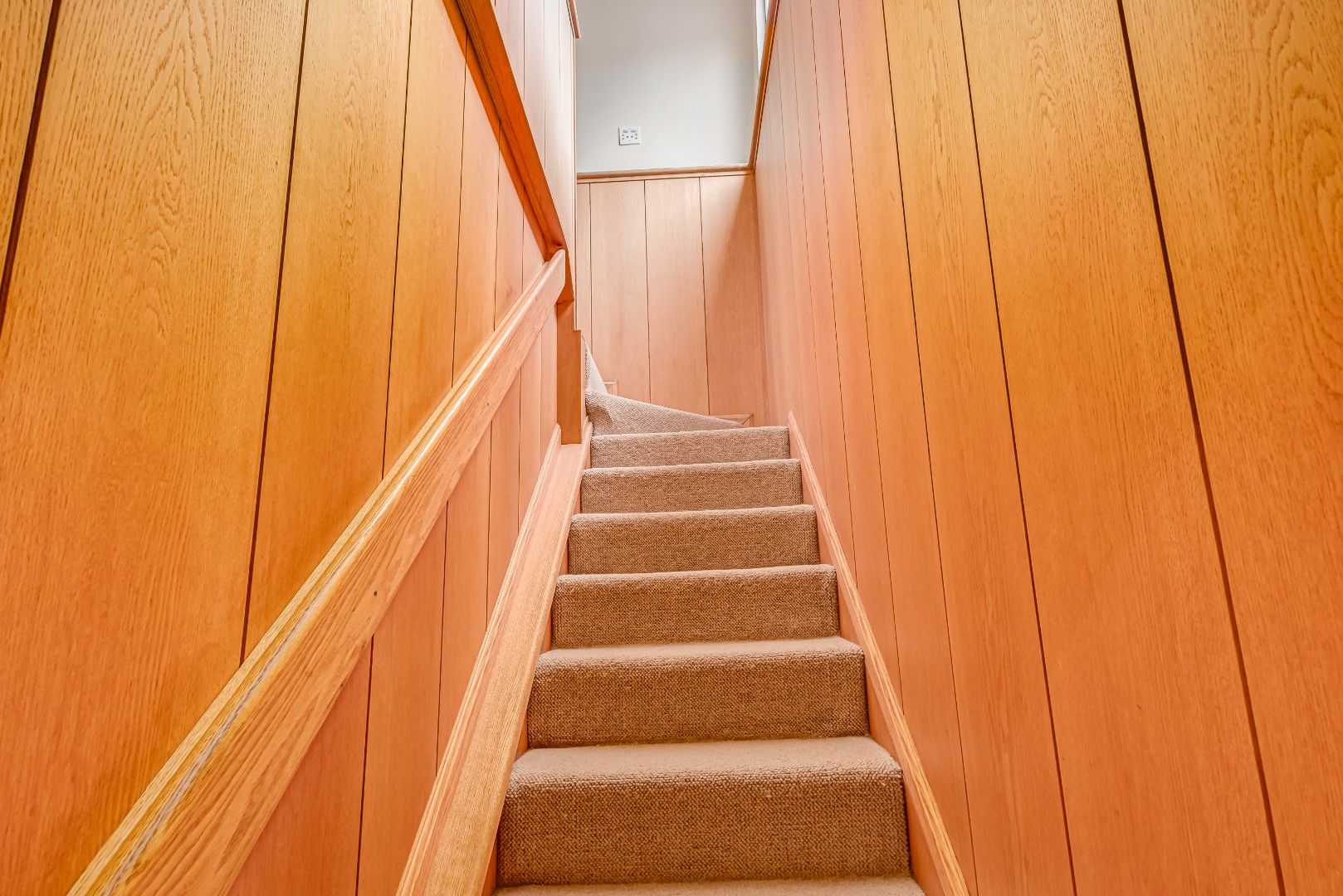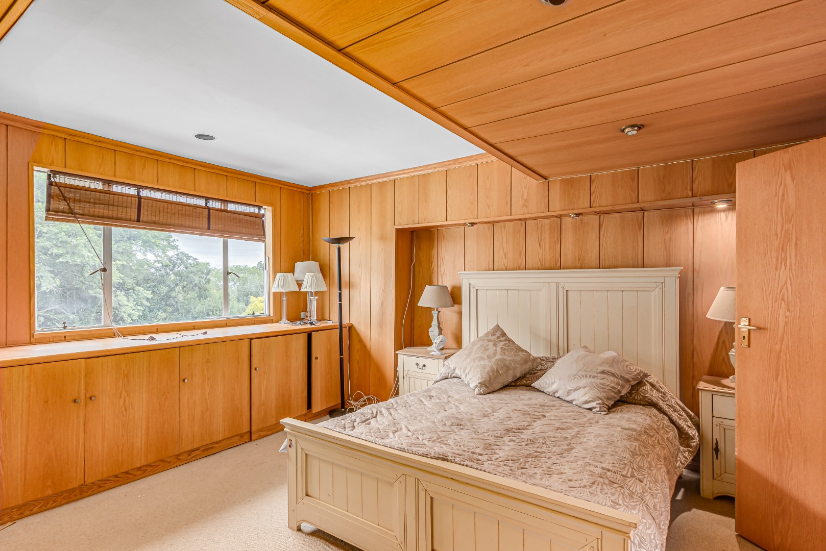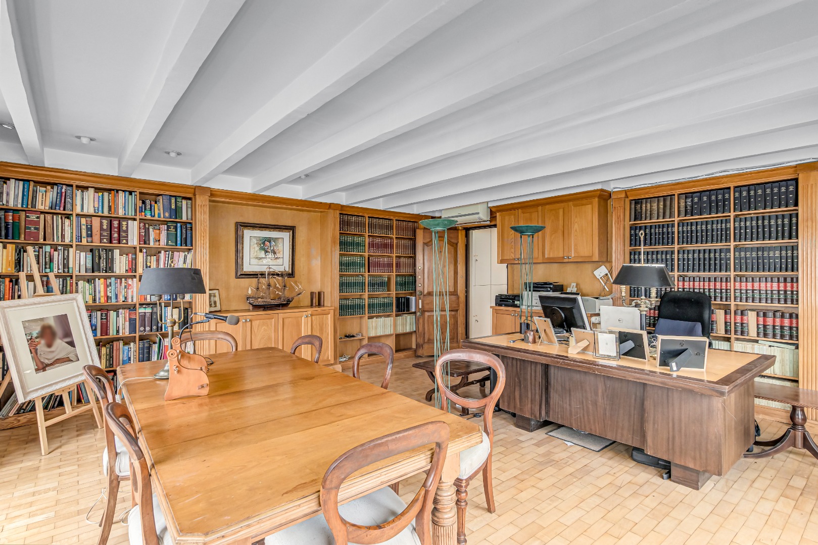 • Oak-paneled study with fitted cabinets and bookshelves