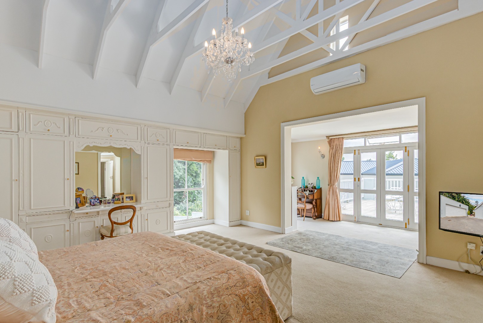 • North-facing main bedroom with open rafters, dressing room, and private West-facing patio
