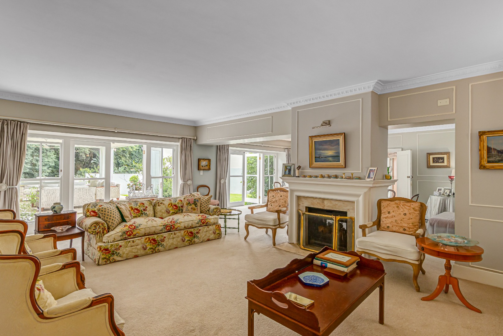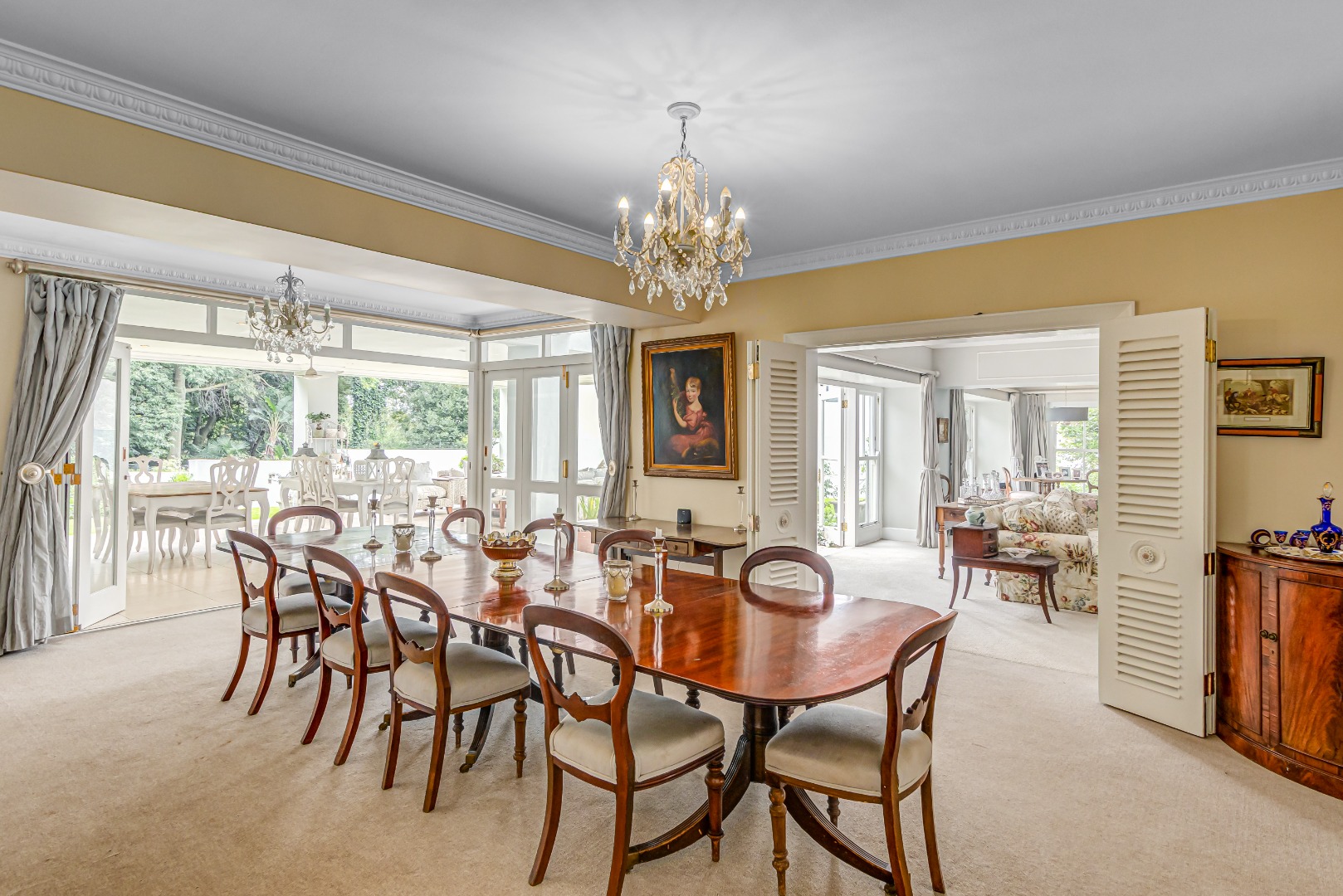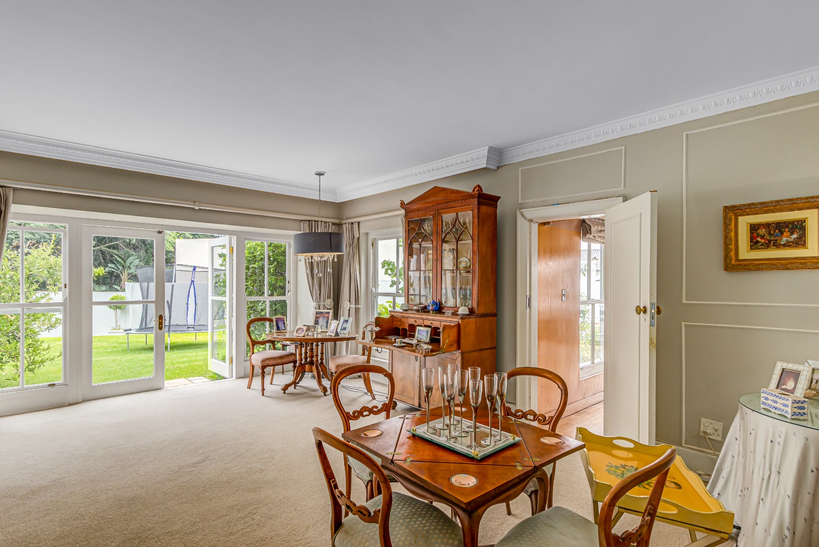 Upon entry, the home reveals grand, light-filled living spaces, including two elegant lounges and a formal dining room, enriched with classic architectural detailing such as crown mouldings and satinwood parquet flooring in the study. Floor-to-ceiling French doors enhance natural light and create a seamless transition to the landscaped garden, offering effortless indoor-outdoor living.
