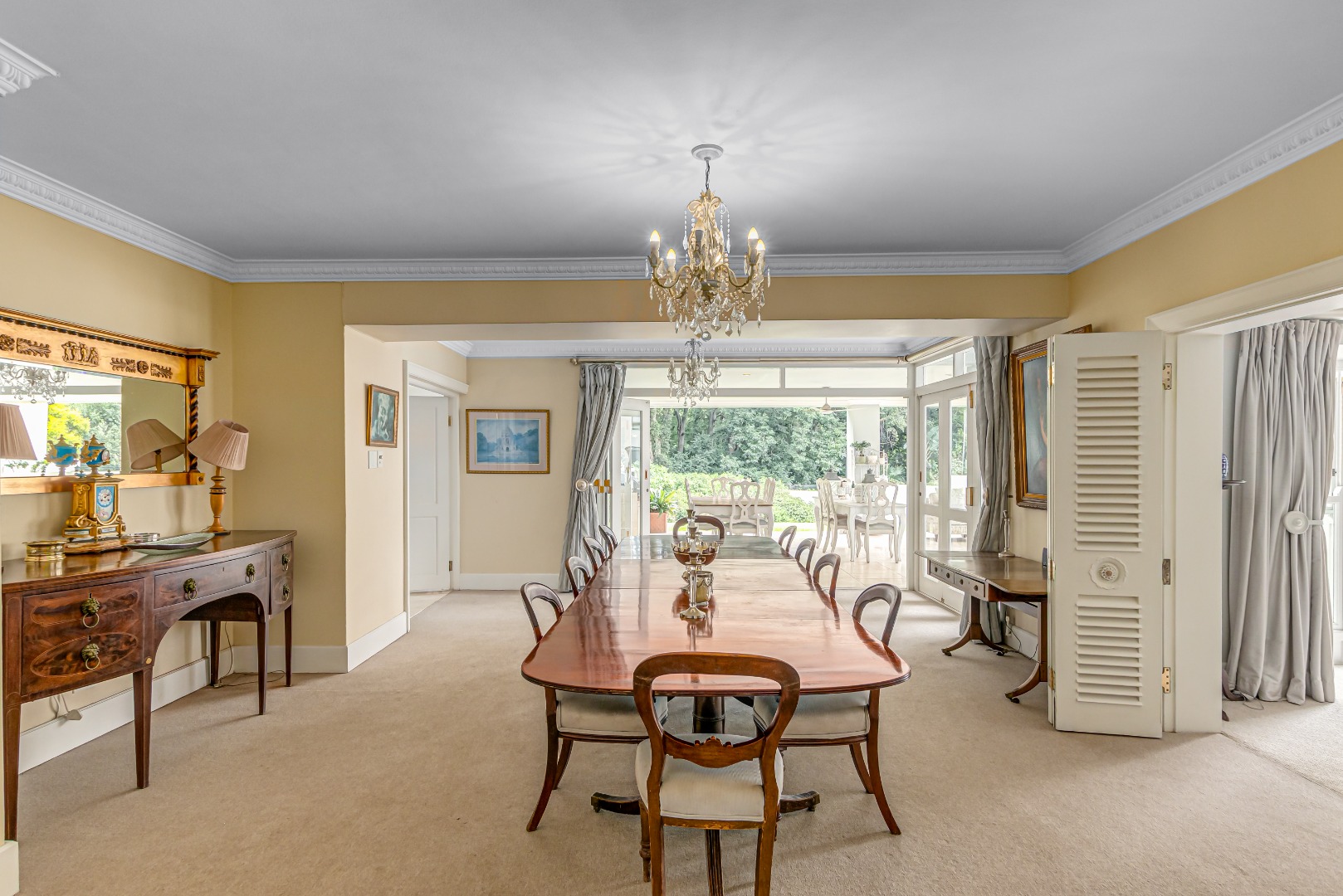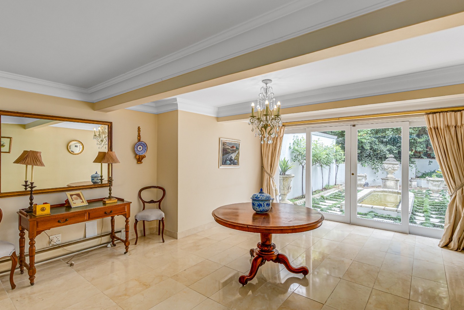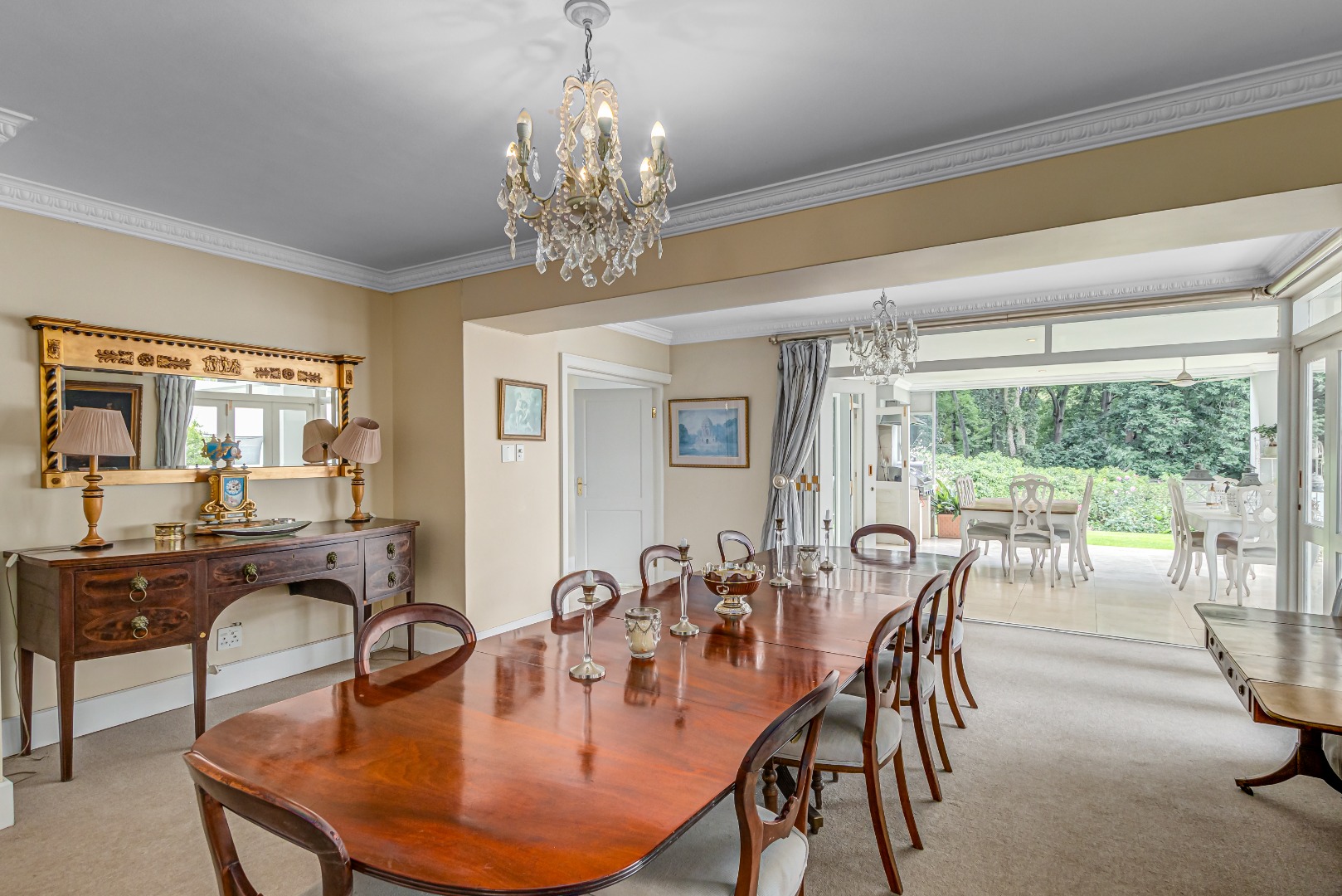 Upon entry, the home reveals grand, light-filled living spaces, including two elegant lounges and a formal dining room, enriched with classic architectural detailing such as crown mouldings and satinwood parquet flooring in the study. Floor-to-ceiling French doors enhance natural light and create a seamless transition to the landscaped garden, offering effortless indoor-outdoor living.
