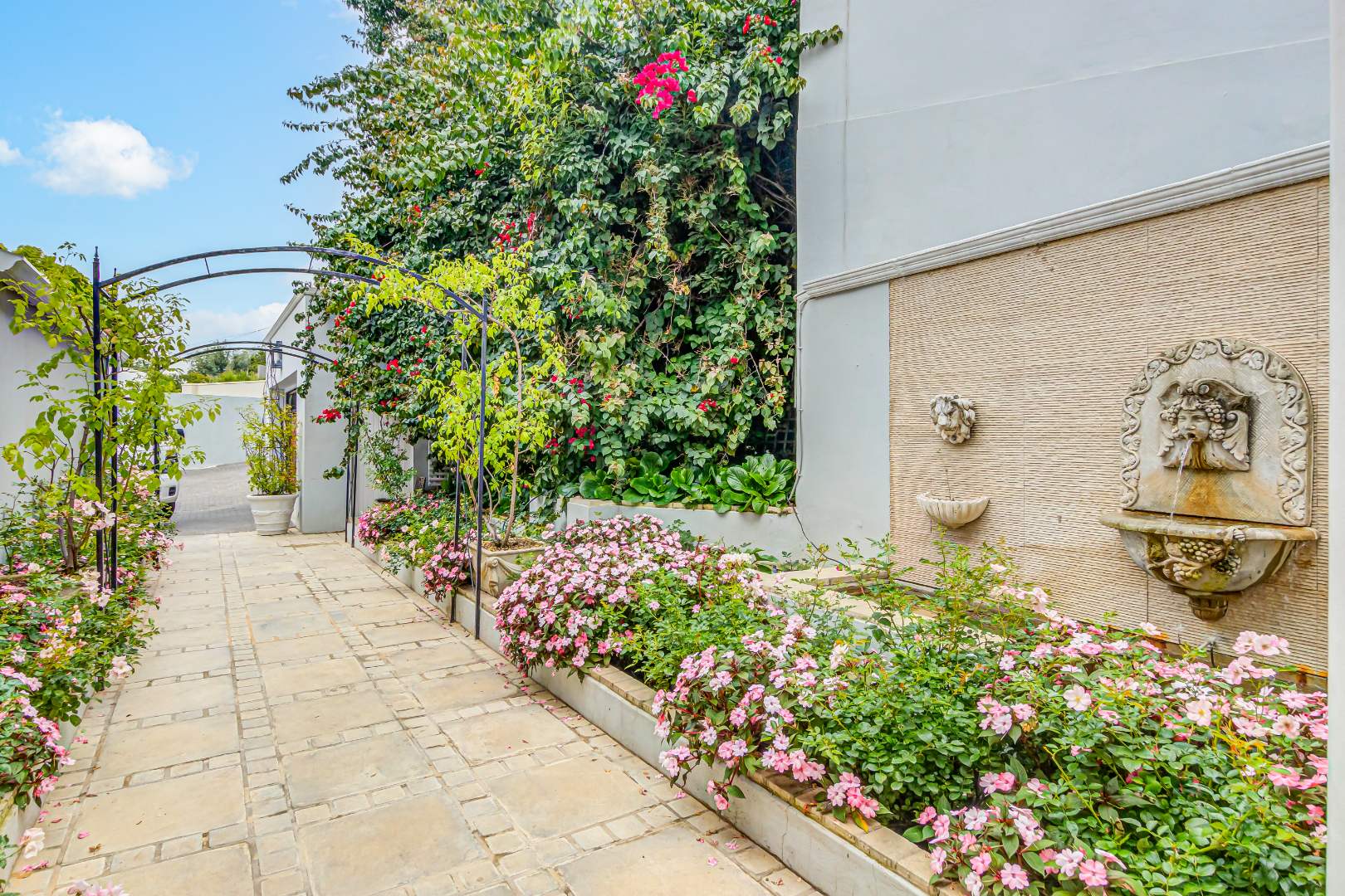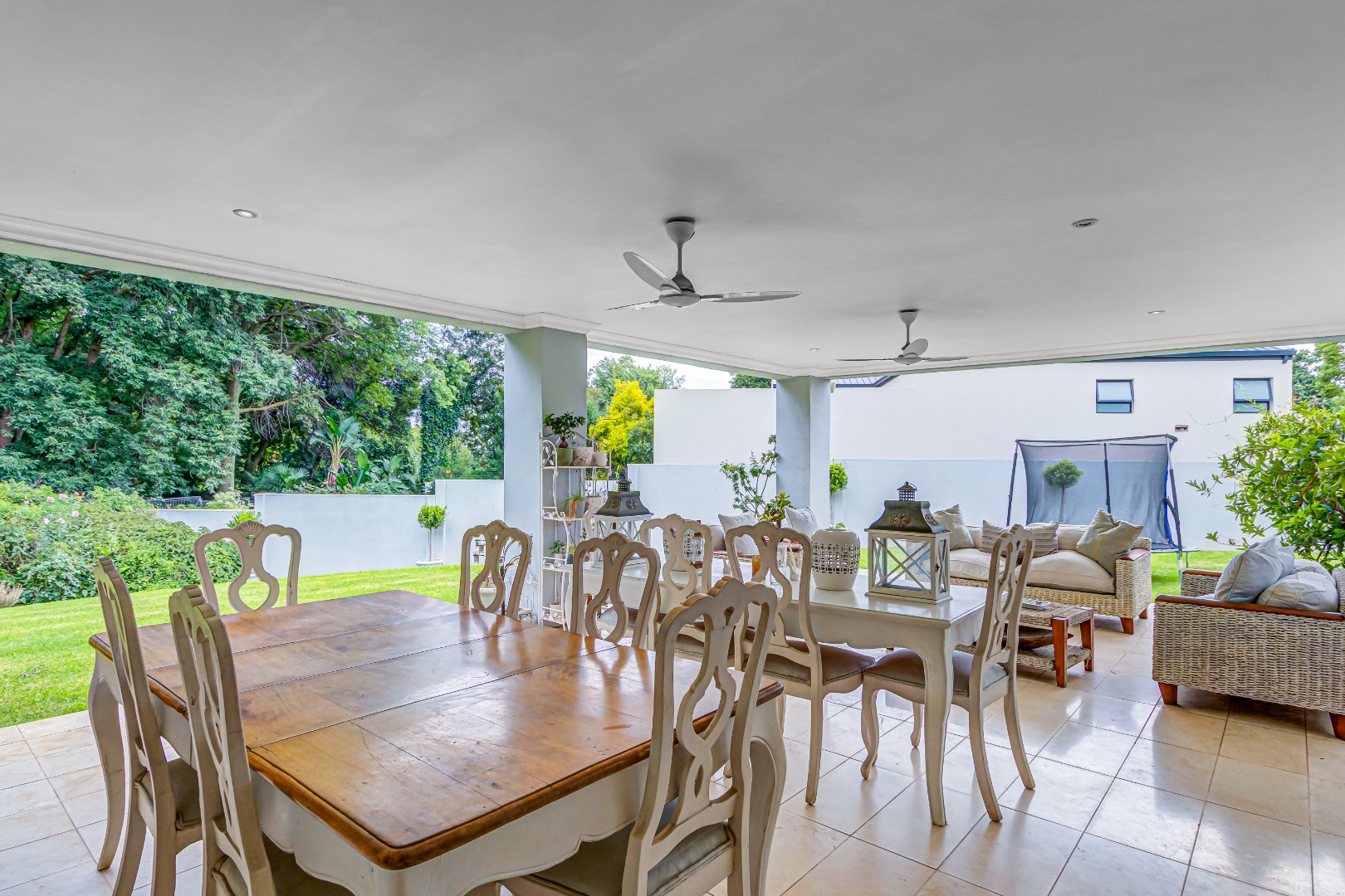 The covered entertainment patio, finished with Crema Marfil marble floor tiles and equipped with a gas barbecue and pizza oven, offers an ideal setting for alfresco dining and entertaining. The landscaped garden provides privacy and tranquility, with multiple access points enhancing flow throughout the property.