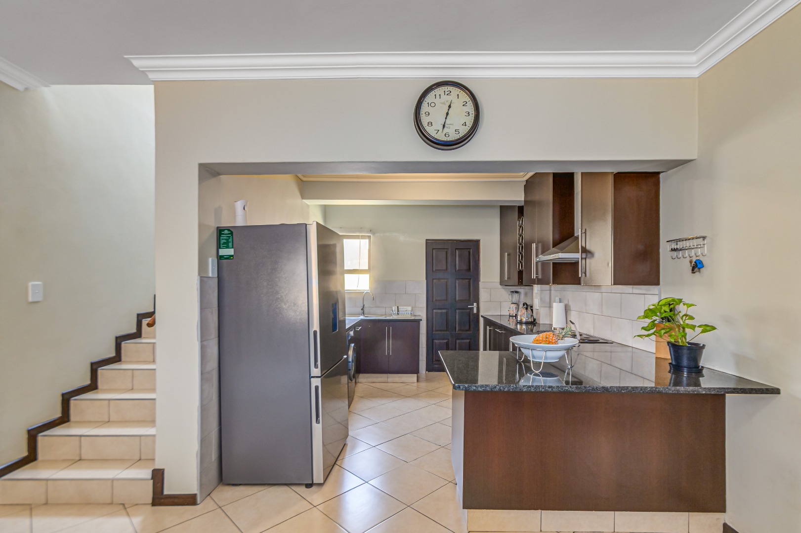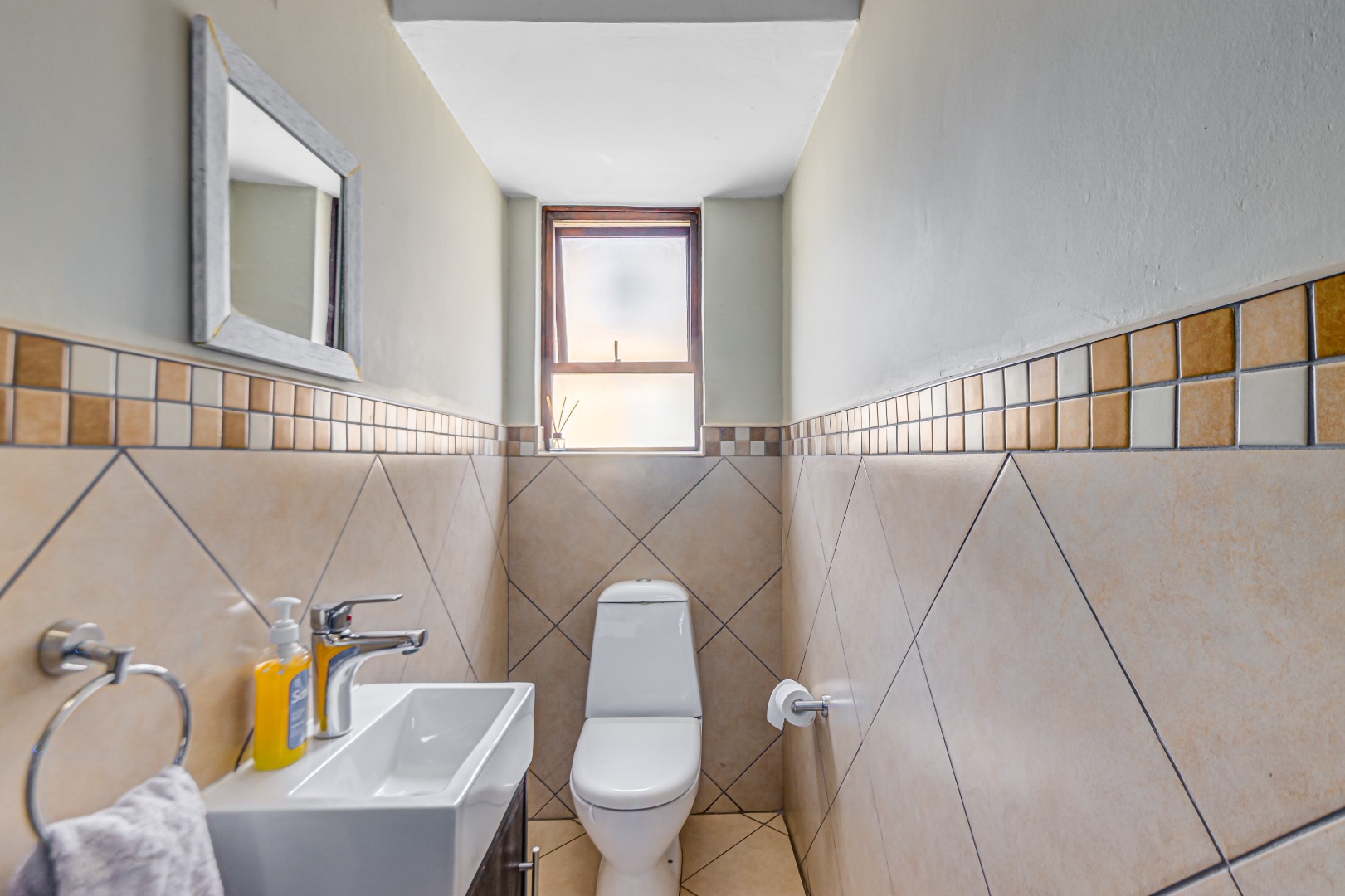 Downstairs welcomes you with a bright, open-plan design where the kitchen, dining, and living areas flow seamlessly together. Large windows invite natural light to fill the space, while the living room opens to a covered patio with a built-in braai, perfect for relaxed gatherings and summer evenings. The patio overlooks a wrap-around garden, offering extra outdoor space for entertaining or enjoying quiet moments. The kitchen provides ample cupboard space and room for two under-counter appliances, while a convenient guest toilet completes the ground floor.
