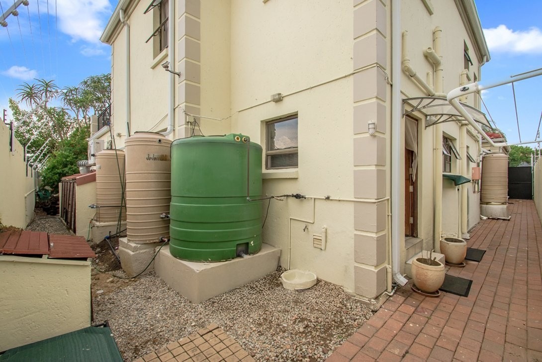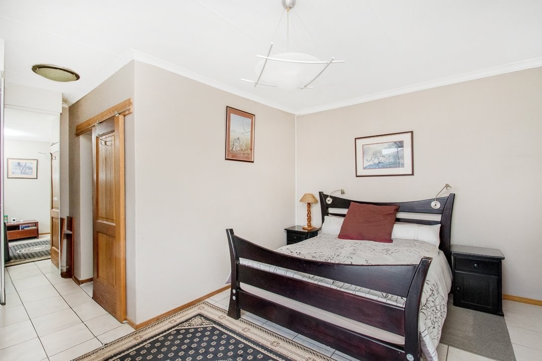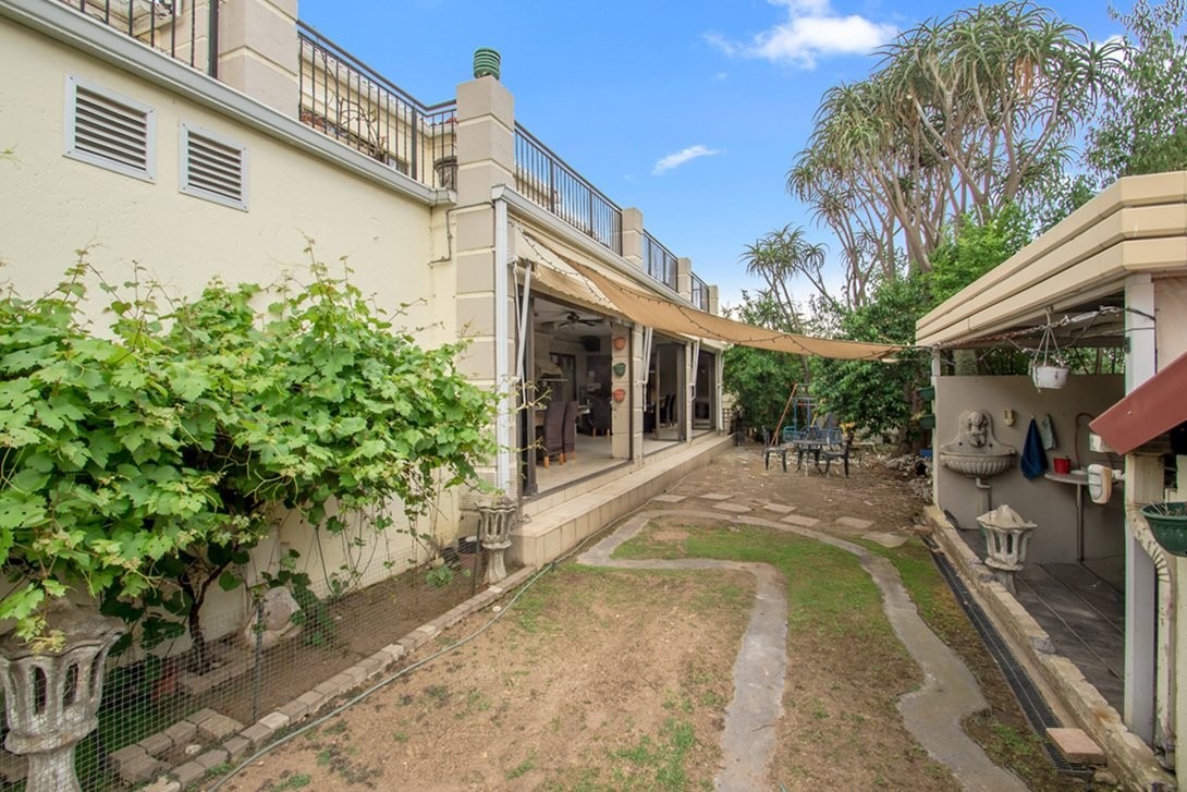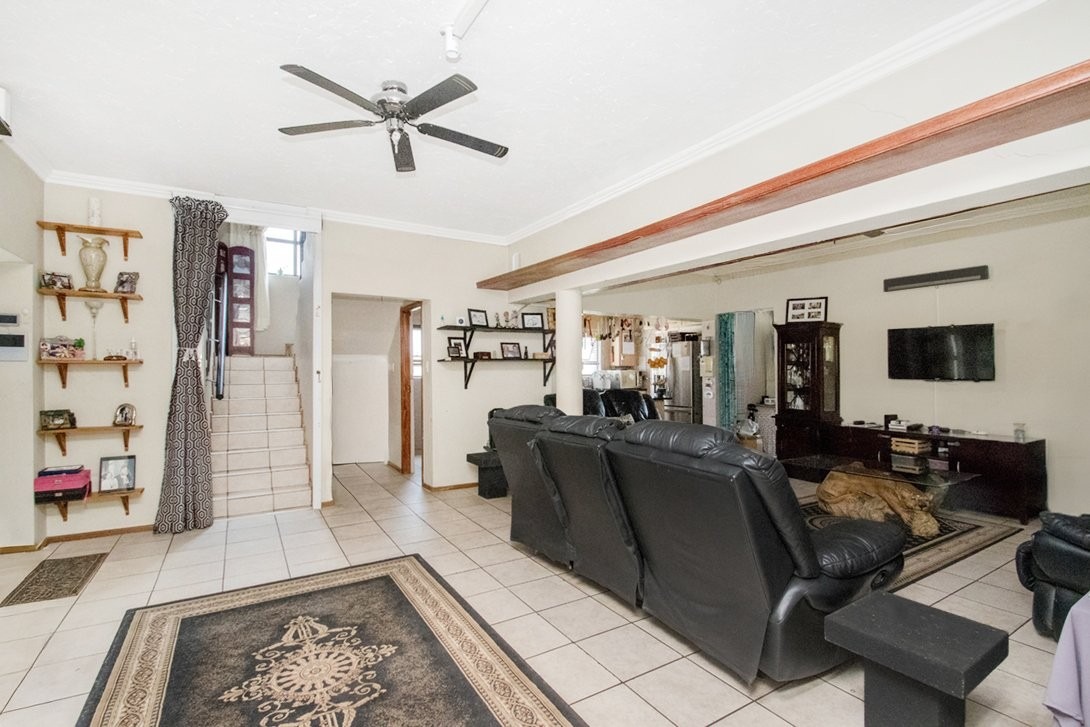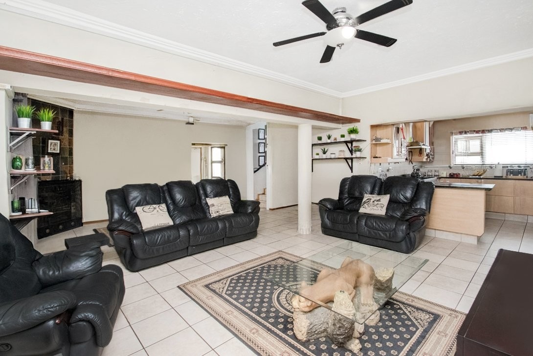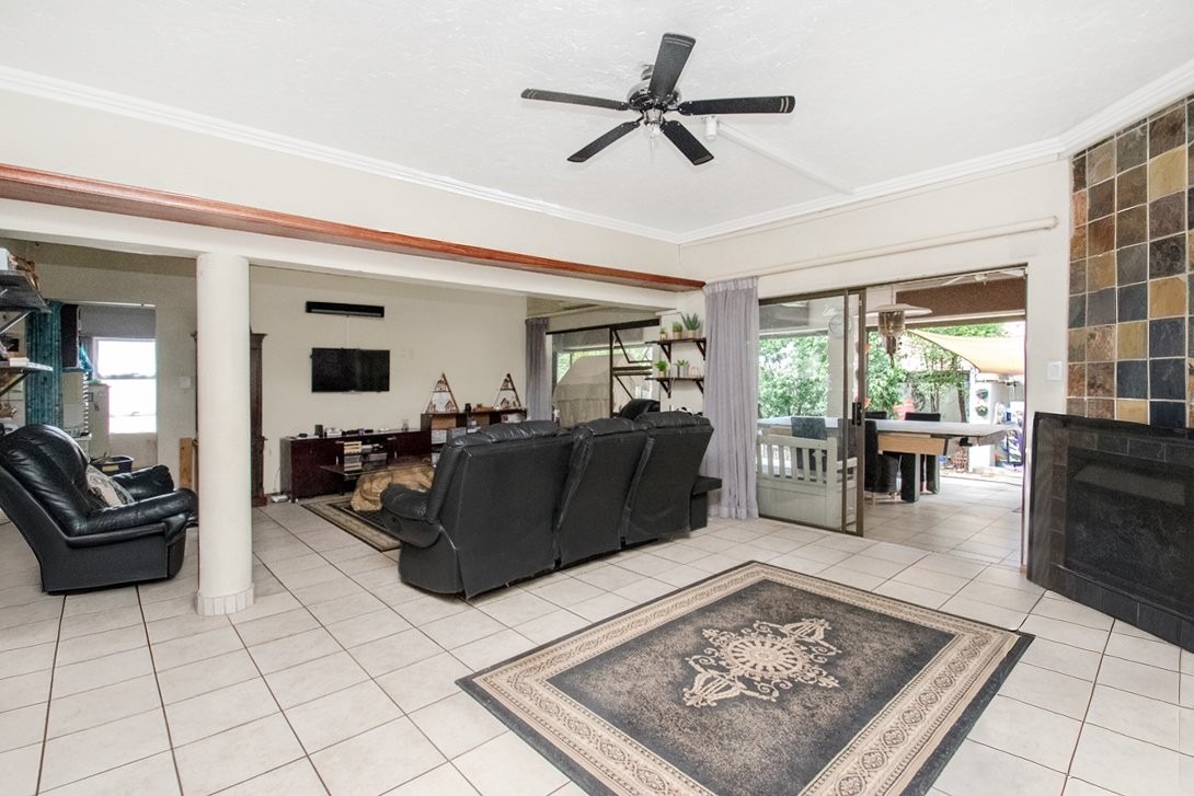The living room is extremely large, has a wood-burning fireplace and comfortably accommodates both a lounge and dining room. It flows out to an expansive, covered patio, ideal for entertaining, stepping down to the garden with a swimming pool, a covered, integrated set-up for a generator, and a variety of fruit trees and a grapevine.