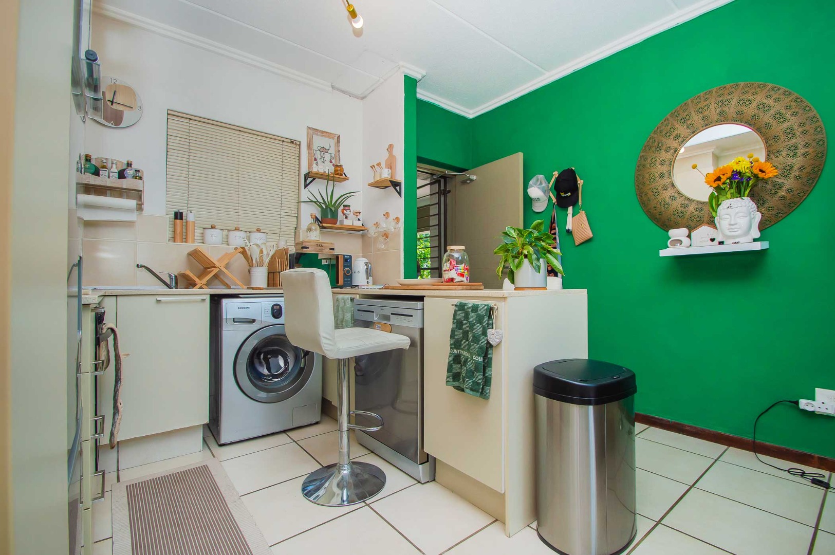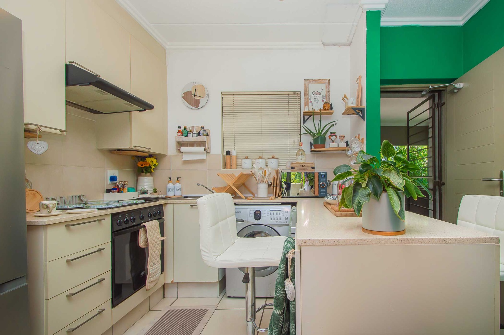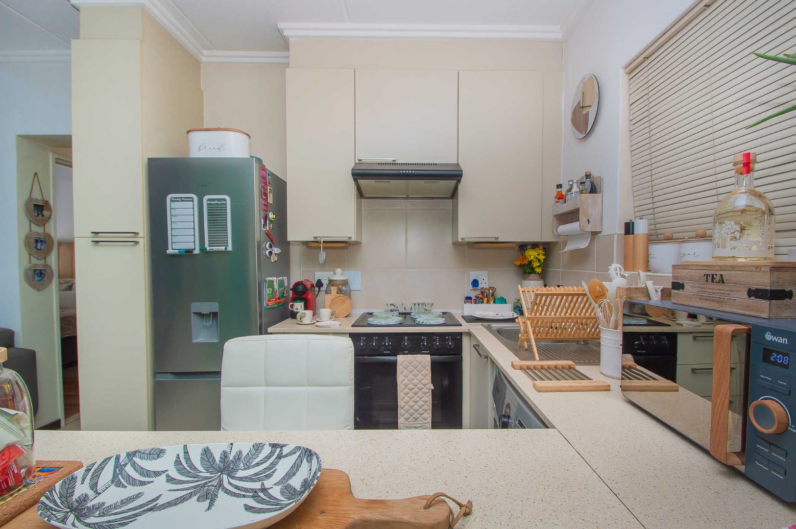 The gourmet kitchen is a testament to refined living, boasting sleek cream cabinetry, pristine countertops, and integrated modern appliances, including a washing machine, hob, oven, and microwave. A stylish breakfast bar offers a casual dining experience. The tranquil bedroom provides a sanctuary of comfort, complemented by a well-appointed bathroom, ensuring privacy and convenience.