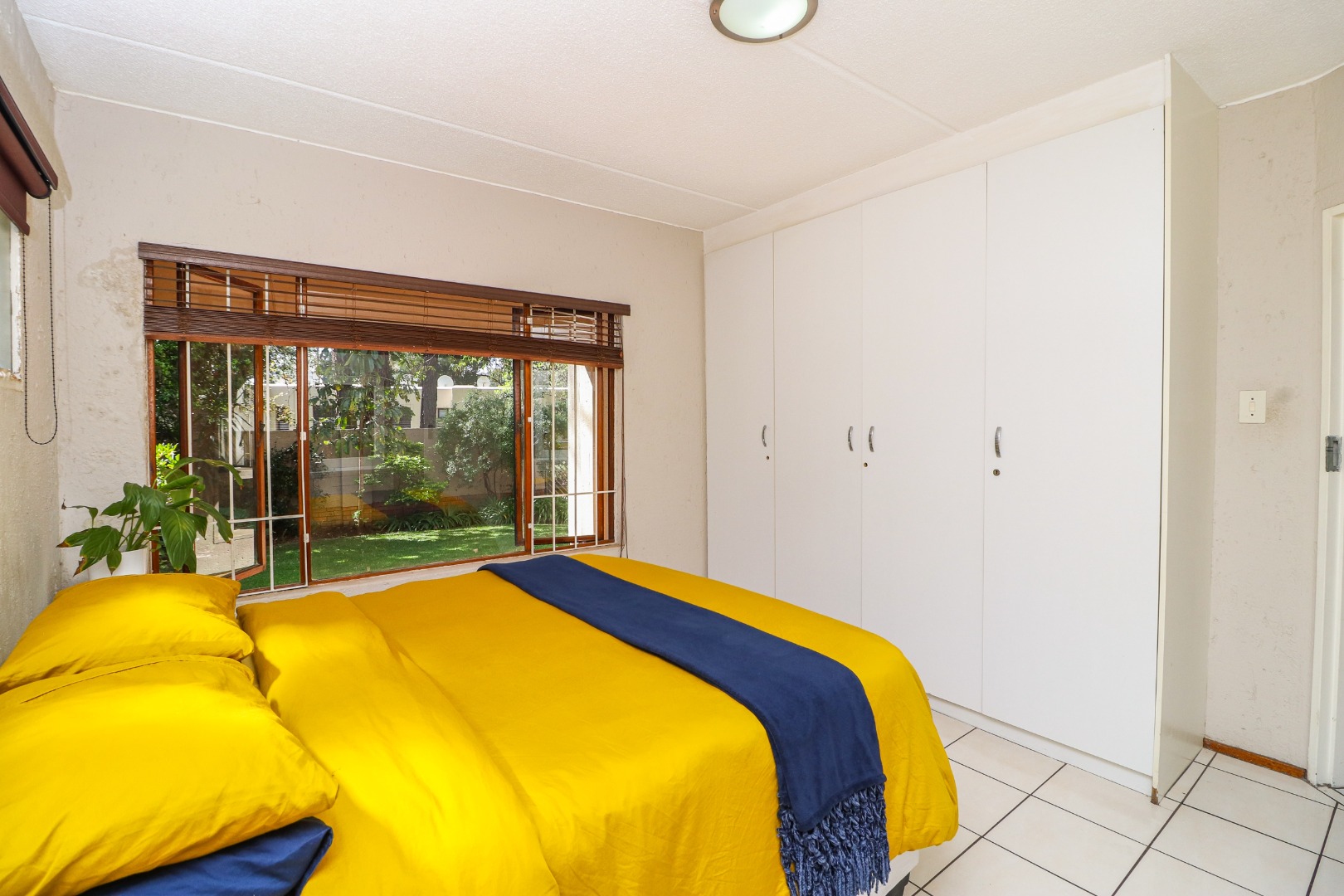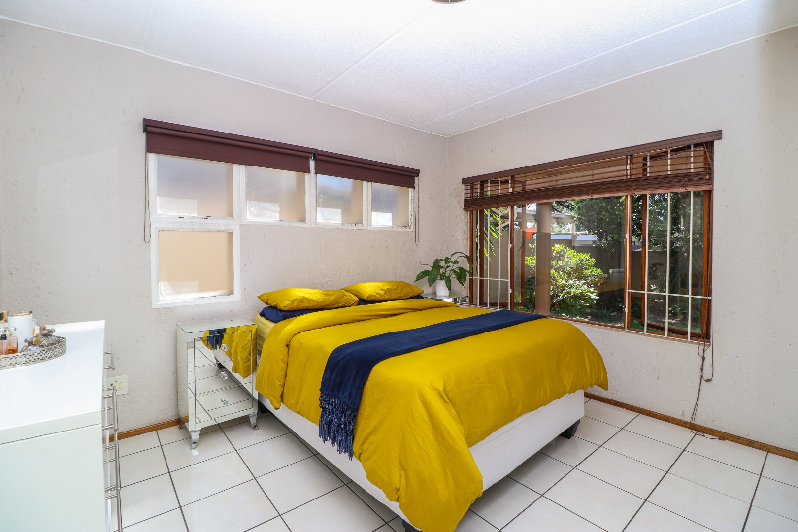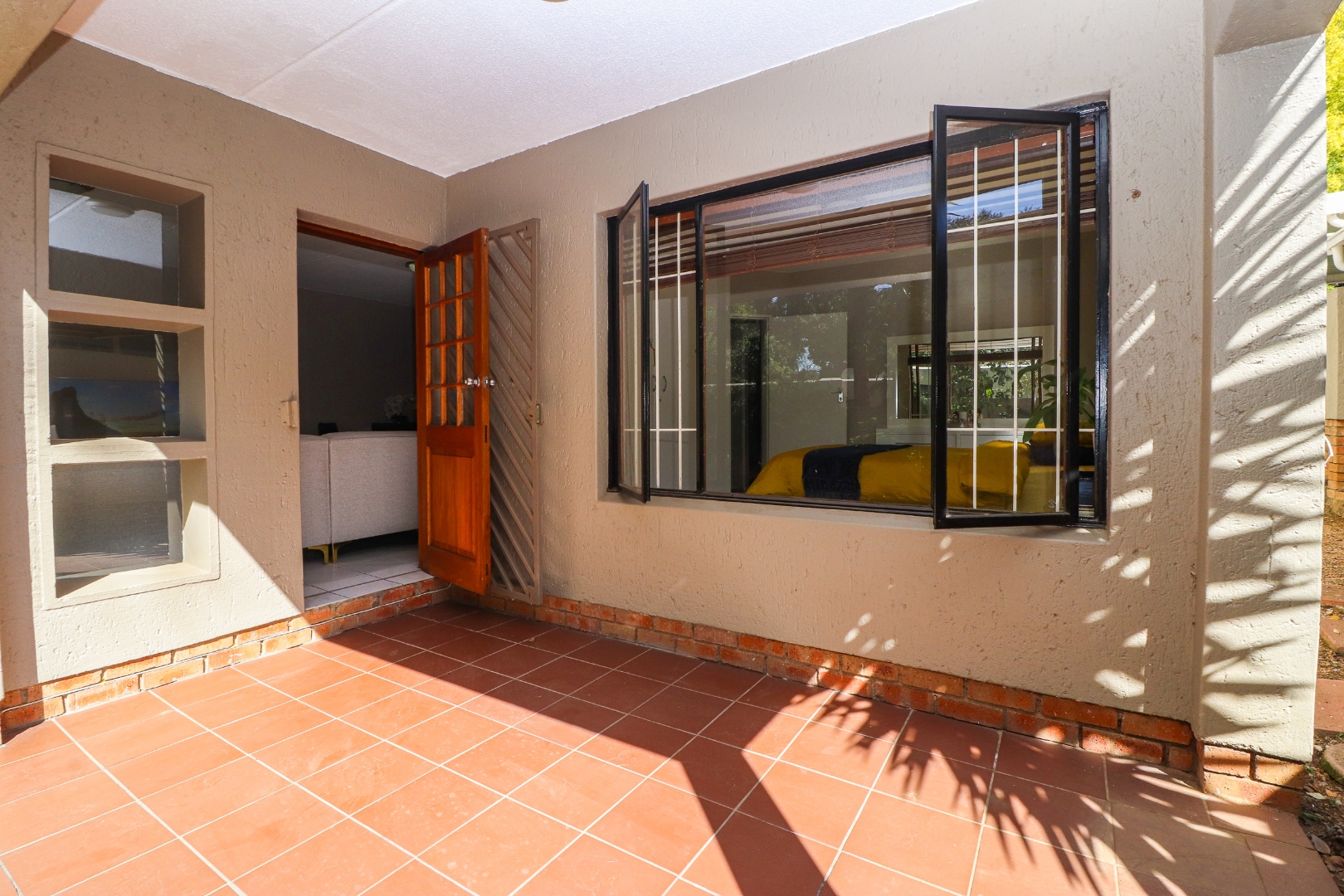 The bedrooms have the same matching flooring and lots of cupboards. The master has windows to the patio and views of the lush garden. The adjacent wall has glass bricks radiating light and warmth. The 2nd bedroom faces towards the back area.