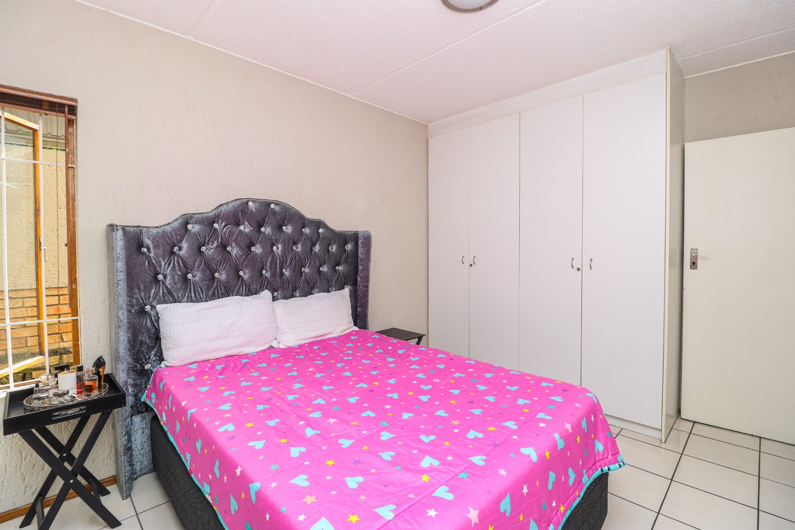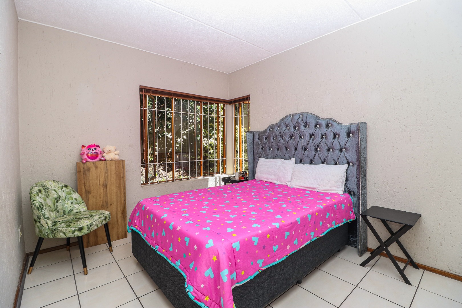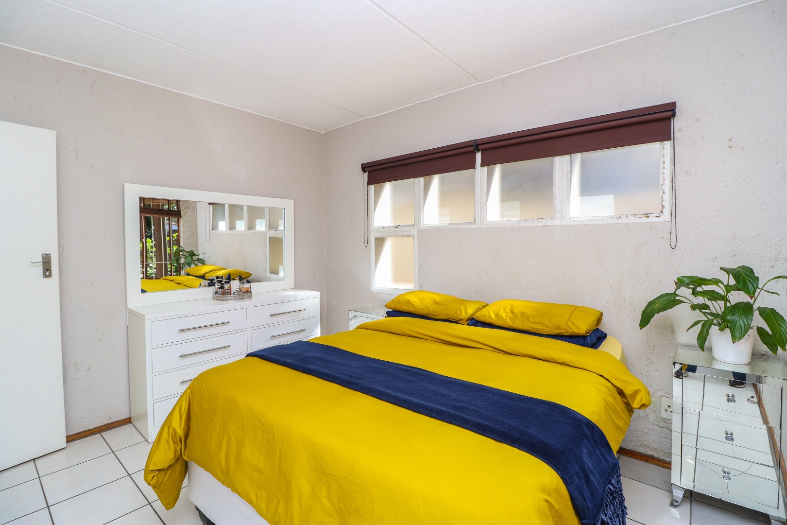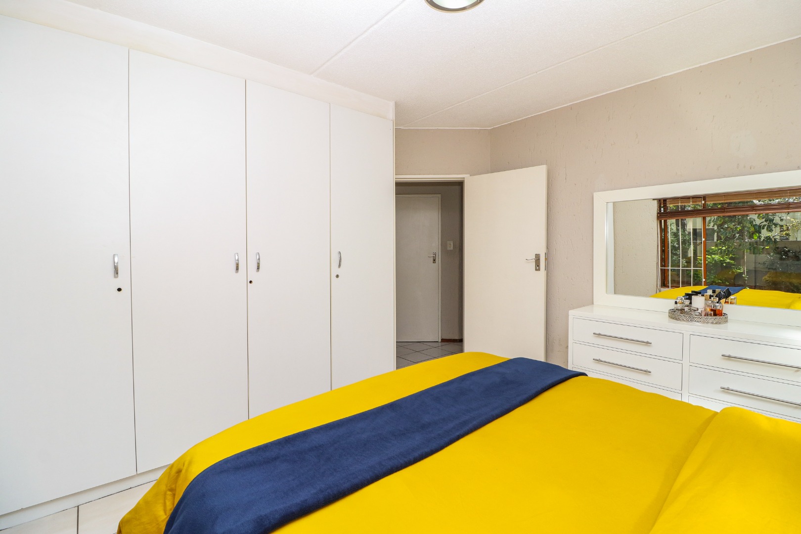 The bedrooms have the same matching flooring and lots of cupboards. The master has windows to the patio and views of the lush garden. The adjacent wall has glass bricks radiating light and warmth. The 2nd bedroom faces towards the back area.