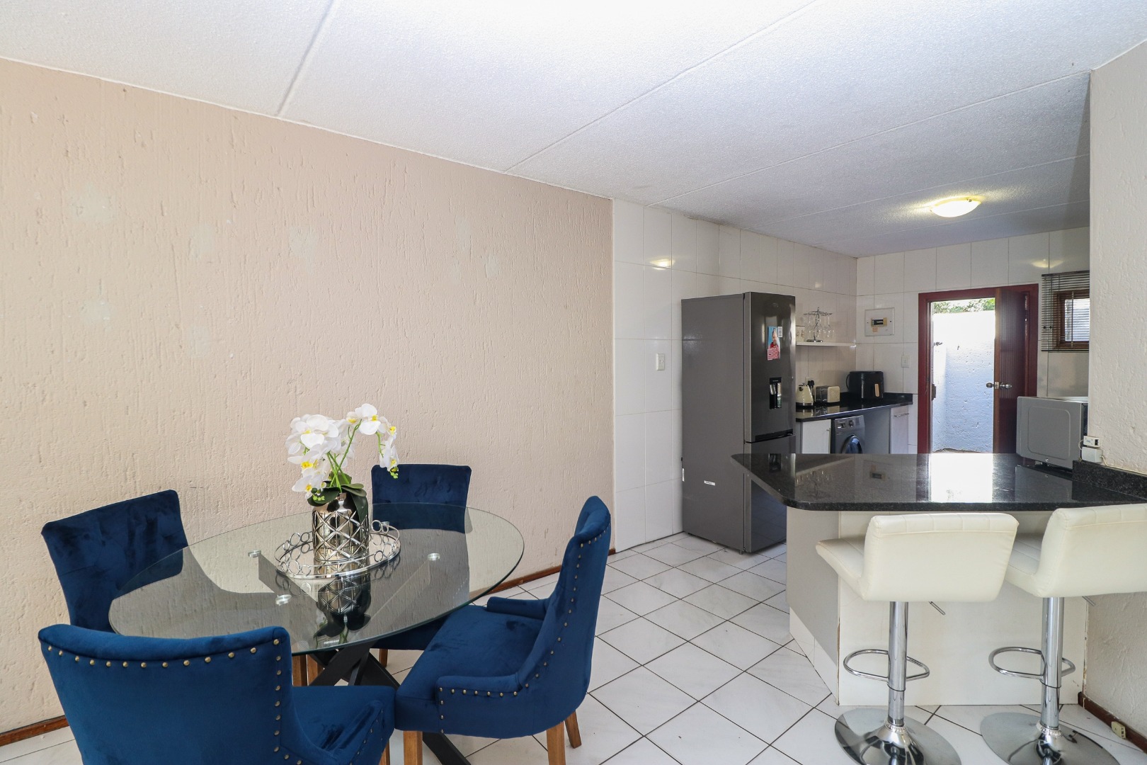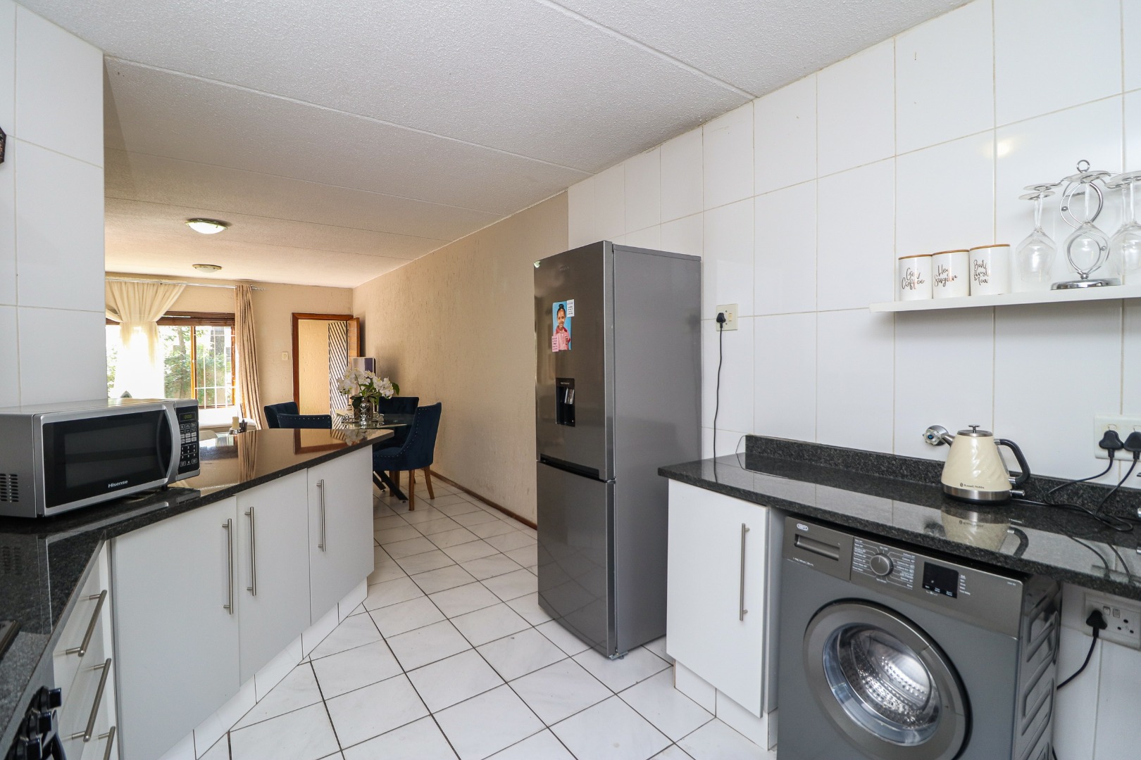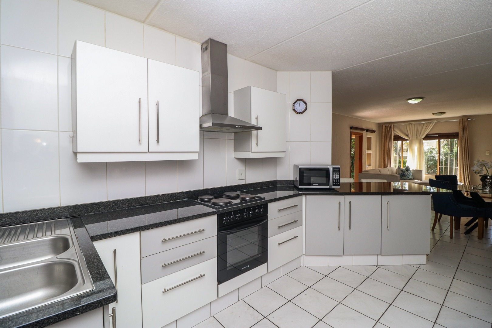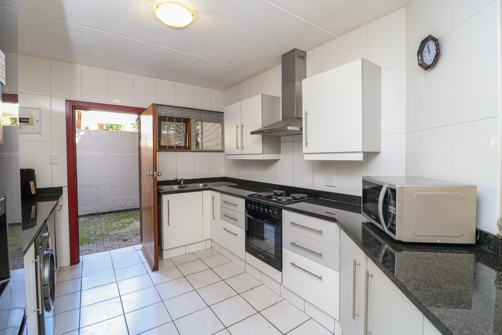 The kitchen is big - with many cupboards, running hard granite countertops and double sinks. There is space for both appliances and a wash line in the rear courtyard. The stove has a full extractor and a close kitchen bar to serve breakfast too.