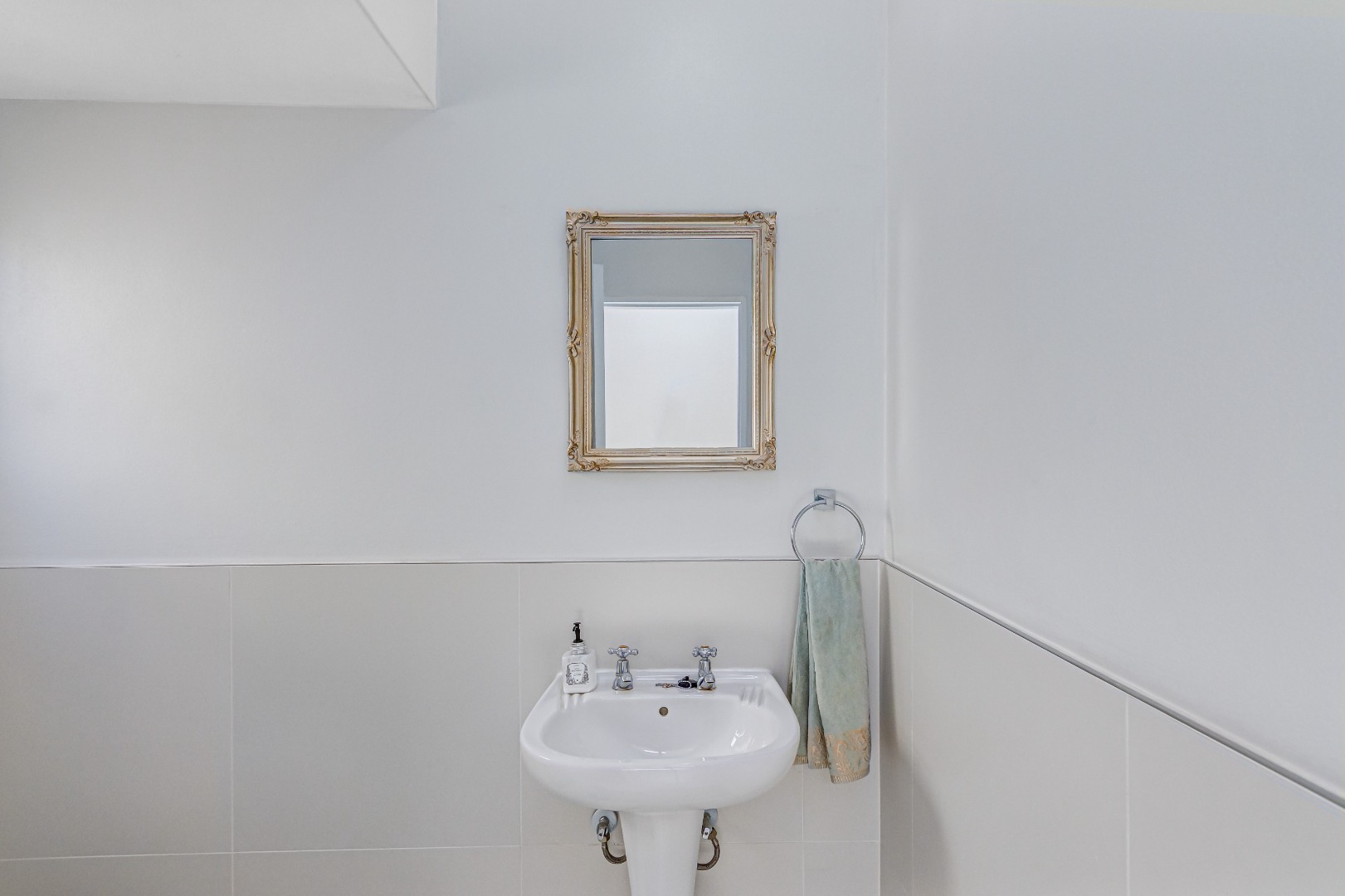 Downstairs, the open-plan living and dining area creates an inviting space perfect for both relaxation and entertaining. A charming fireplace adds character, while large windows and doors fill the home with natural light and open seamlessly onto the garden and patio. The stylishly renovated kitchen provides space for three appliances and leads to a practical laundry area. A convenient guest toilet completes the lower level.
