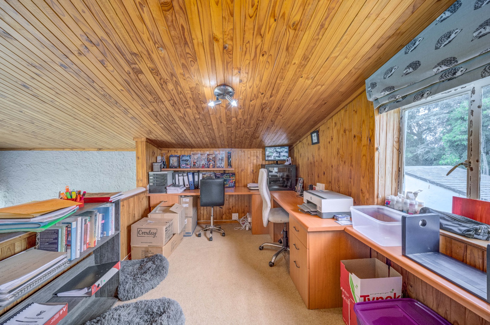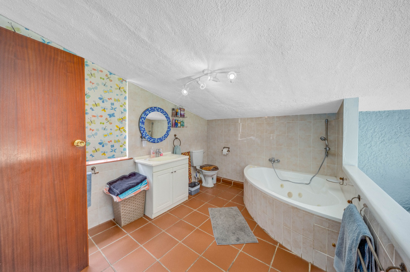 Positioned on approximately an acre of land, the property features four spacious bedrooms and four full bathrooms and a guest toilet, including a main en suite, an extra en-suite in the first bedroom and a detached guest bathroom. Two bedrooms include a unique loft-level design, separating a private en-suite bathroom on one side and a study nook on the other, ideal for work-from-home living.