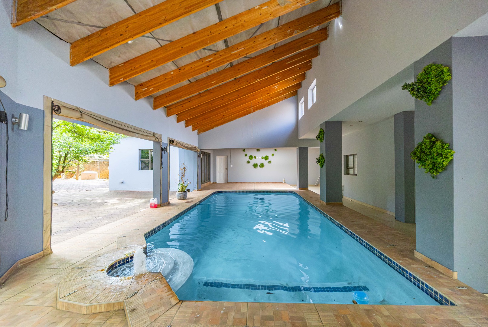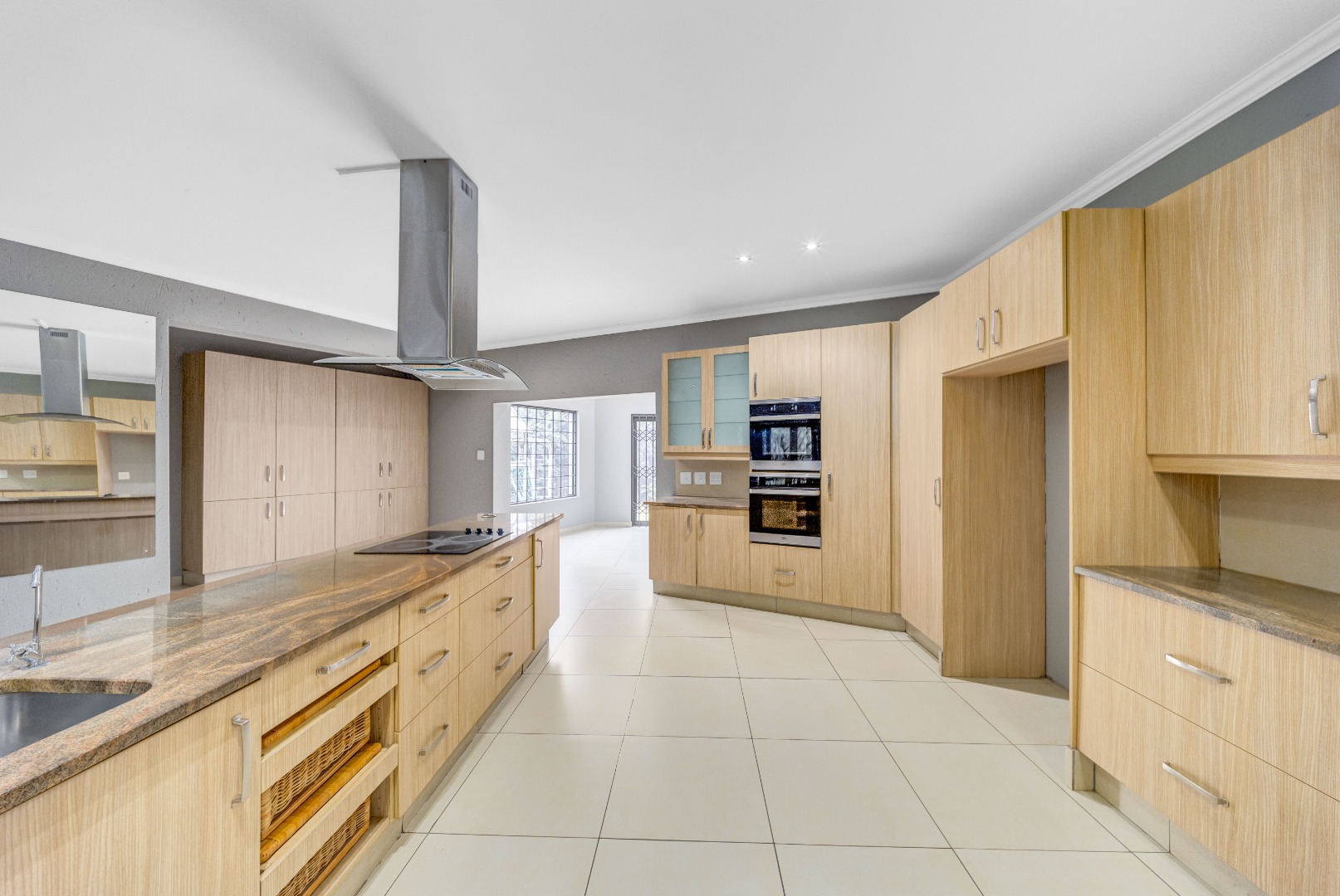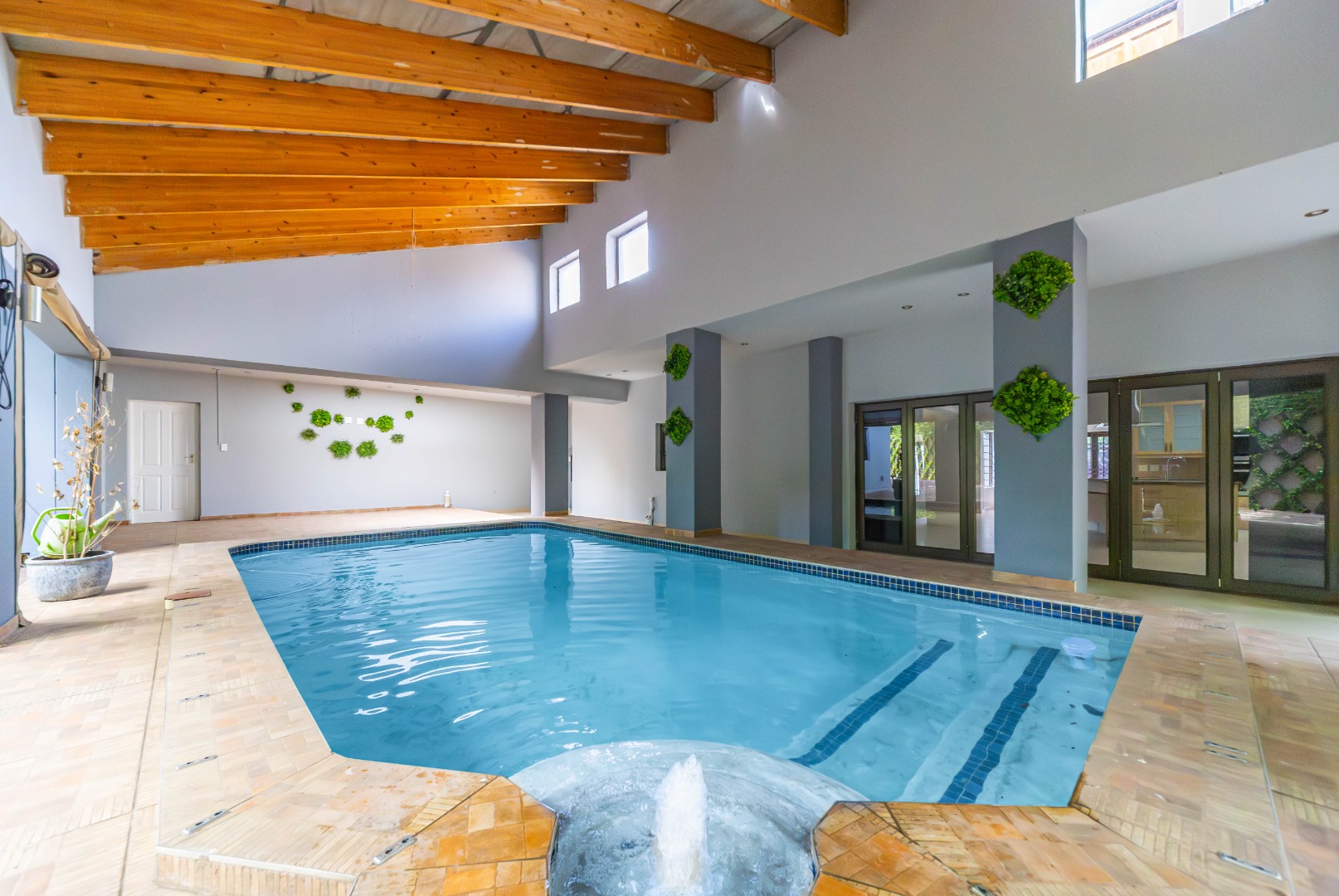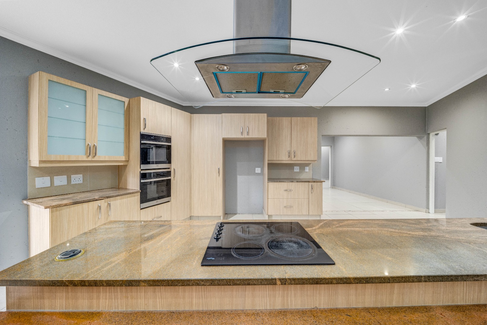 The kitchen is well appointed with ample cabinetry and workspace, complemented by a separate scullery. It opens onto a covered pool and pool house area, complete with a built-in braai and outbuilding bathroom, creating a superb year-round entertainment space overlooking the pool.