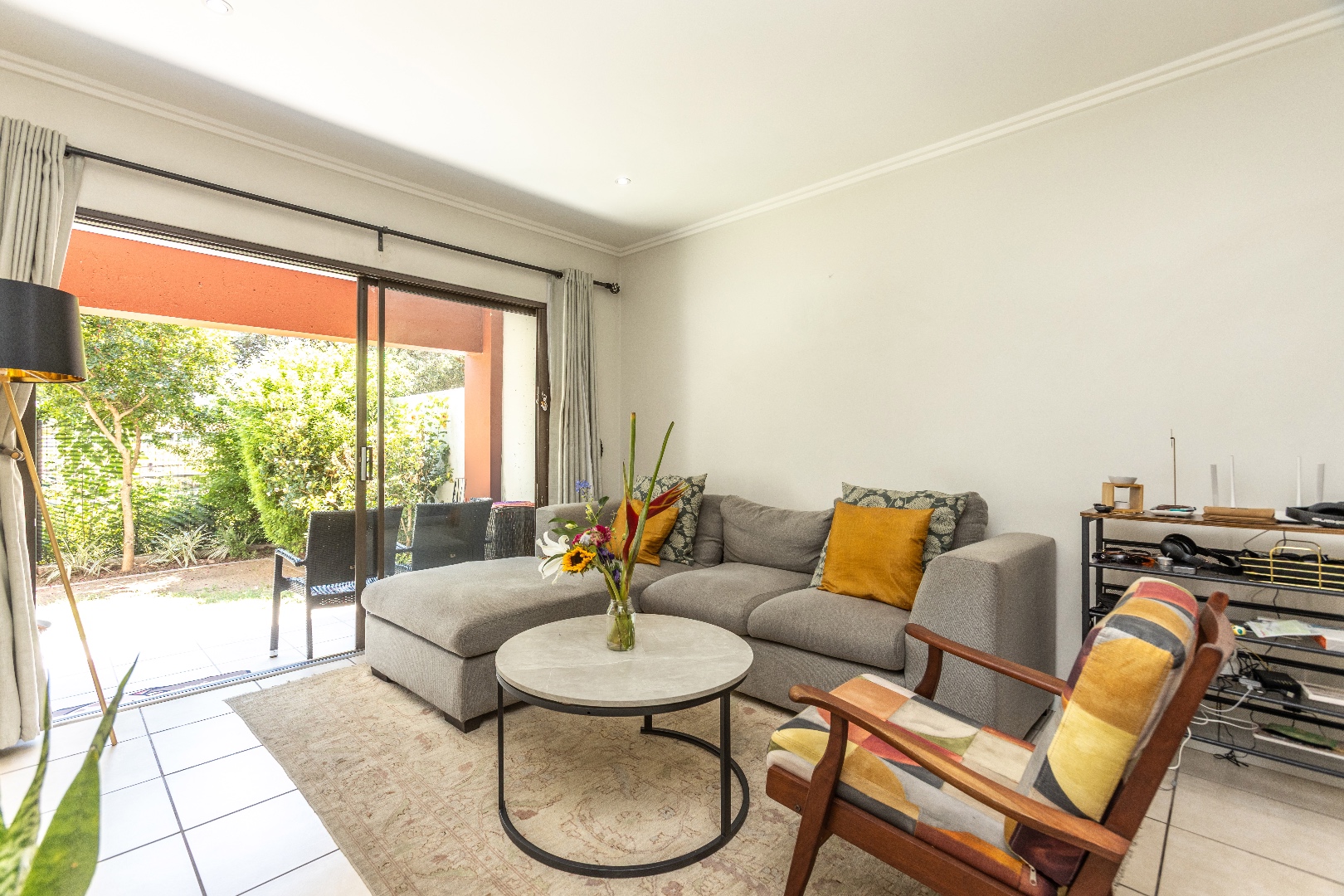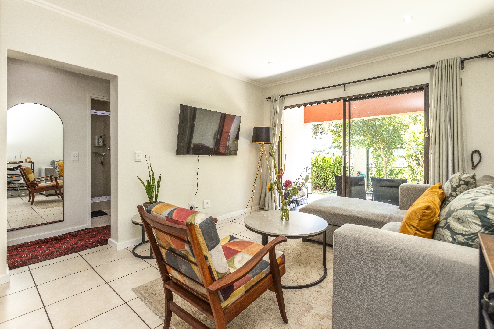 The bright living room opens onto a covered patio overlooking a lush, private garden — perfect for relaxing or entertaining. The garden is pet friendly for up to two small pets.