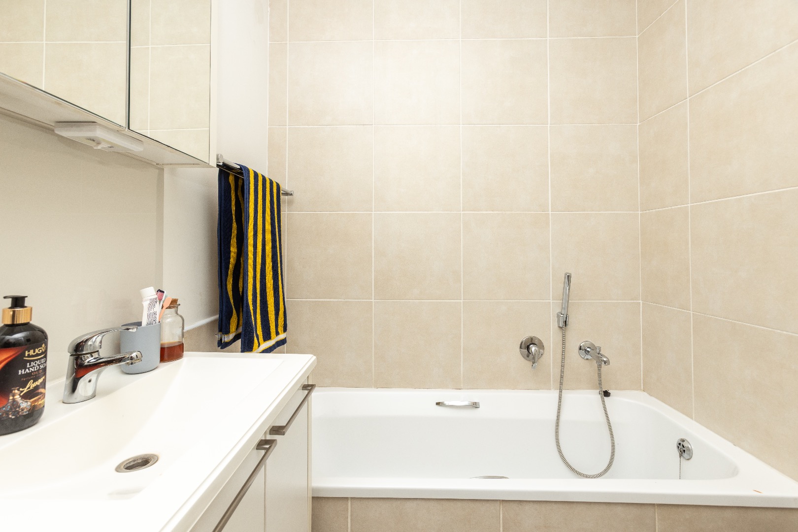 The apartment features two tiled bedrooms and one full bathroom, providing comfortable and low-maintenance living.