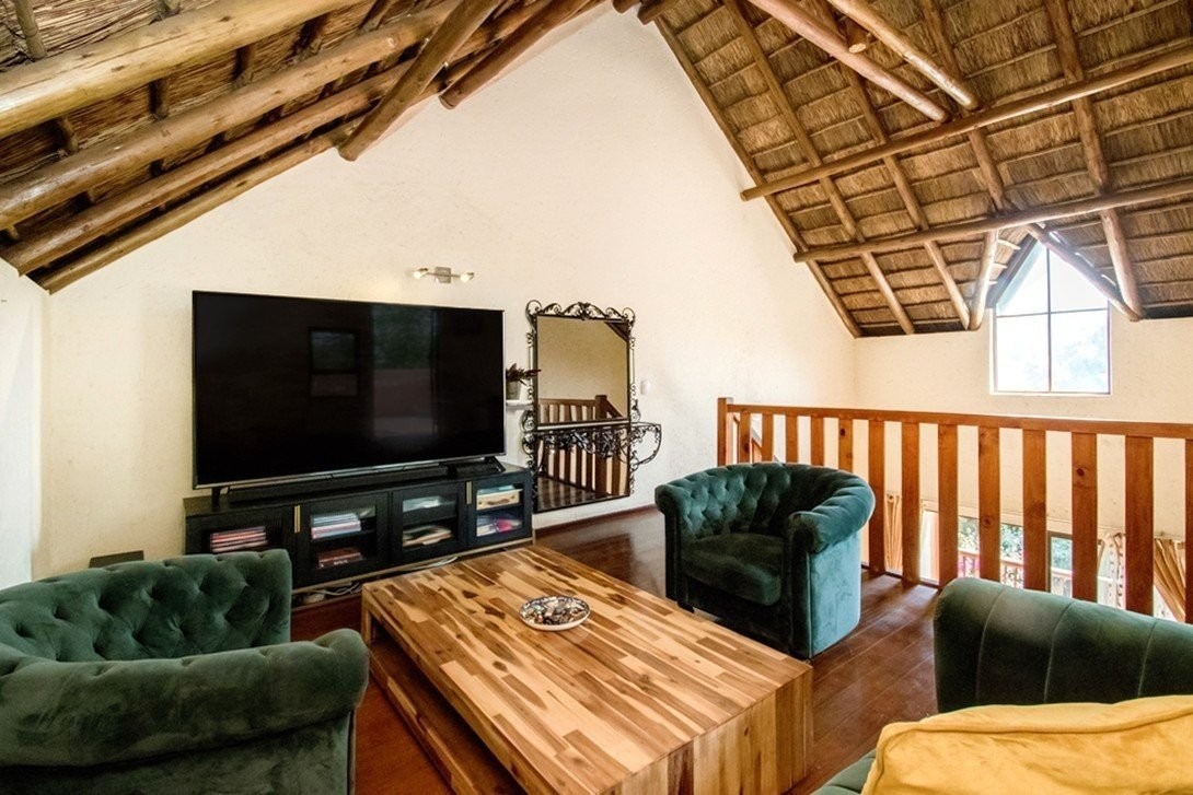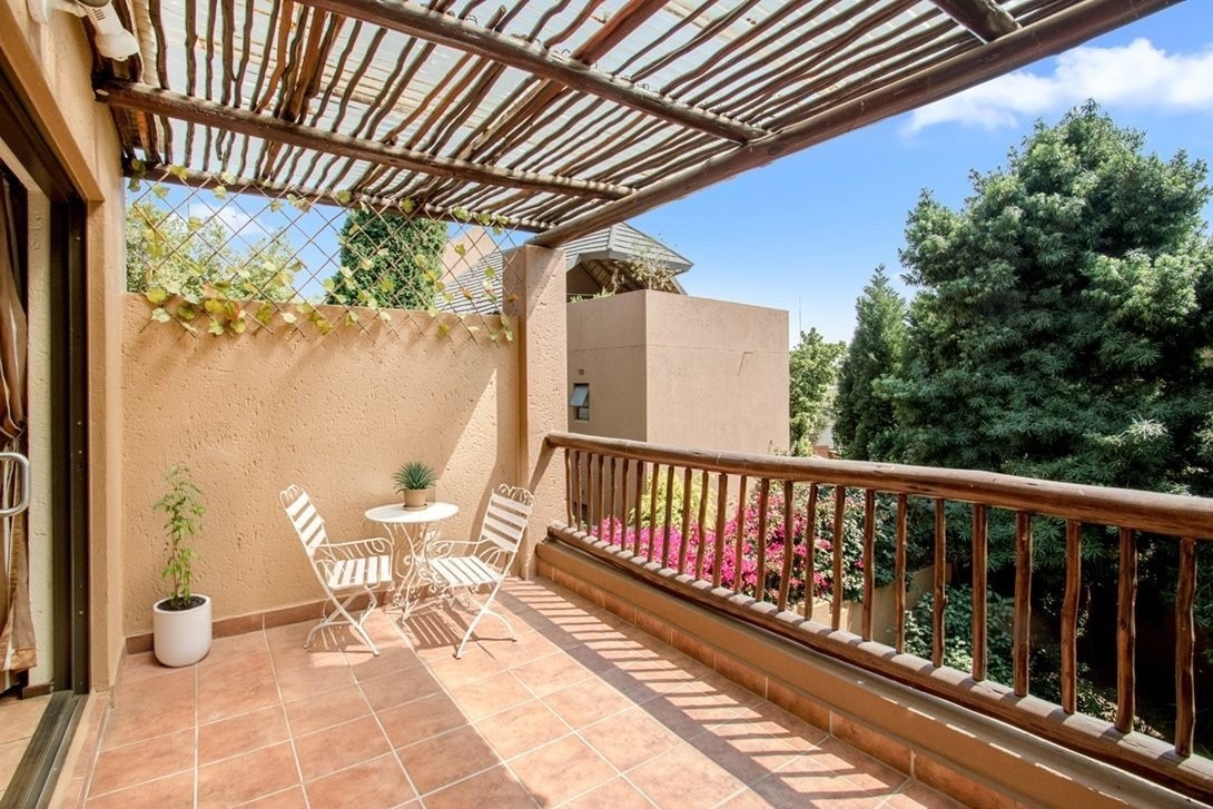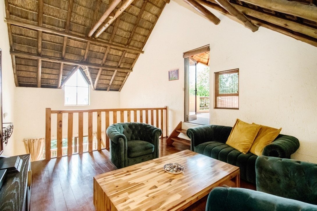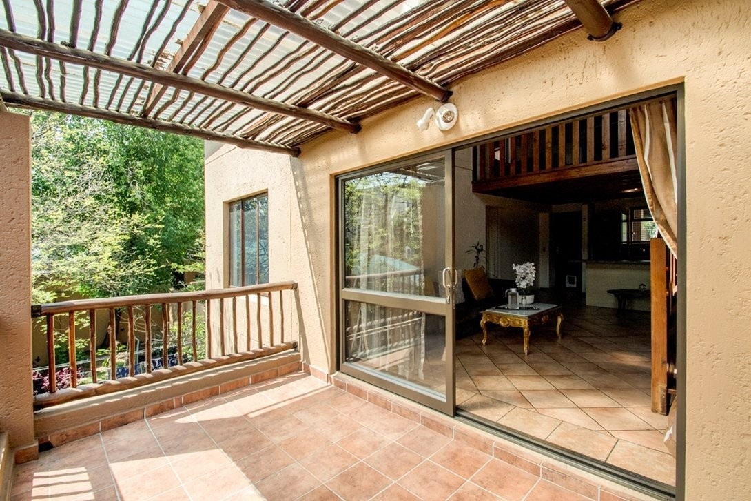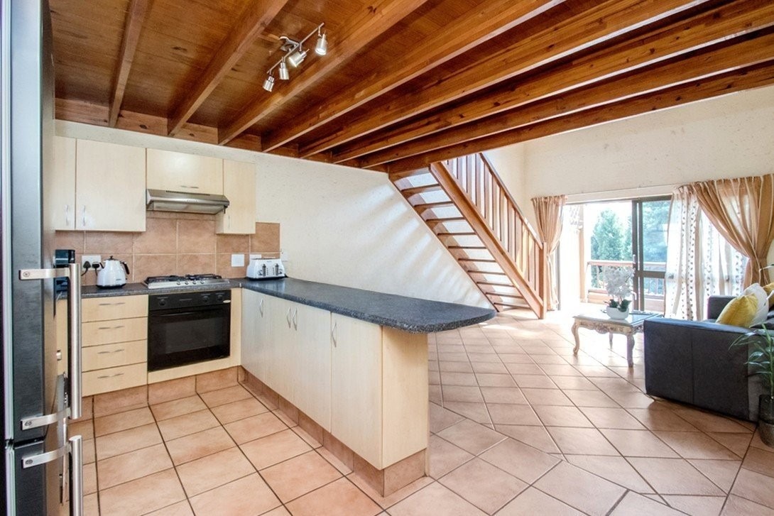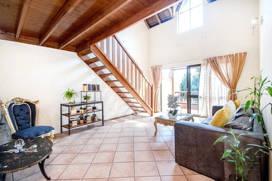 This three bedroom, two bathroom townhouse, only one storey up, is located in Chobe Sands secure lifestyle estate, Douglasdale, which has removed the thatch from its roofs. This unit has retained the thatch on the inside, under the new roof material. The complex has also installed a giant-sized, communal water tank, ensuring that the homes in the complex are