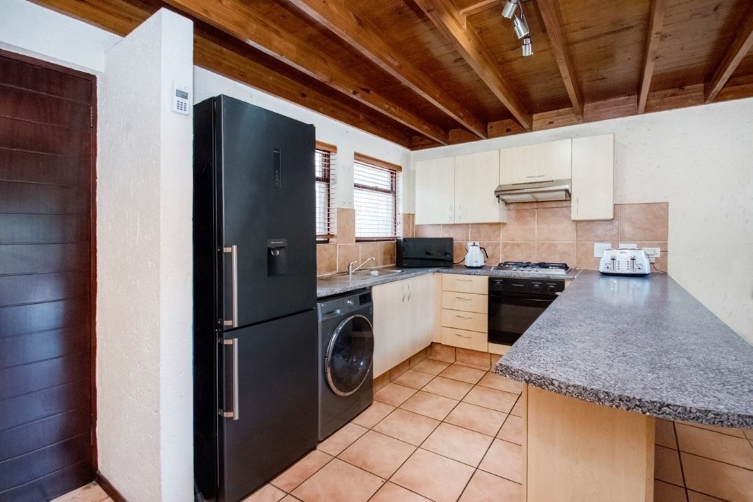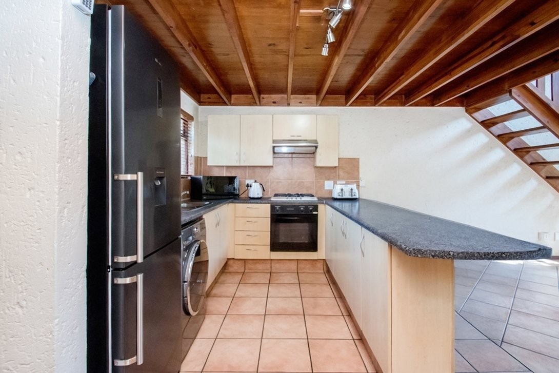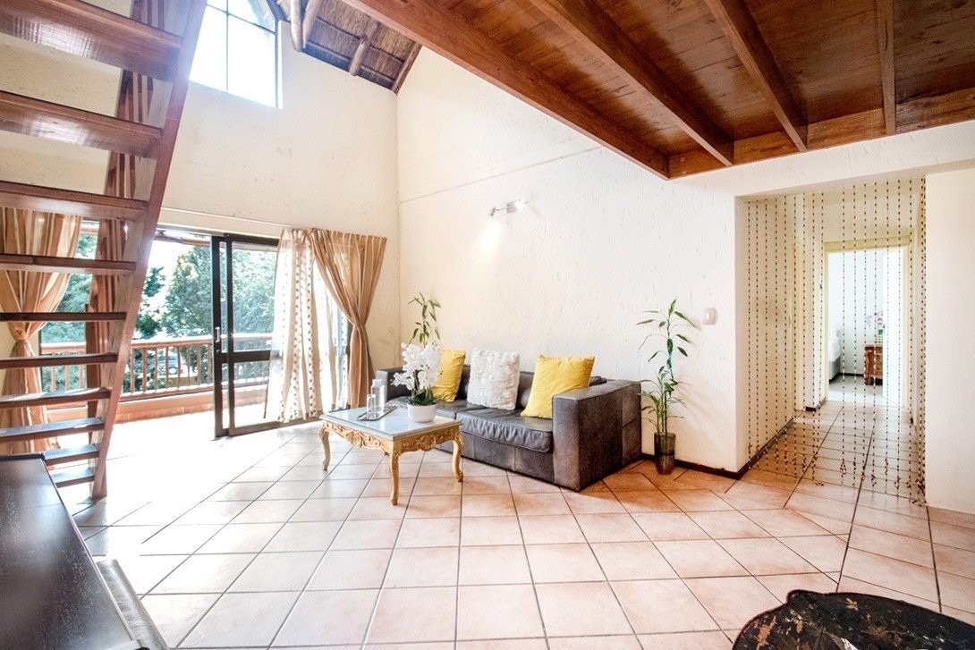 This three bedroom, two bathroom townhouse, only one storey up, is located in Chobe Sands secure lifestyle estate, Douglasdale, which has removed the thatch from its roofs. This unit has retained the thatch on the inside, under the new roof material. The complex has also installed a giant-sized, communal water tank, ensuring that the homes in the complex are