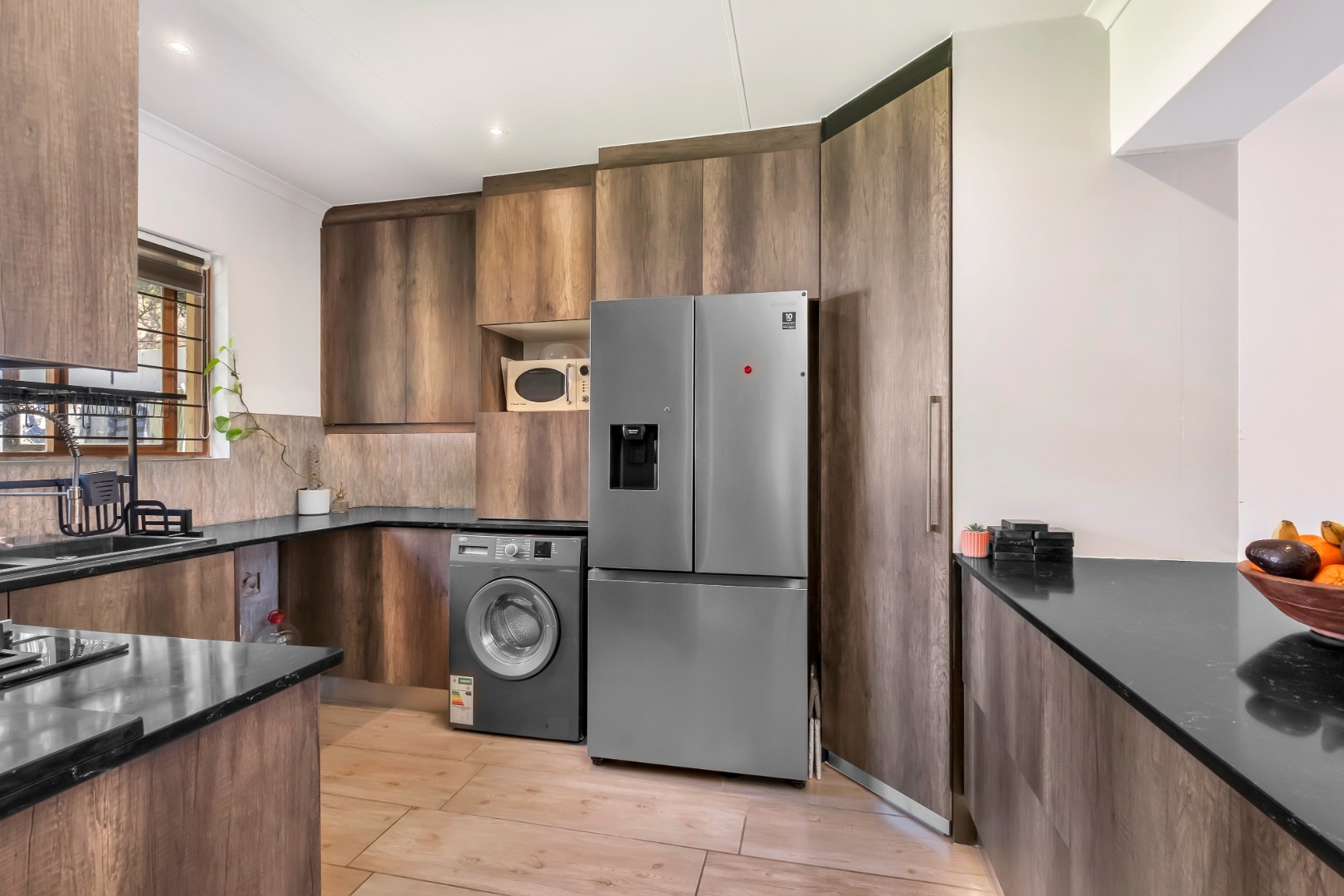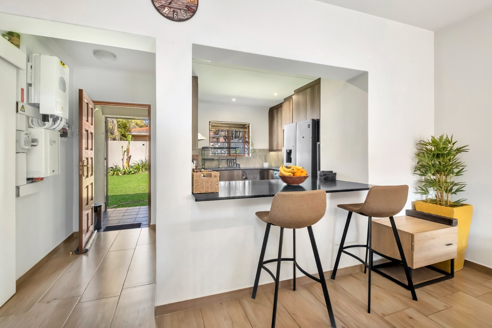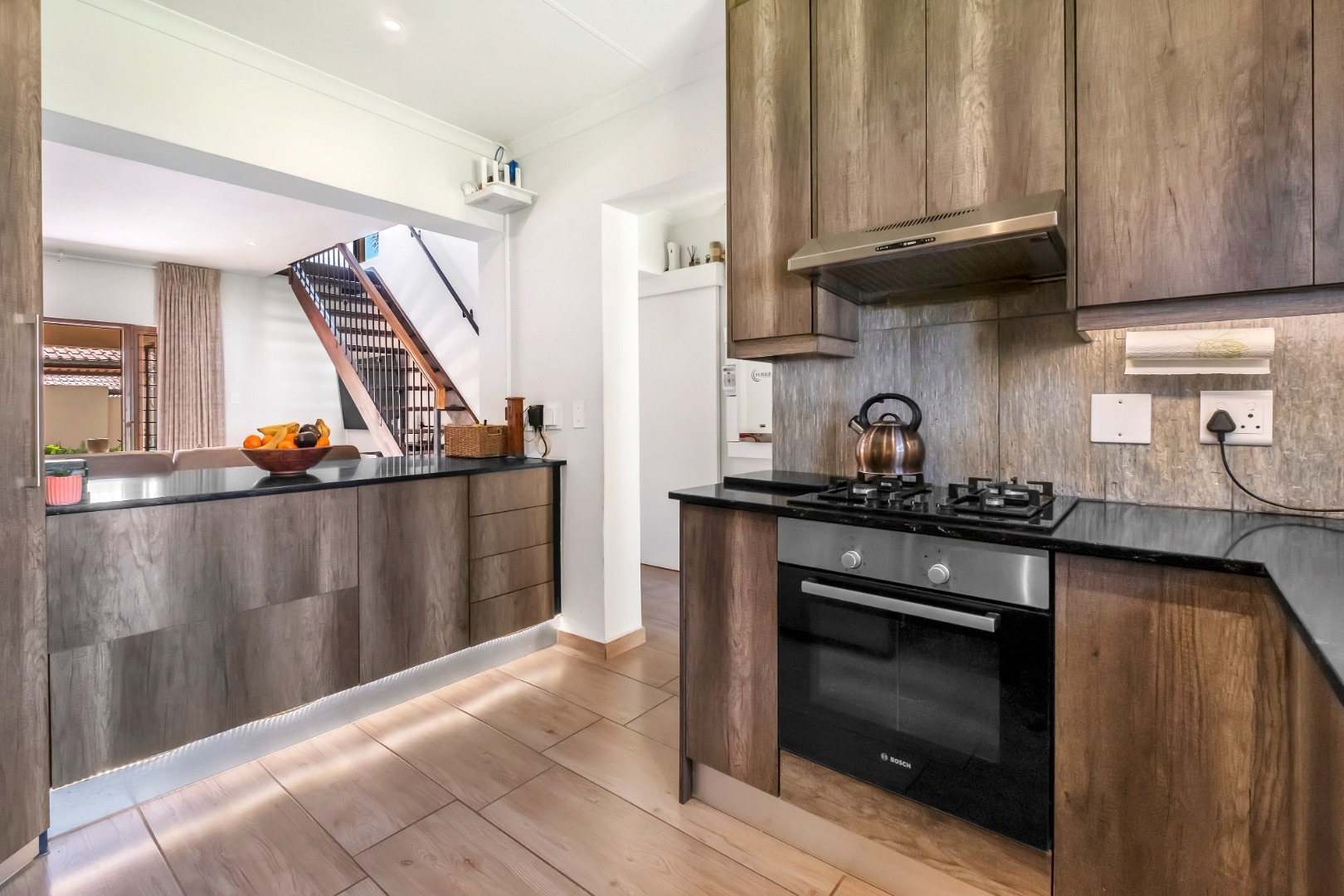 The stylish kitchen is both modern and practical, featuring ample cupboard space including a large pantry cupboard, a double sink, integrated gas stove with electric oven, and space for two under-counter appliances plus a double-door fridge. A serving counter faces the lounge and dining area, while framing a delightful view of the back garden.