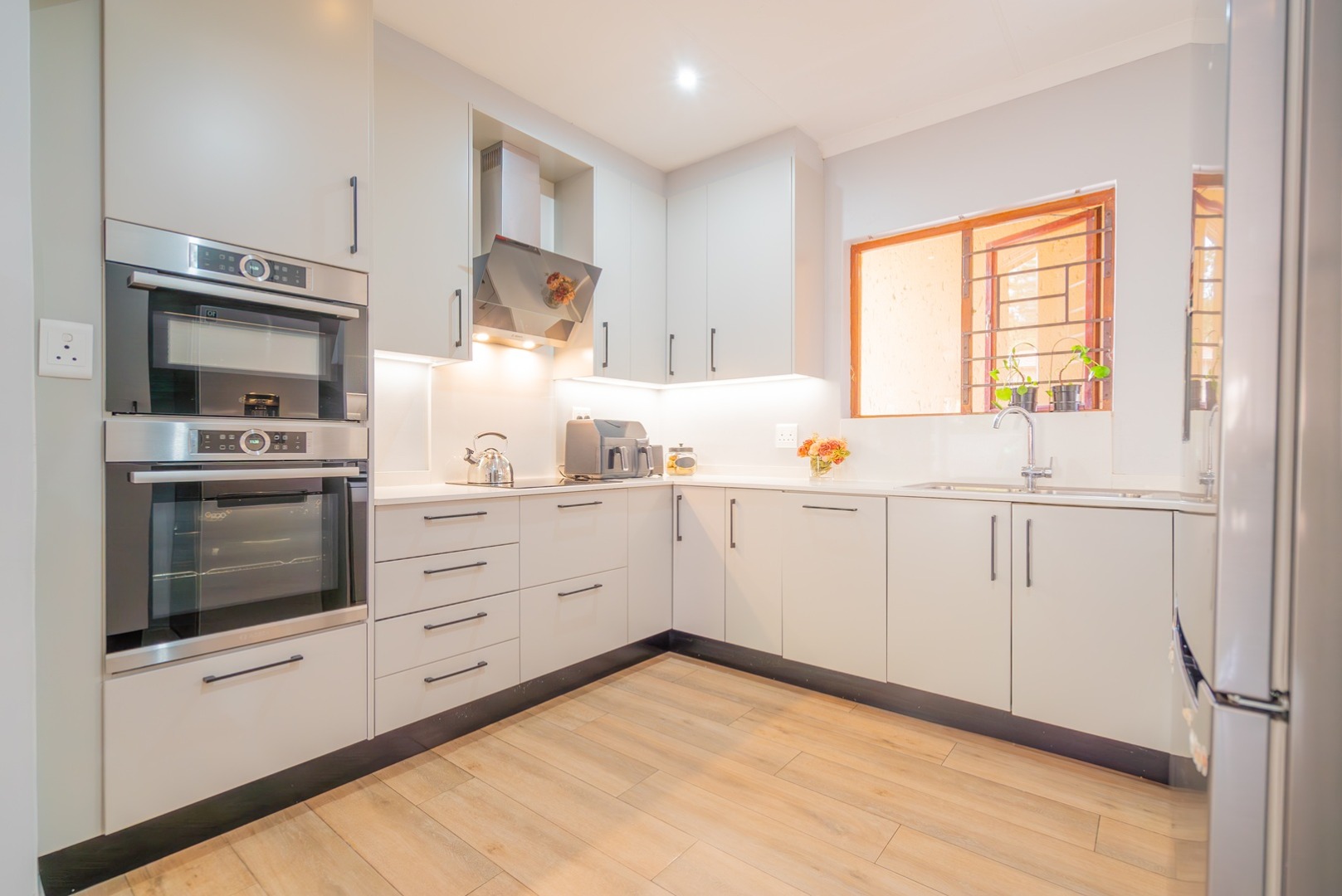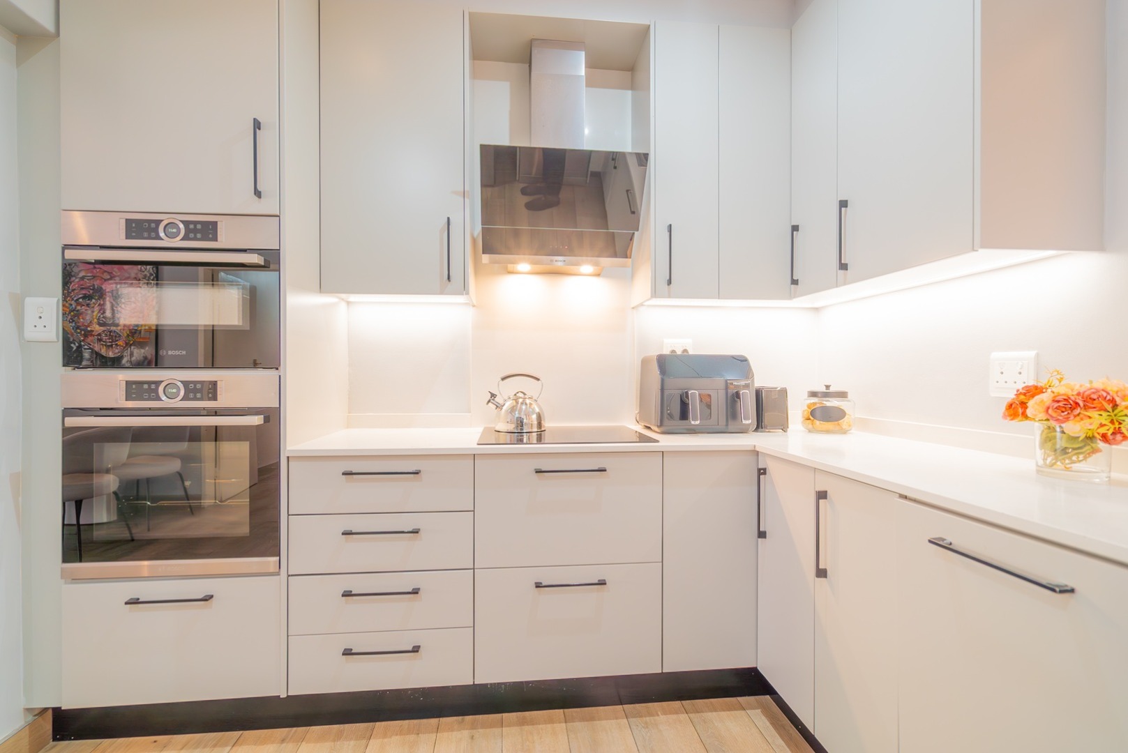 The sleek Caesarstone counters and high gloss white cabinets of the modern open plan kitchen are offset by Bosch double eye-level ovens, electric stove top and modern extractor. There is a double sink and space for a dishwasher and large fridge.