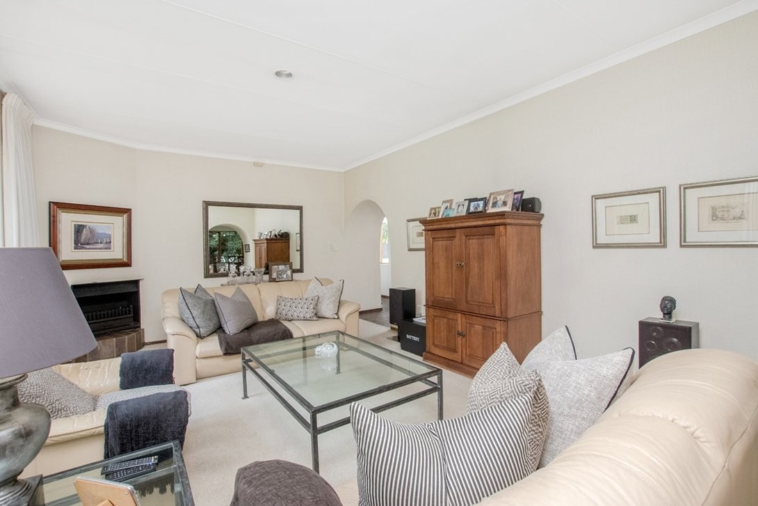 The sunny lounge, with a wood-burning fireplace, and the inter-leading dining room open to the park-like garden and a large covered patio. The bedrooms are a good size, especially the main, which has a full en-suite bathroom. The second bathroom has a tub.