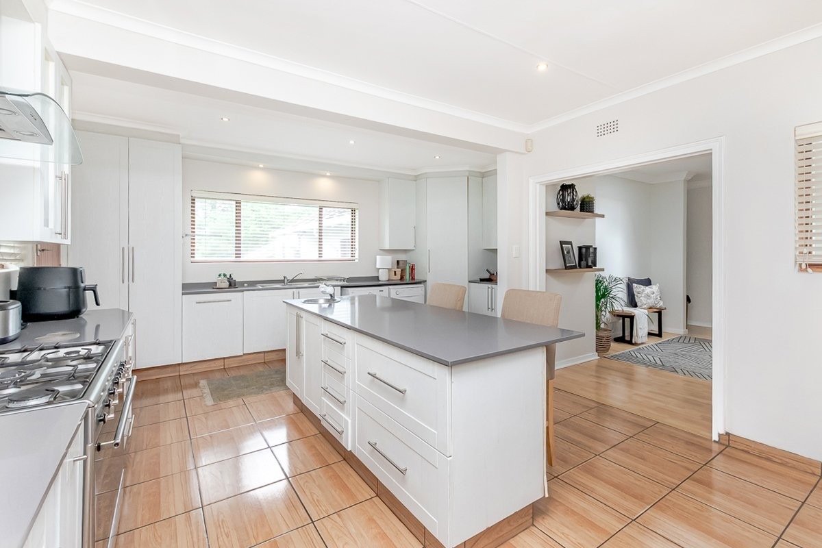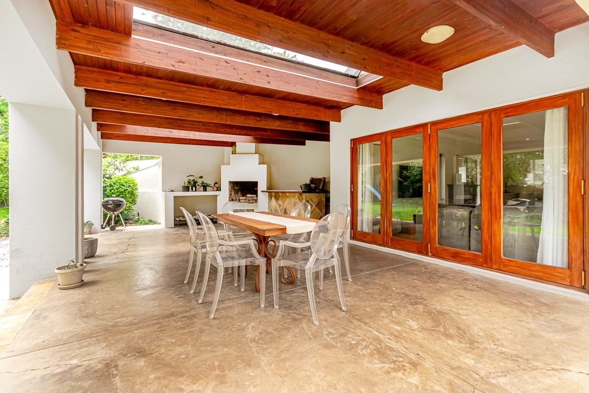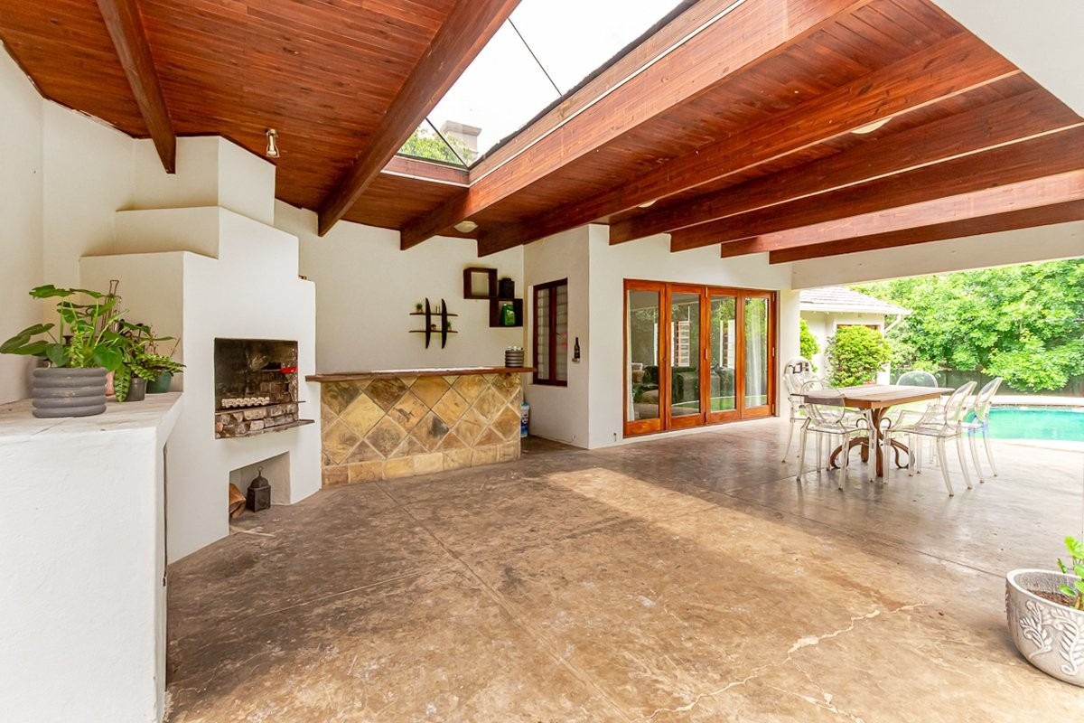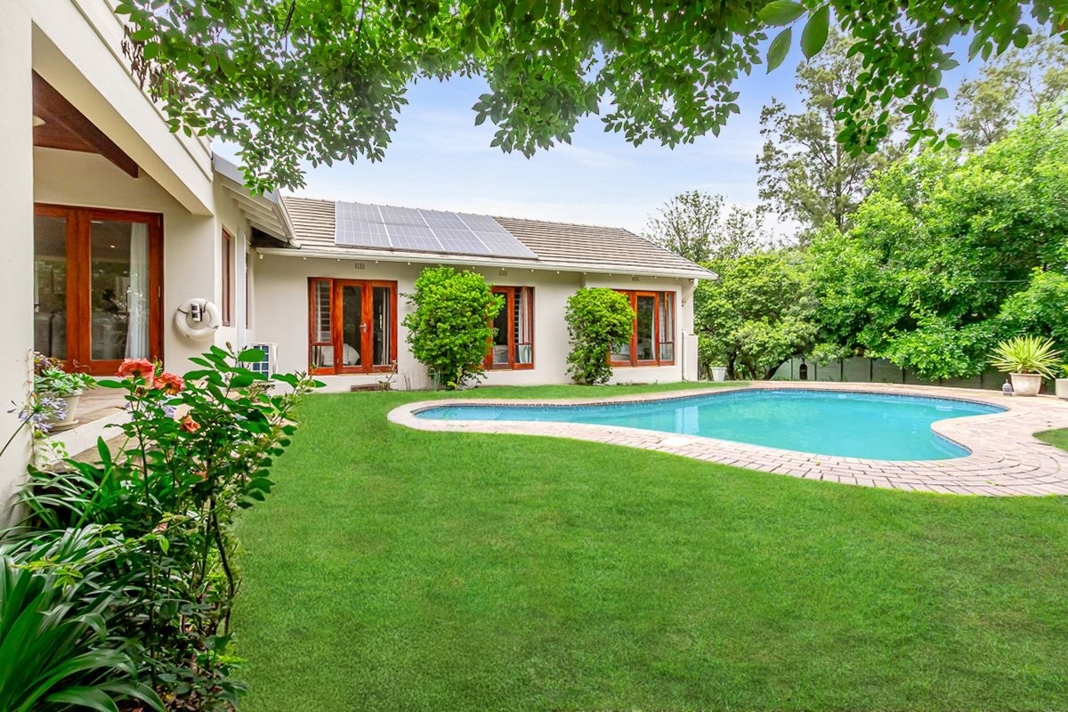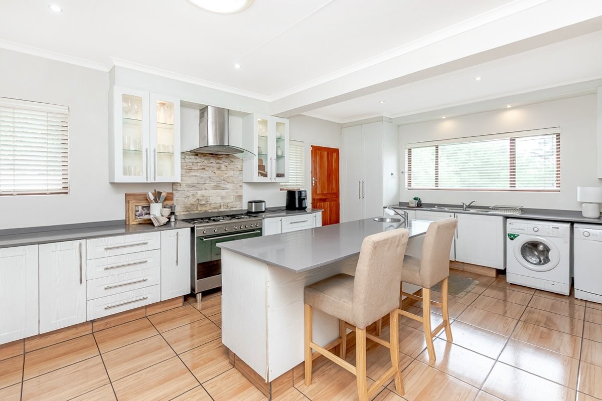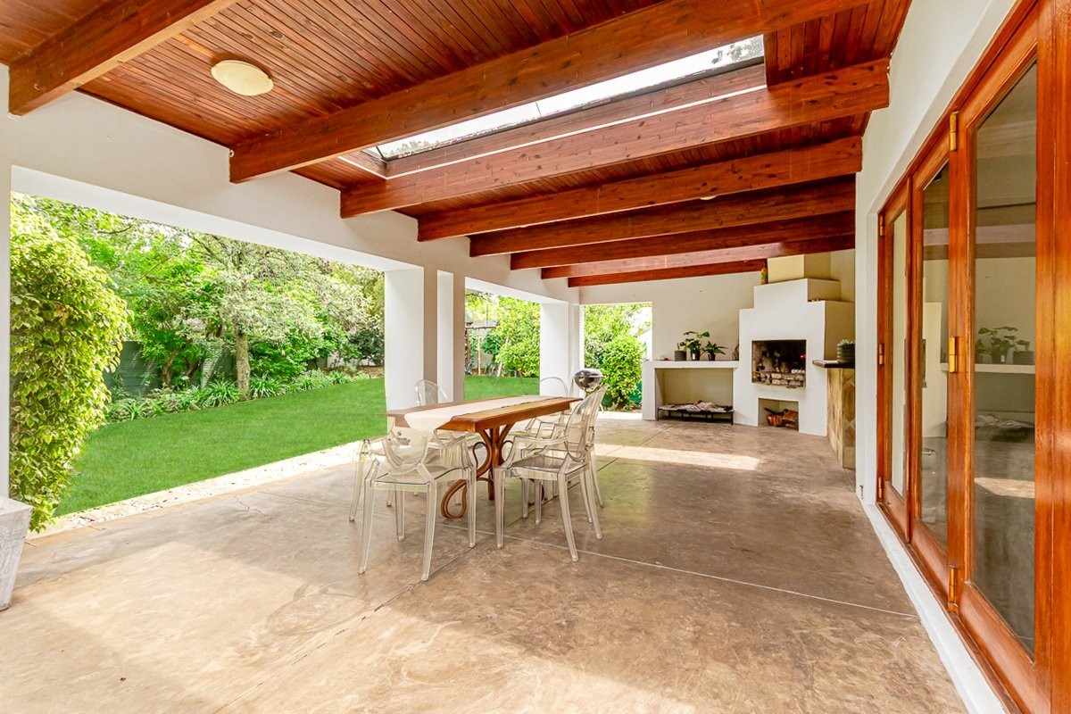 This is a special home full of light, elegant simplicity and character afforded by an open plan layout; a huge and modern kitchen fitted with an island and a SMEG gas hob; wood laminate floors; a fireplace with a mantelpiece in the lounge and stack doors in the extra-length living room that open to the fabulous, covered patio overlooking a manicured garden with a raised swimming pool. Add to this a staff room, an outside W/C, 40 000 litres of tanked water, a solar system with eight panels and a 5 kVA battery, and multiple layers of security, and you have a home to last a lifetime.