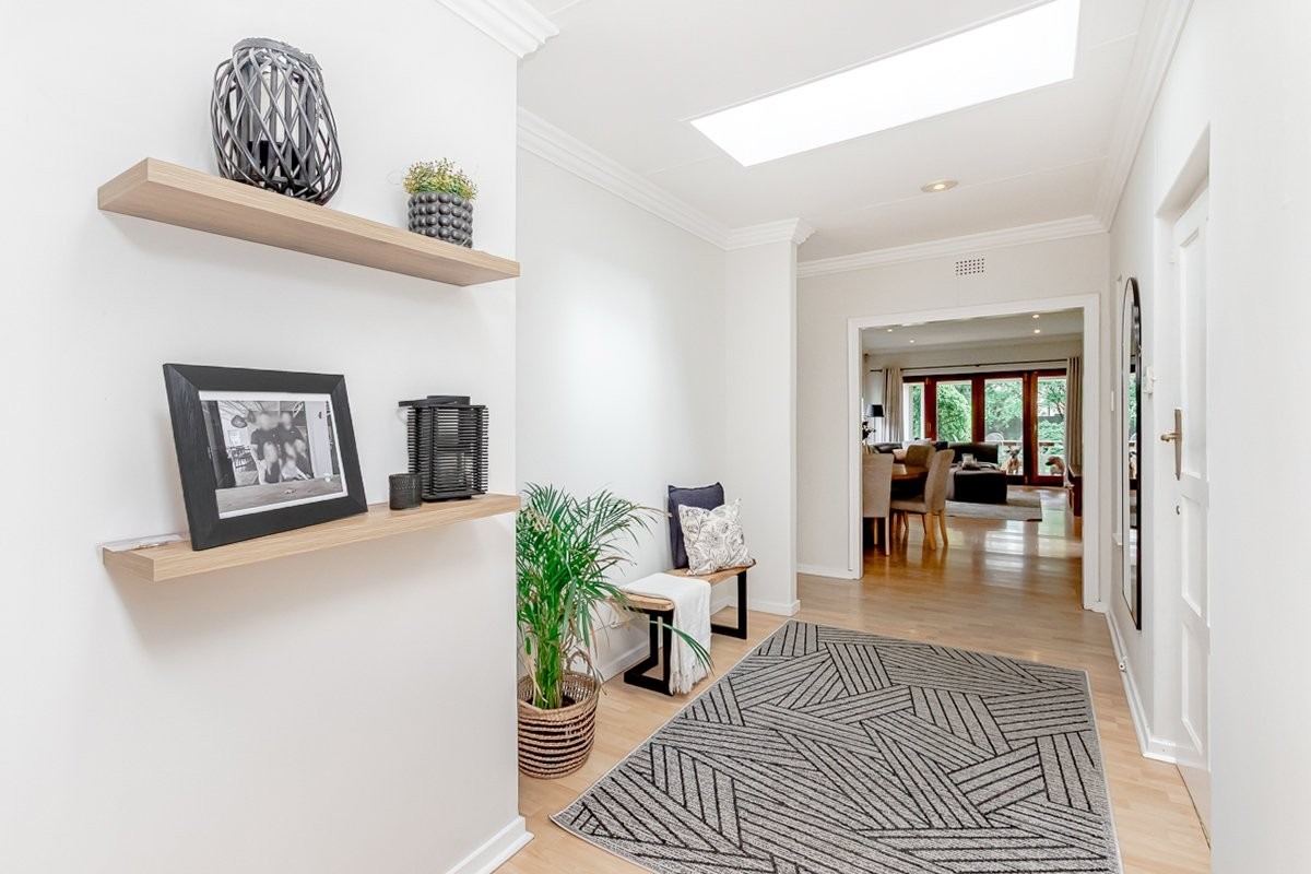 The bright hallway has a skylight, which sets the scene for this modern house. On its left is the squared-up kitchen fitted with many cupboards. On its right is the generous dining room-combined-lounge. The covered patio gives you another large room with its built-in pub and braai, and space for a lounge suite as well as an outdoor dining suite.