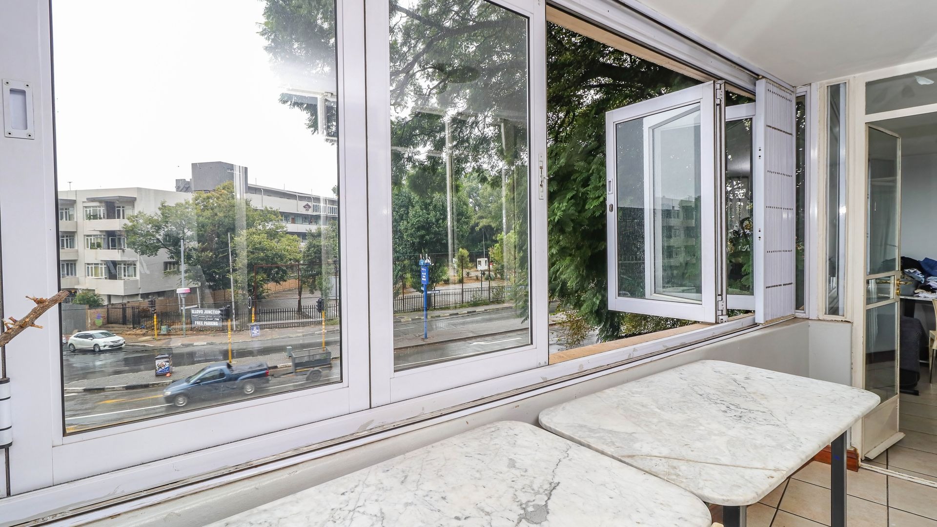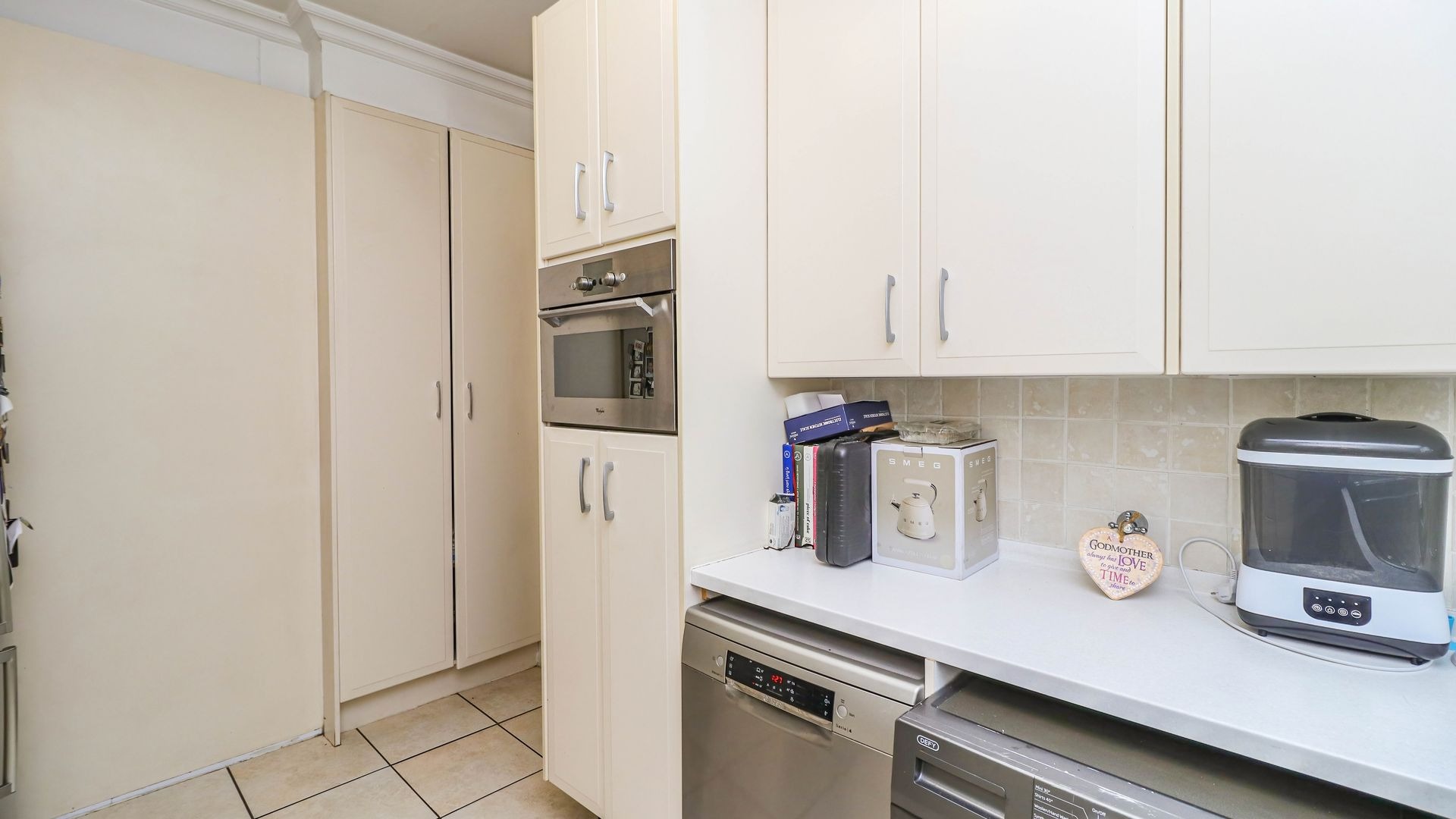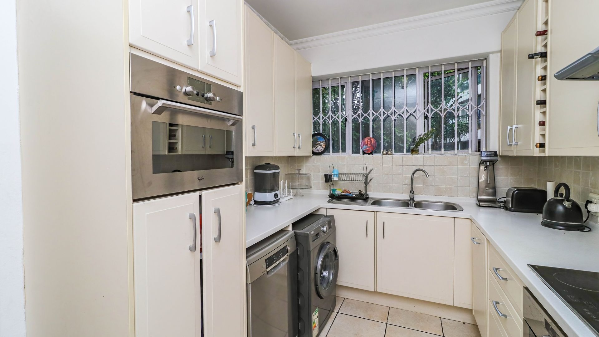 The well-appointed kitchen boasts cream cabinetry, light countertops, and integrated appliances including a built-in hob, oven, extractor fan, microwave and dishwasher connection point and washing machine connection point. It provides ample storage, a double sink, and natural light. Linen cupboard. The property includes a versatile enclosed balcony with wide-opening bi-fold windows, offering active city views and excellent ventilation, secured with a gate.