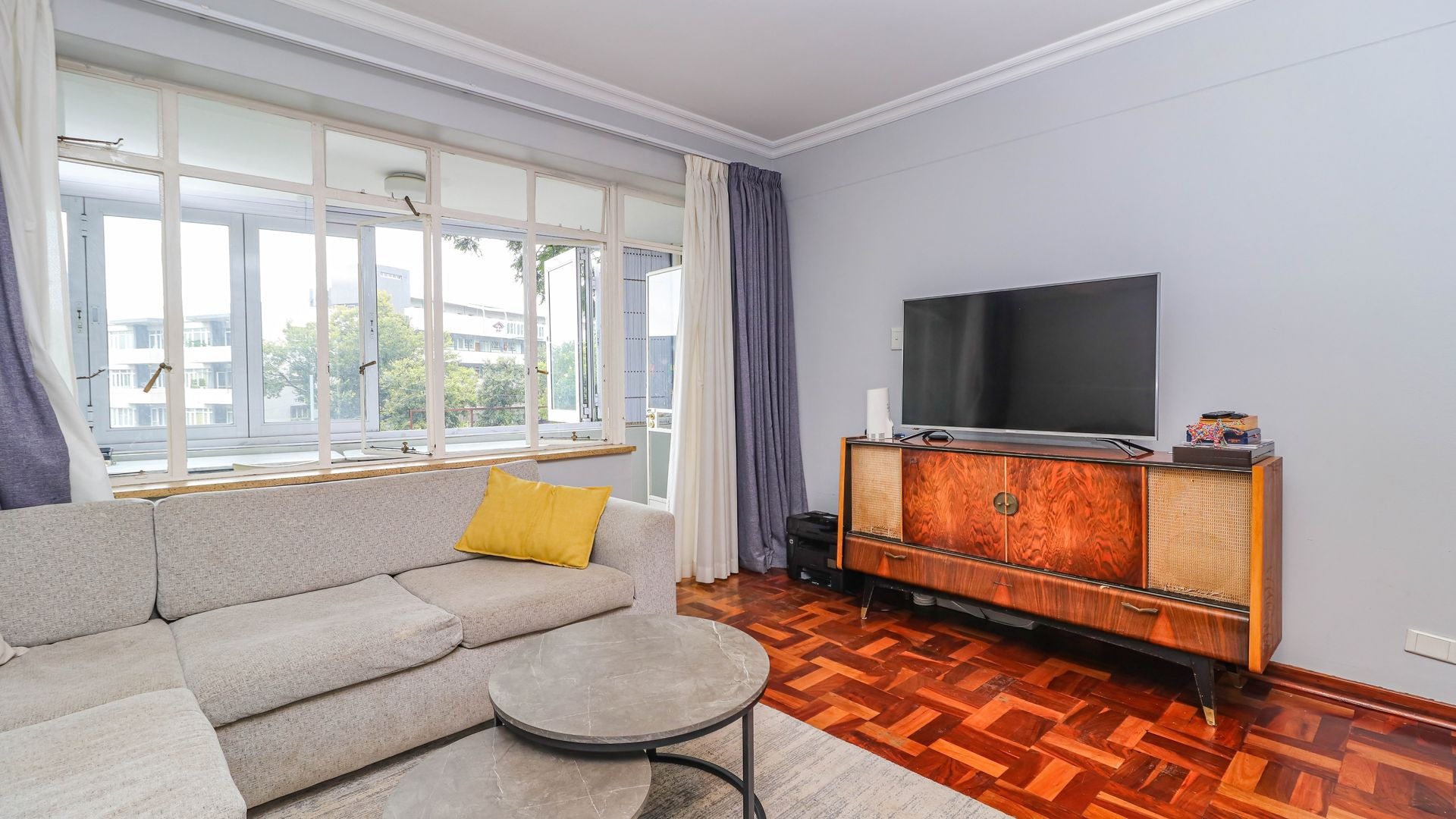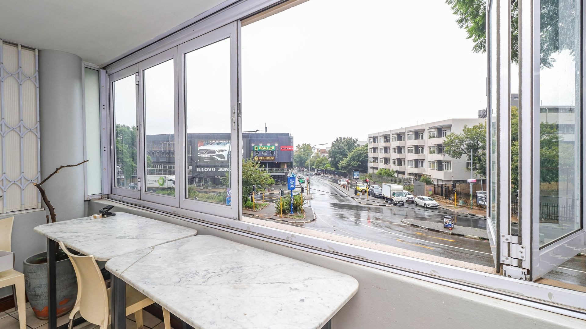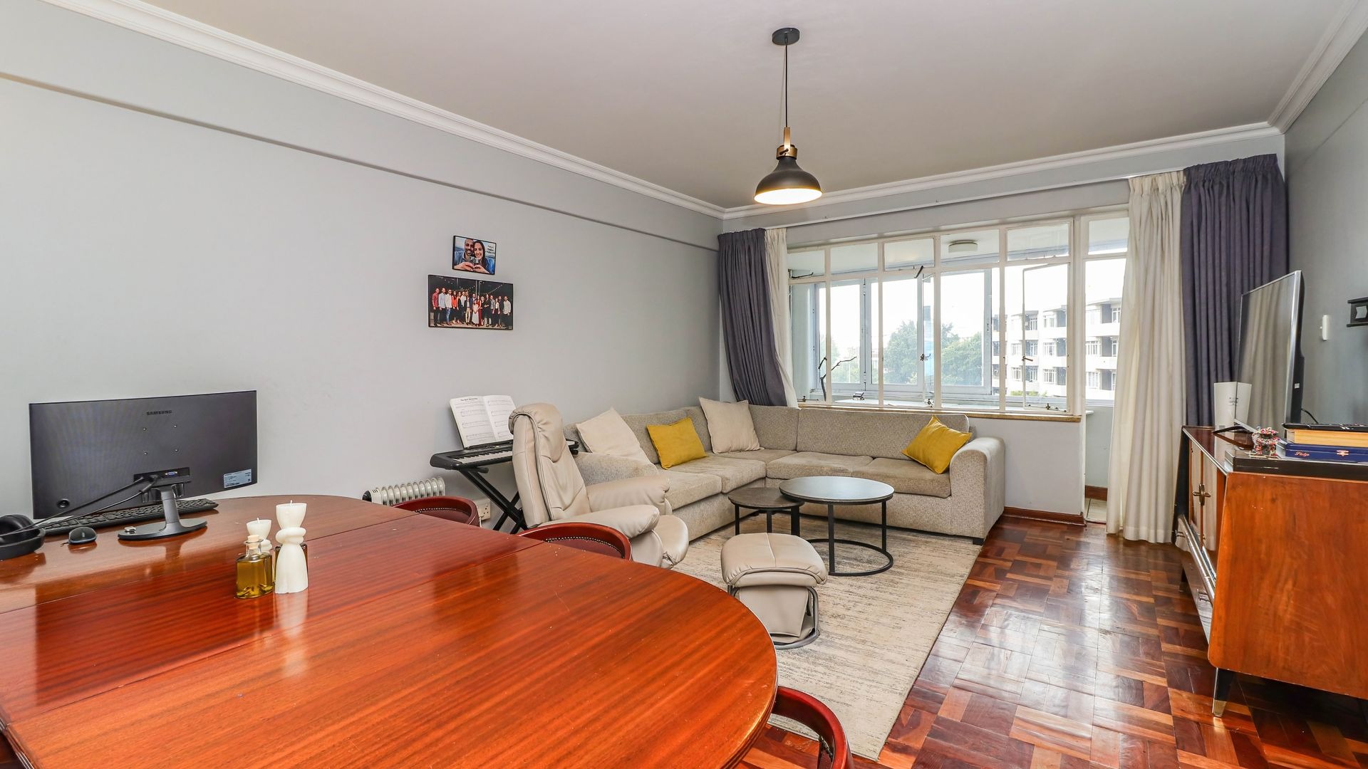 Discover this inviting 103 sqm apartment situated in a secure complex in the vibrant Illovo suburb of Sandton. This residence offers a functional layout designed for comfortable urban living. The spacious open-plan lounge and dining area, illuminated by abundant natural light from large windows, features classic parquet flooring and high ceilings with crown molding, creating an elegant and airy atmosphere. A modern pendant light fixture adds a contemporary touch. Modern stackable windows open up the enclosed patio. Possibility of expanding lounge into patio.