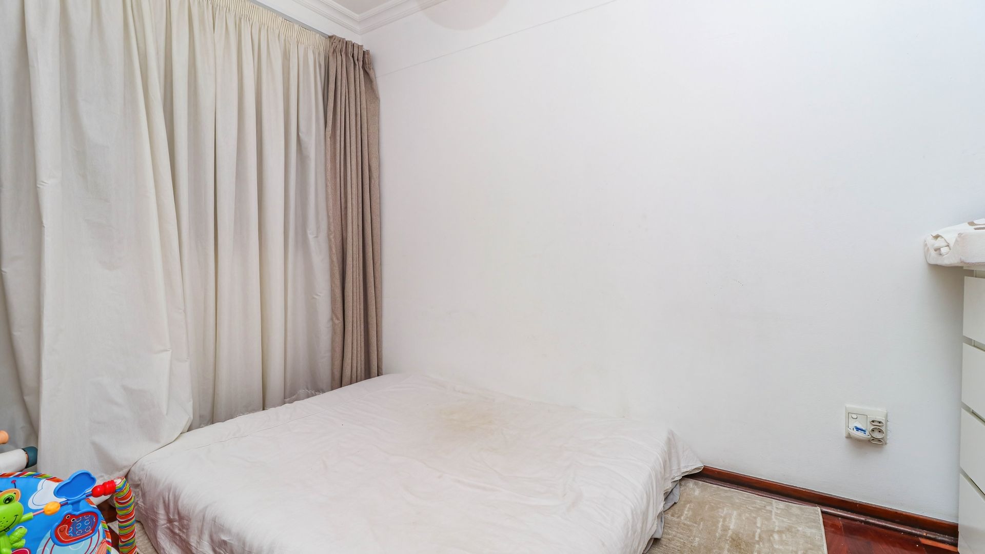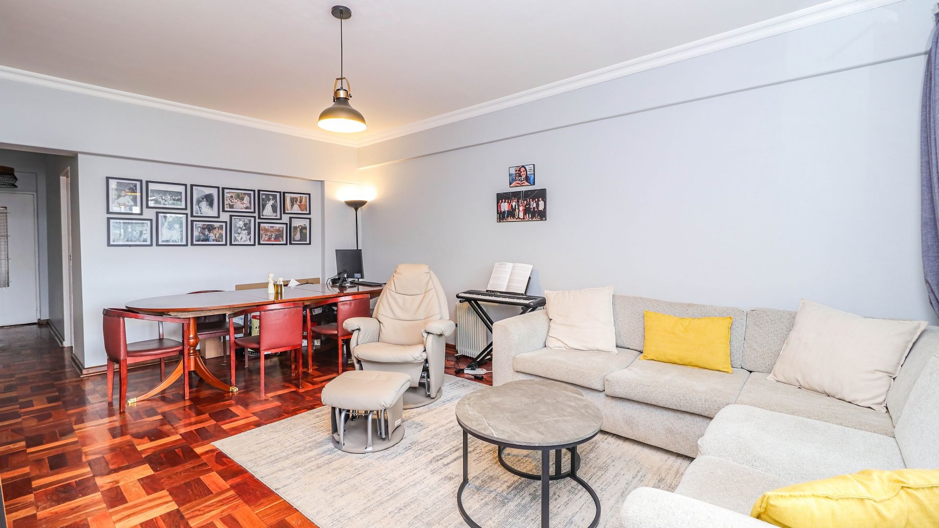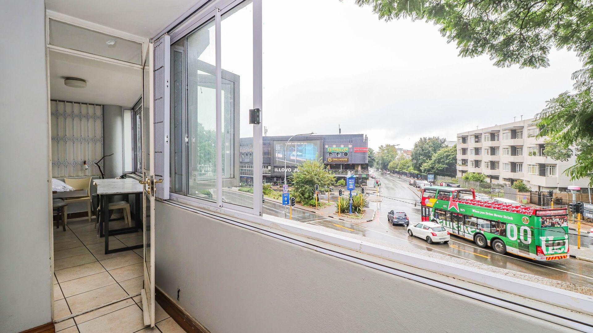 Discover this inviting 103 sqm apartment situated in a secure complex in the vibrant Illovo suburb of Sandton. This residence offers a functional layout designed for comfortable urban living. The spacious open-plan lounge and dining area, illuminated by abundant natural light from large windows, features classic parquet flooring and high ceilings with crown molding, creating an elegant and airy atmosphere. A modern pendant light fixture adds a contemporary touch. Modern stackable windows open up the enclosed patio. Possibility of expanding lounge into patio.