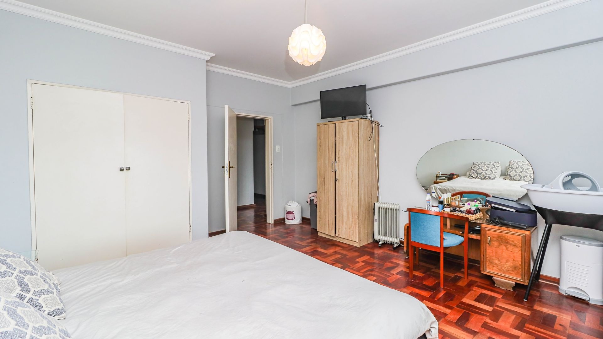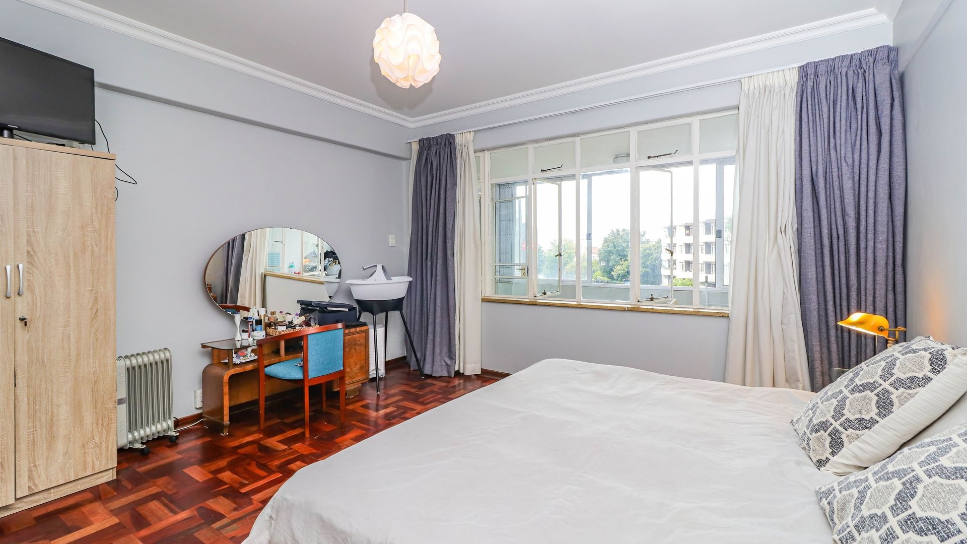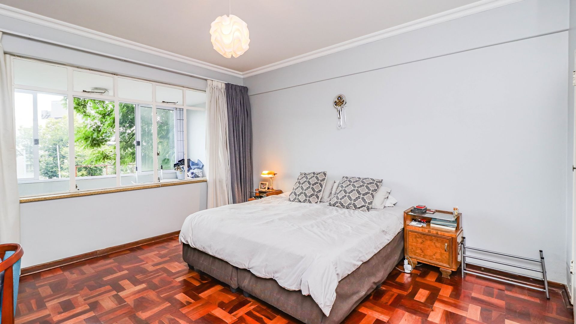 Accommodation comprises two comfortable bedrooms, both featuring charming parquet flooring, natural light, and main has built-in wardrobe, ensuring practical storage solutions. Possibility of expanding maiin bedroom onto extended enclosed patio. A single well-maintained bathroom with shower serves the apartment. The building itself presents a classic aesthetic with mature landscaping and a fenced garden, enhancing its kerb appeal.