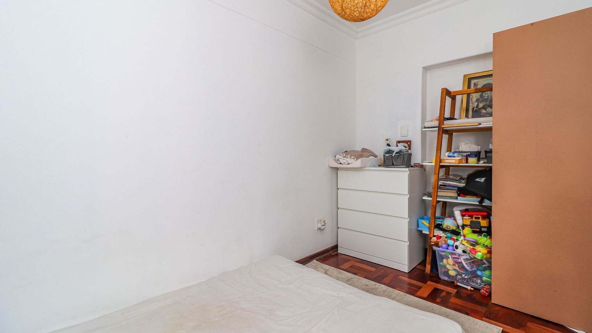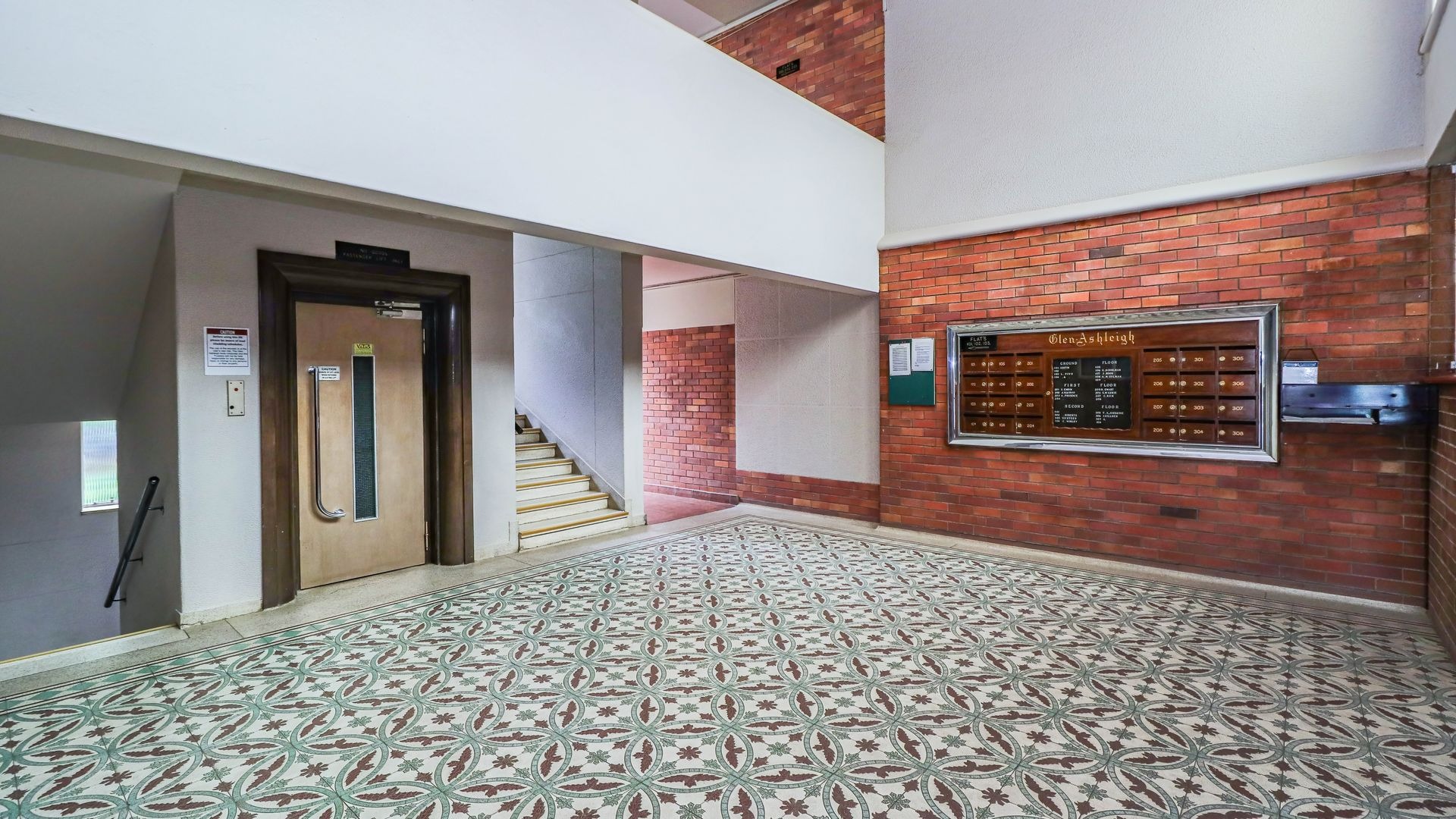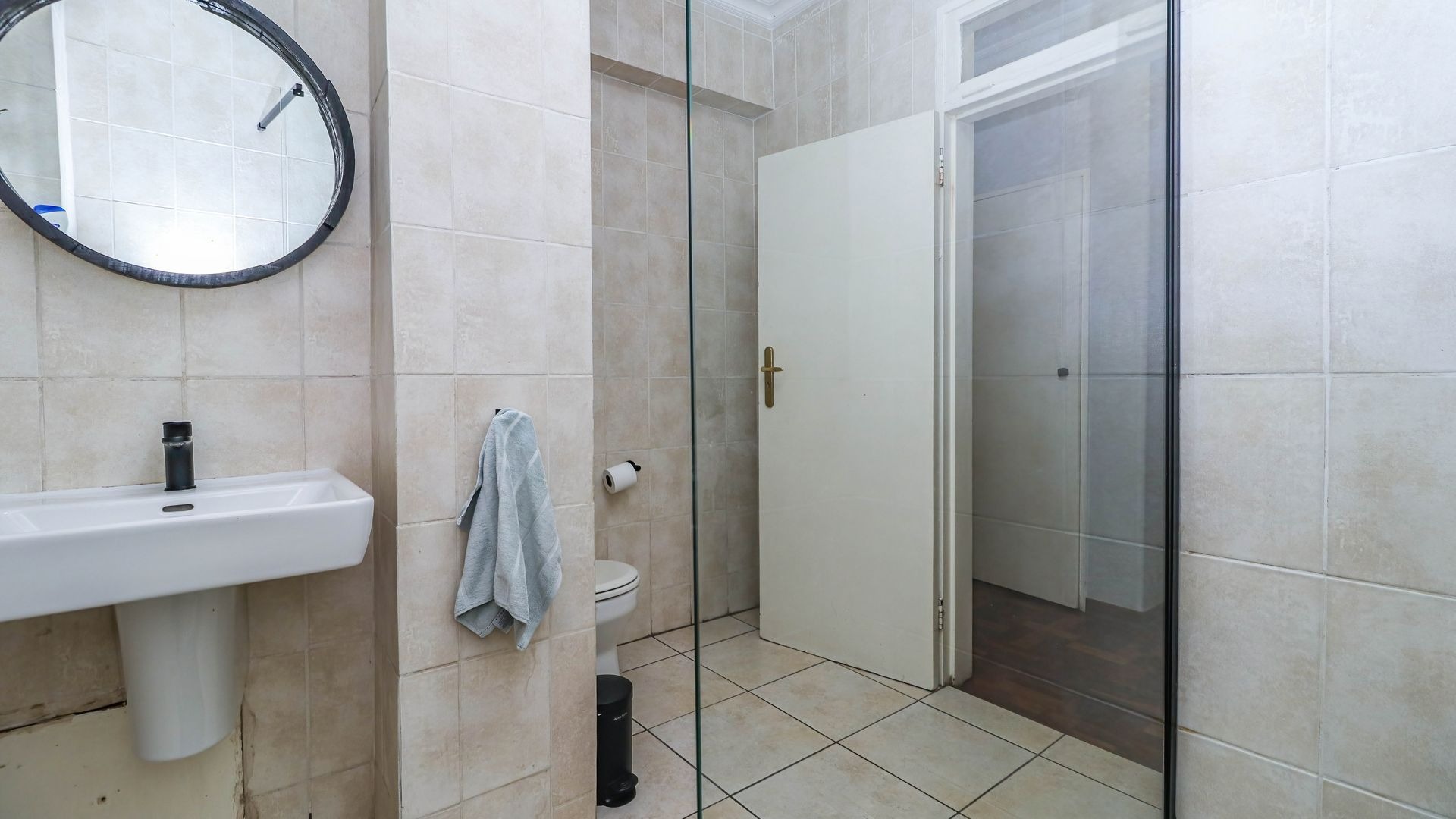 Accommodation comprises two comfortable bedrooms, both featuring charming parquet flooring, natural light, and main has built-in wardrobe, ensuring practical storage solutions. Possibility of expanding maiin bedroom onto extended enclosed patio. A single well-maintained bathroom with shower serves the apartment. The building itself presents a classic aesthetic with mature landscaping and a fenced garden, enhancing its kerb appeal.