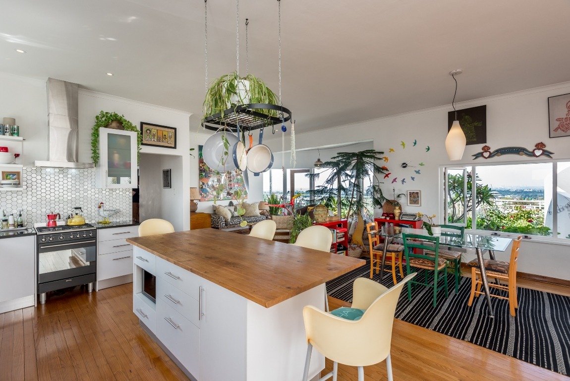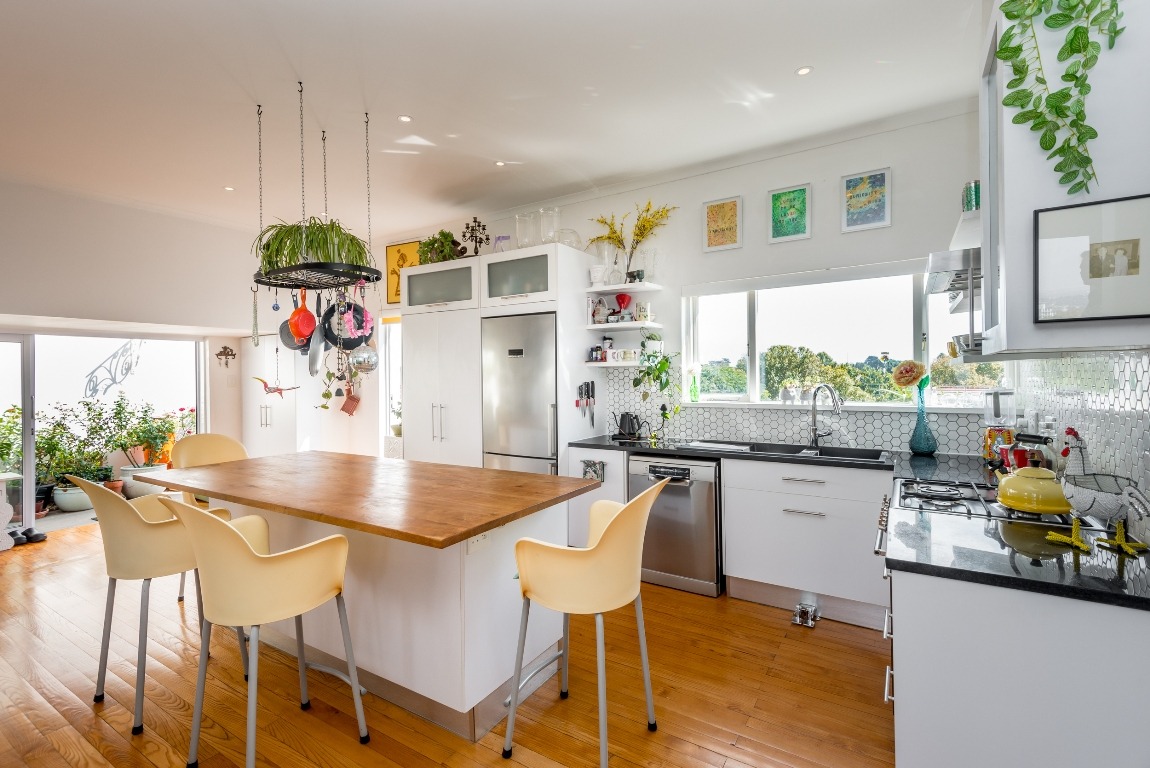 The living area is comprised of a large and welcoming lounge and dining area served by a modern open plan kitchen with sociable wood topped centre island, fresh white cabinets, granite counters, gas hob and electric oven, modern double sink with delightful foot-pedal faucet and space for two appliances plus a single-door fridge.