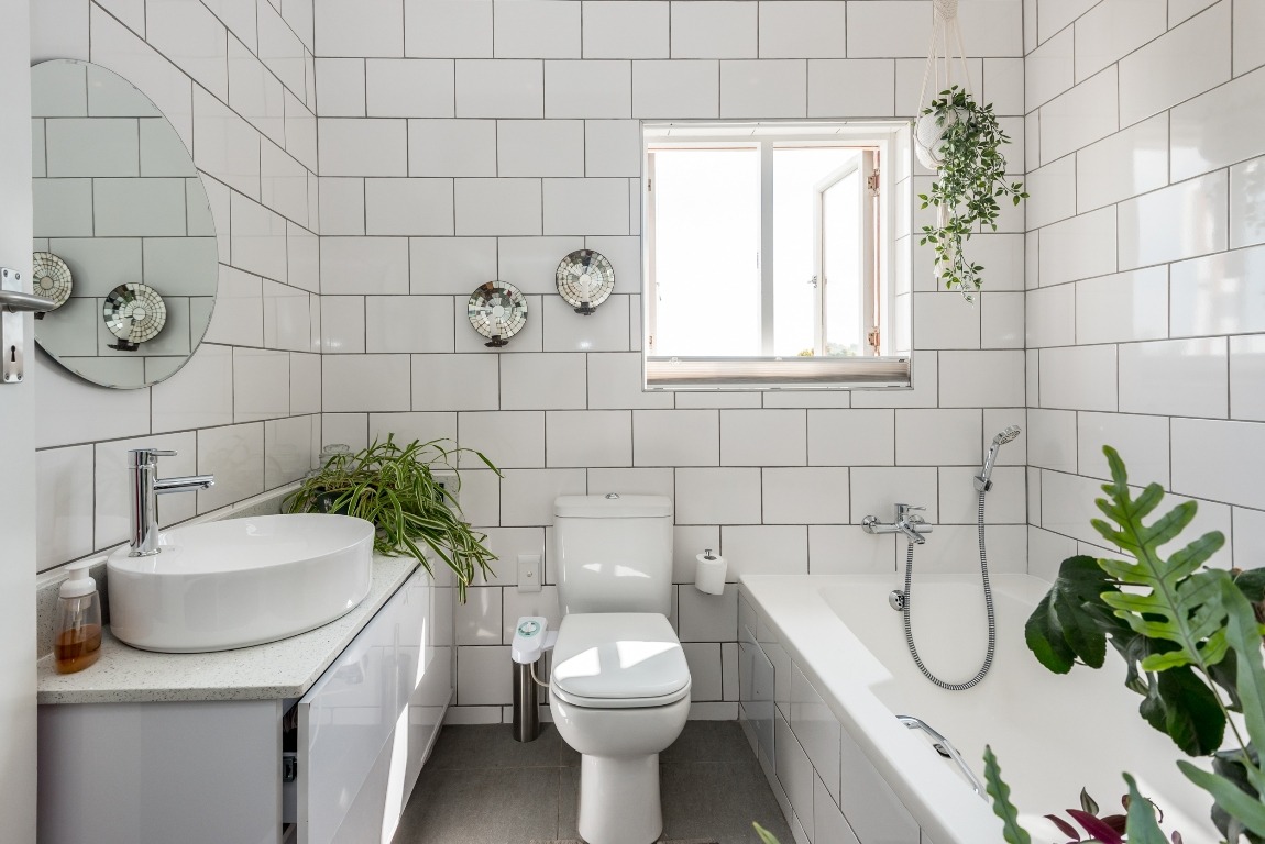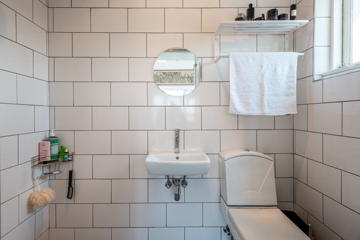 The main bathroom is tiled to the ceiling with bright porcelain tiles. It enjoys a bathtub with hand shower and a bidet toilet.