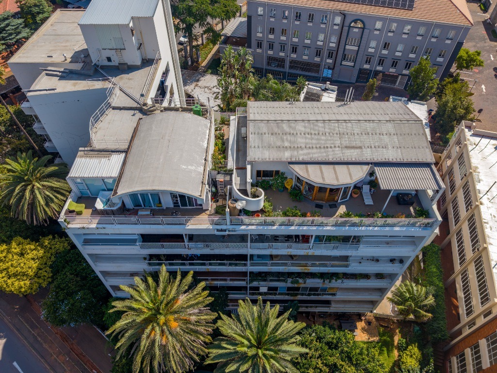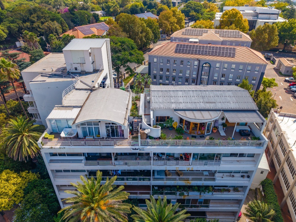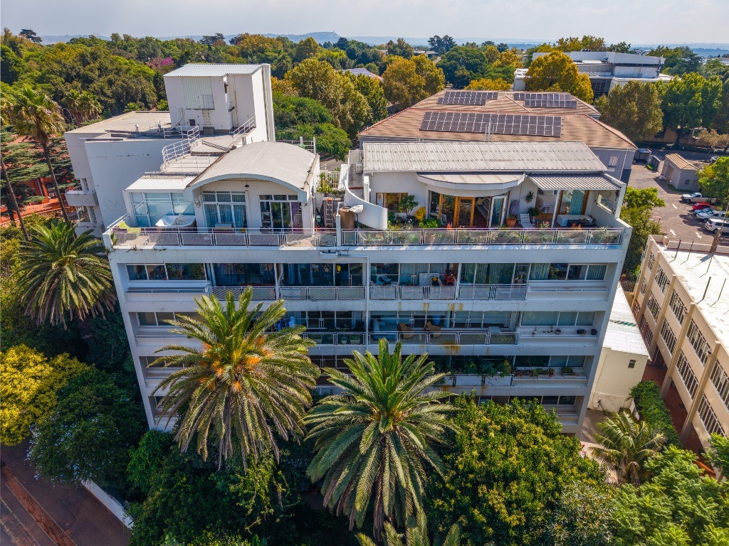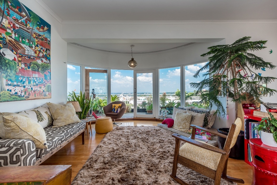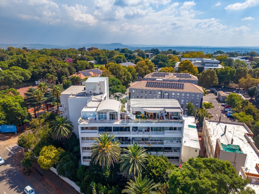 Set at the very top of the iconic Dunkeld Mansions at the apex of Corlett Drive and Oxford Road, this exceptional 424sqm penthouse apartment offers breathtaking views from its expansive wrap-around balconies and large, wood-framed windows.