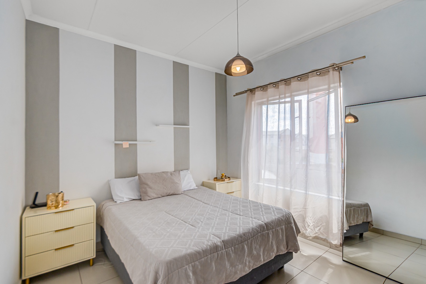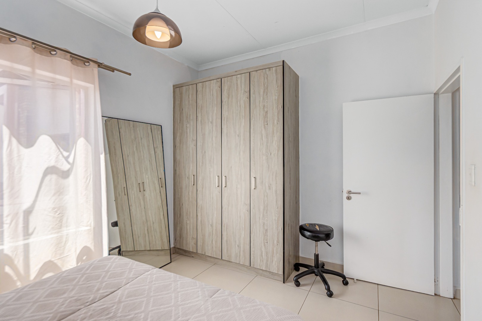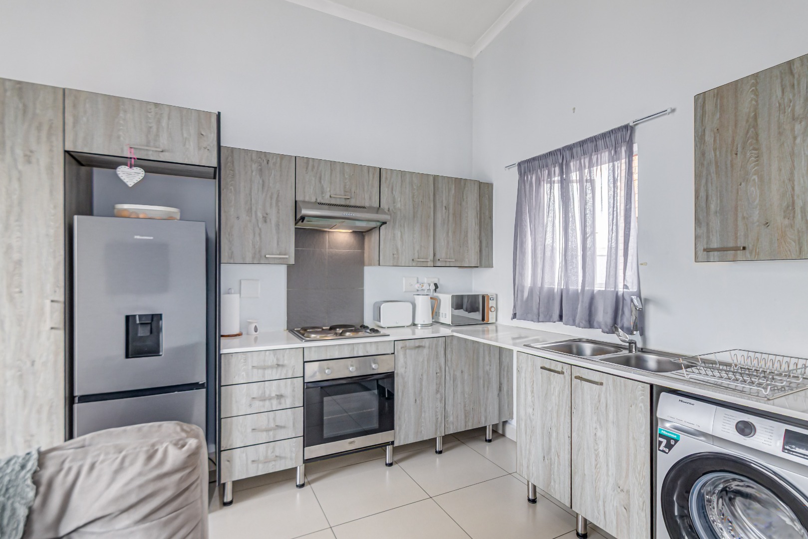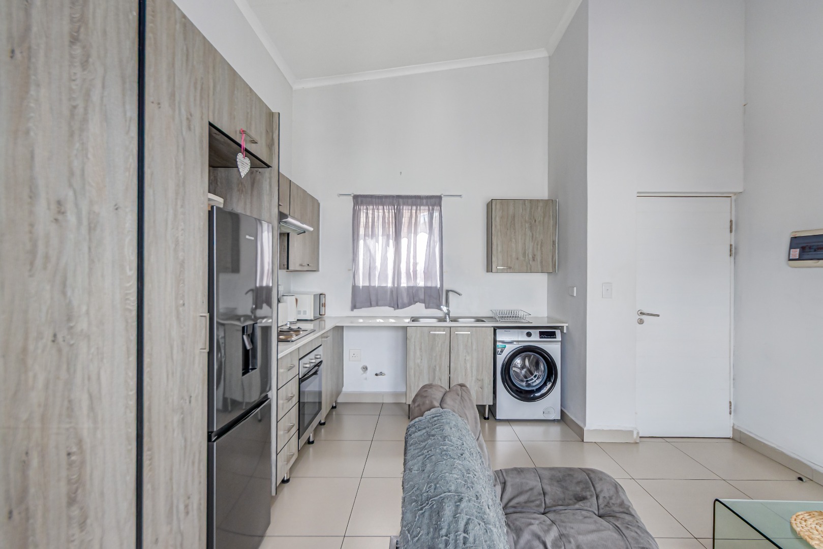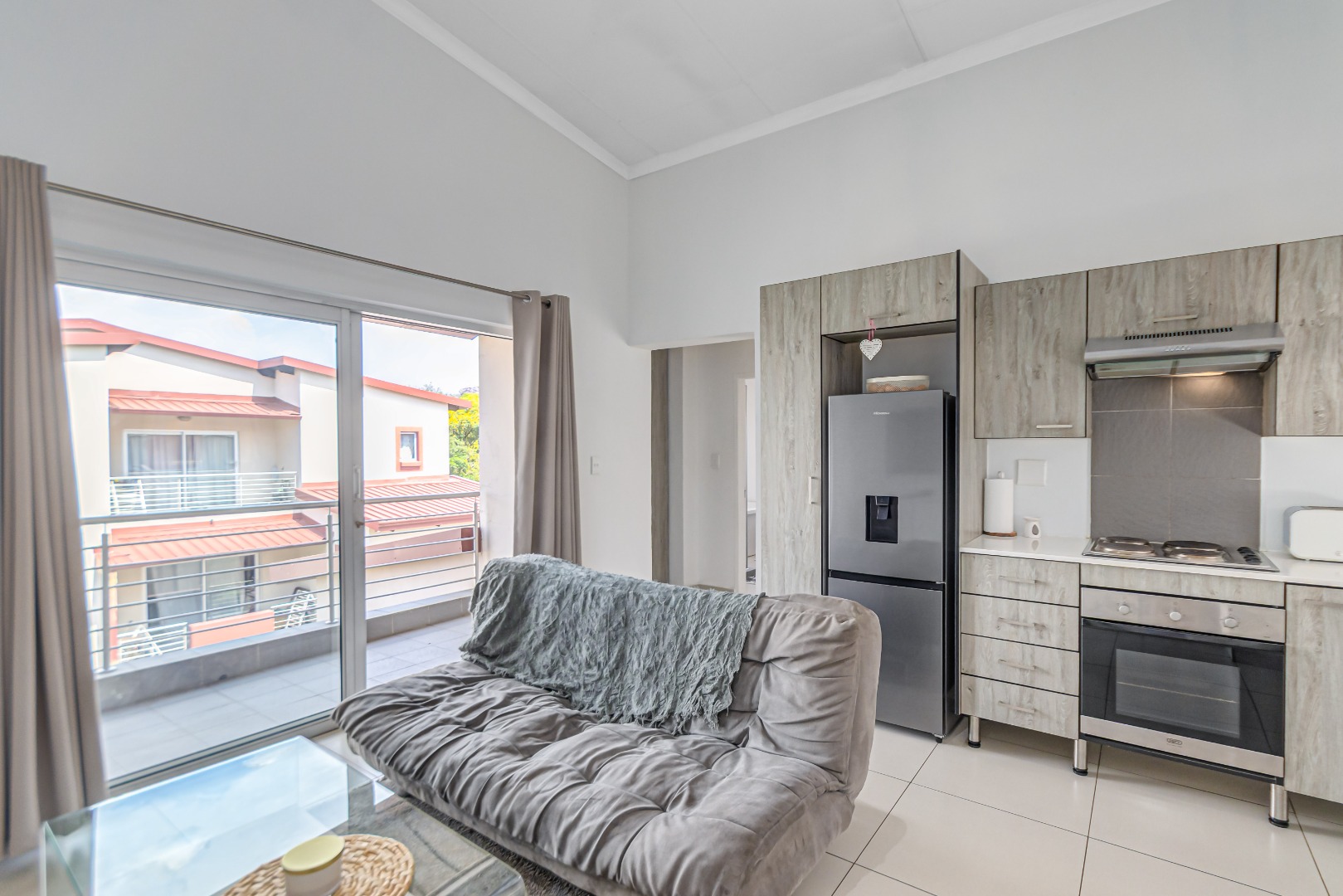 The spacious, tiled lounge welcomes you with plenty of natural light and opens out onto a private balcony—perfect for enjoying your morning coffee or relaxing after a long day. The open-plan kitchen flows seamlessly into the living area and features ample cupboard space, an electric oven and stove, and room for two under-counter appliances as well as a double-door fridge.