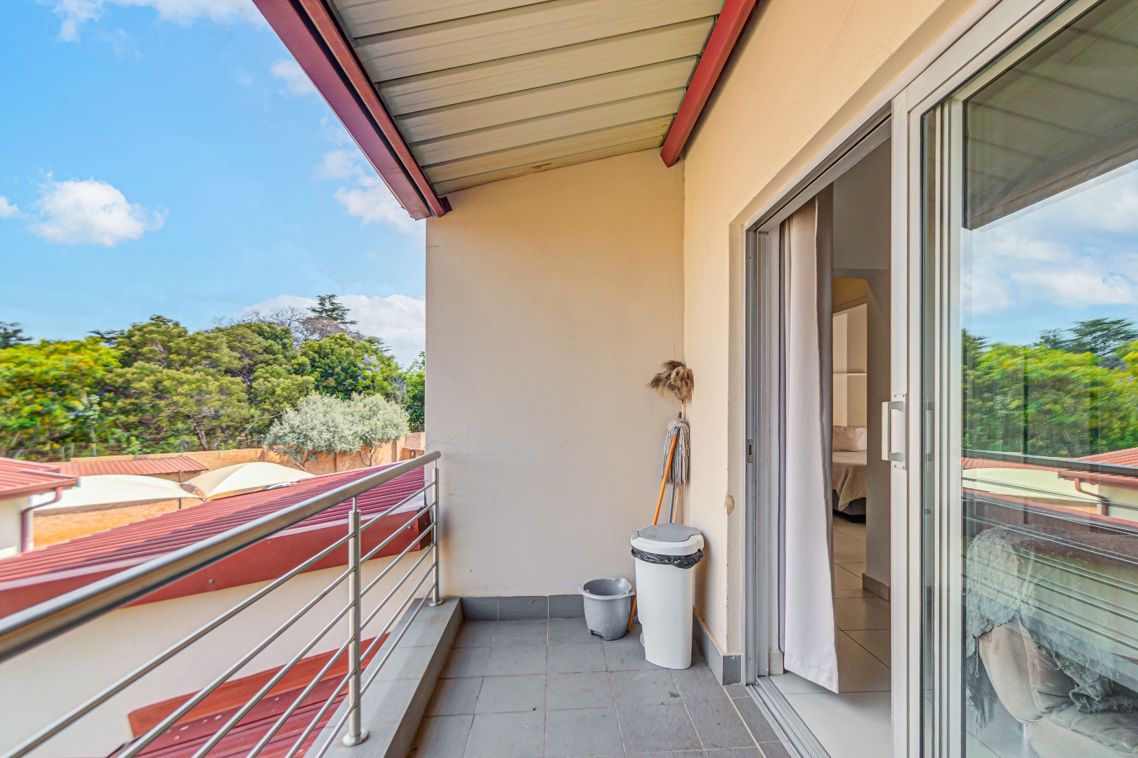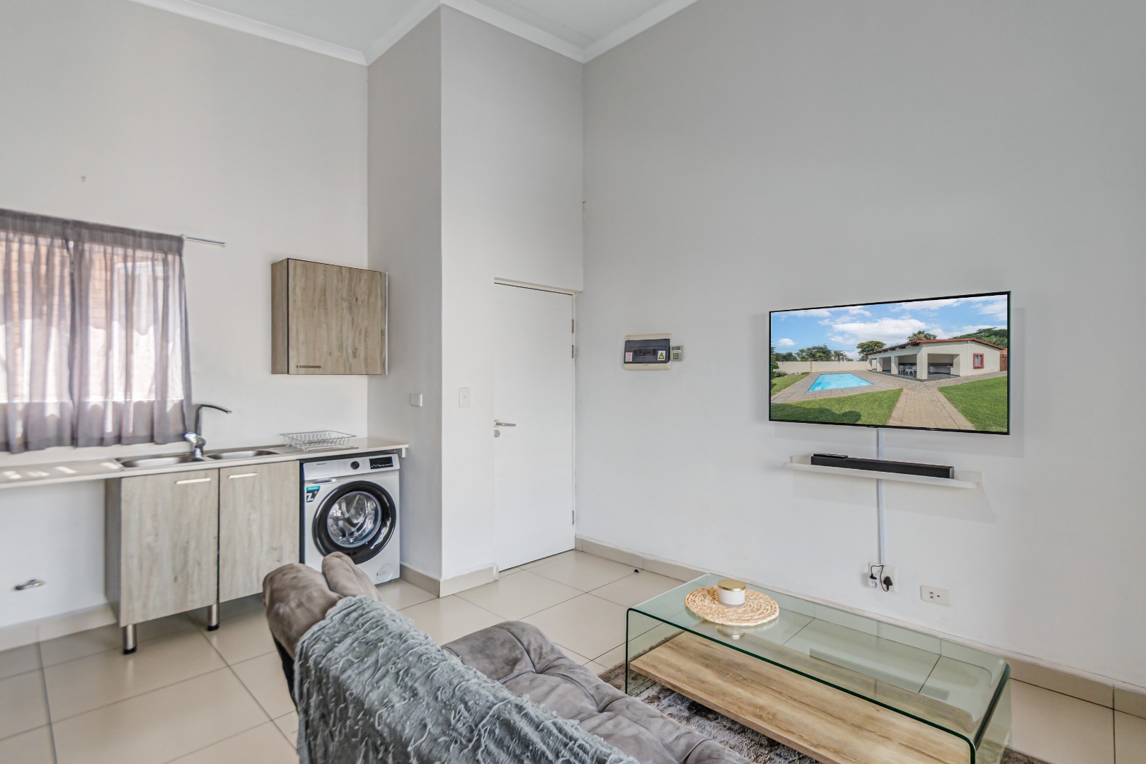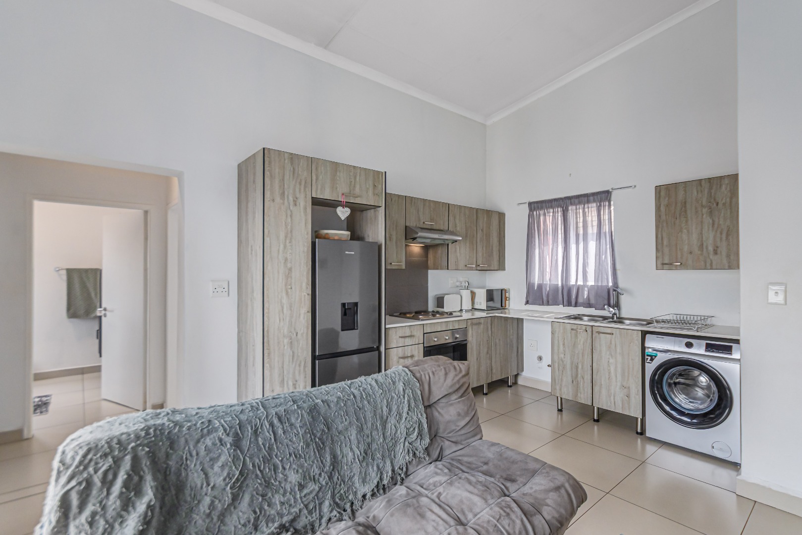 The spacious, tiled lounge welcomes you with plenty of natural light and opens out onto a private balcony—perfect for enjoying your morning coffee or relaxing after a long day. The open-plan kitchen flows seamlessly into the living area and features ample cupboard space, an electric oven and stove, and room for two under-counter appliances as well as a double-door fridge.