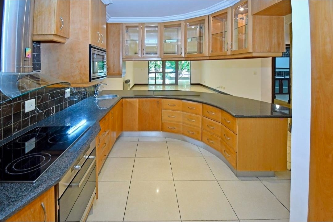 In the kitchen, wooden cabinets with glass doors and downlighting are offset by dark granite counters and smooth tiled floors which continue through to the spacious living area spilling out to a large balcony with a delightful view of the tropical gardens.