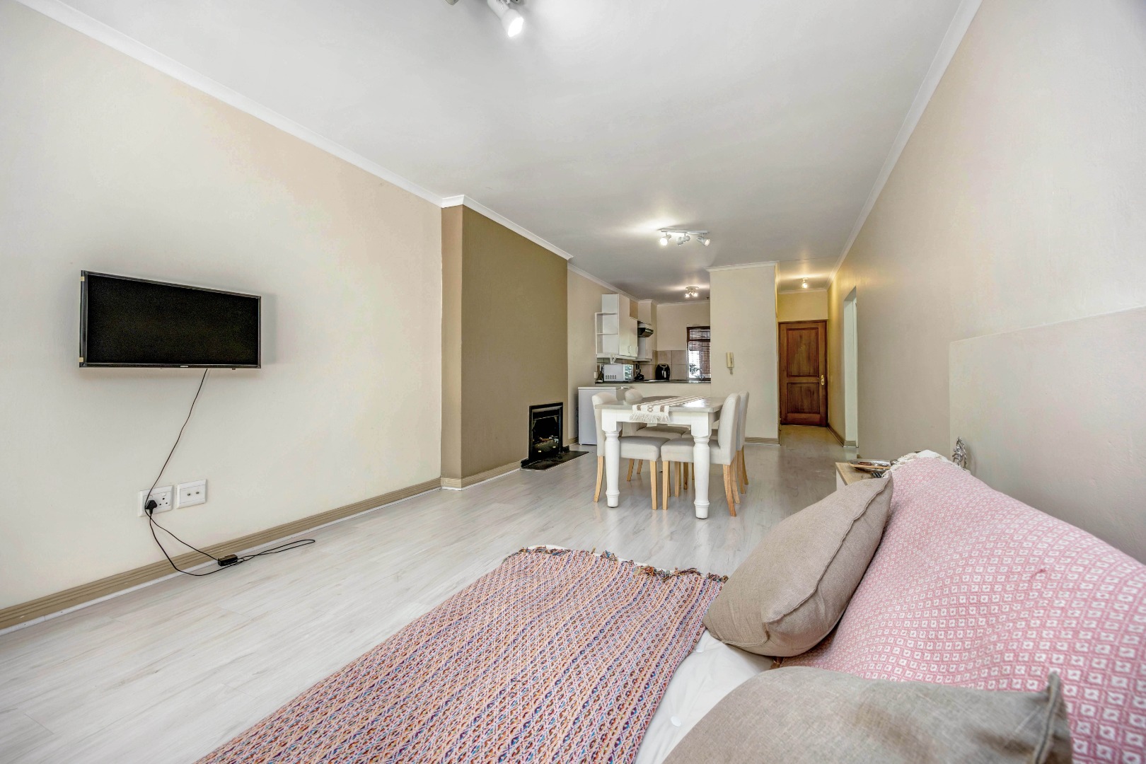 • A bright and airy open plan lounge and dining room with a built-in fireplace