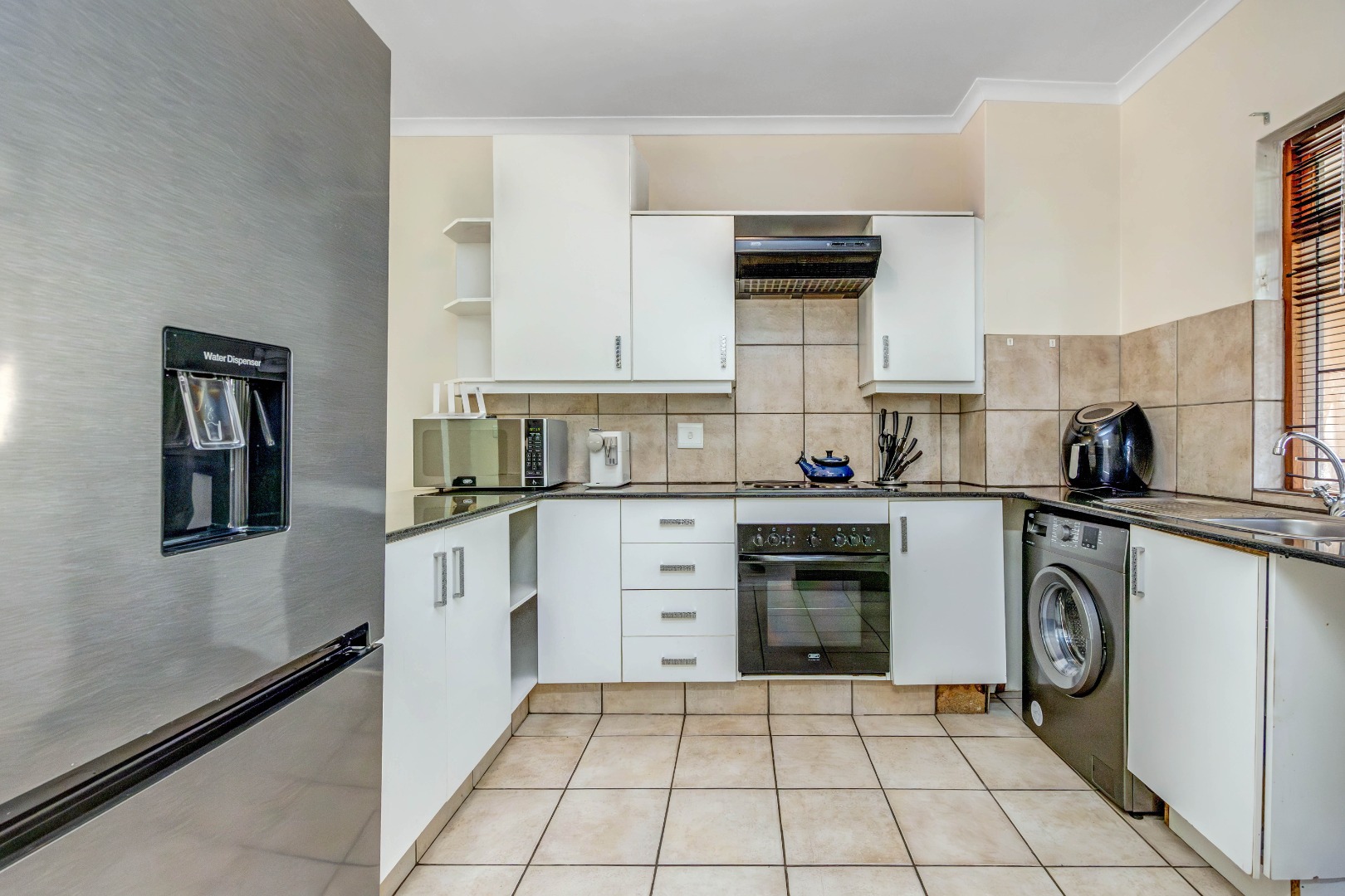• Functional kitchen with granite counters and space for two appliances plus a single door fridge