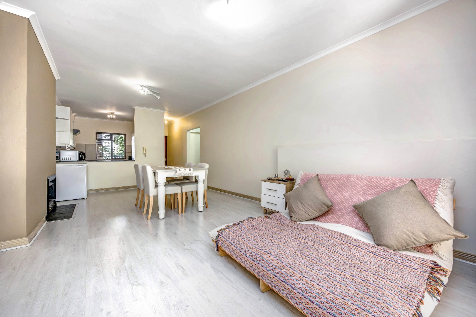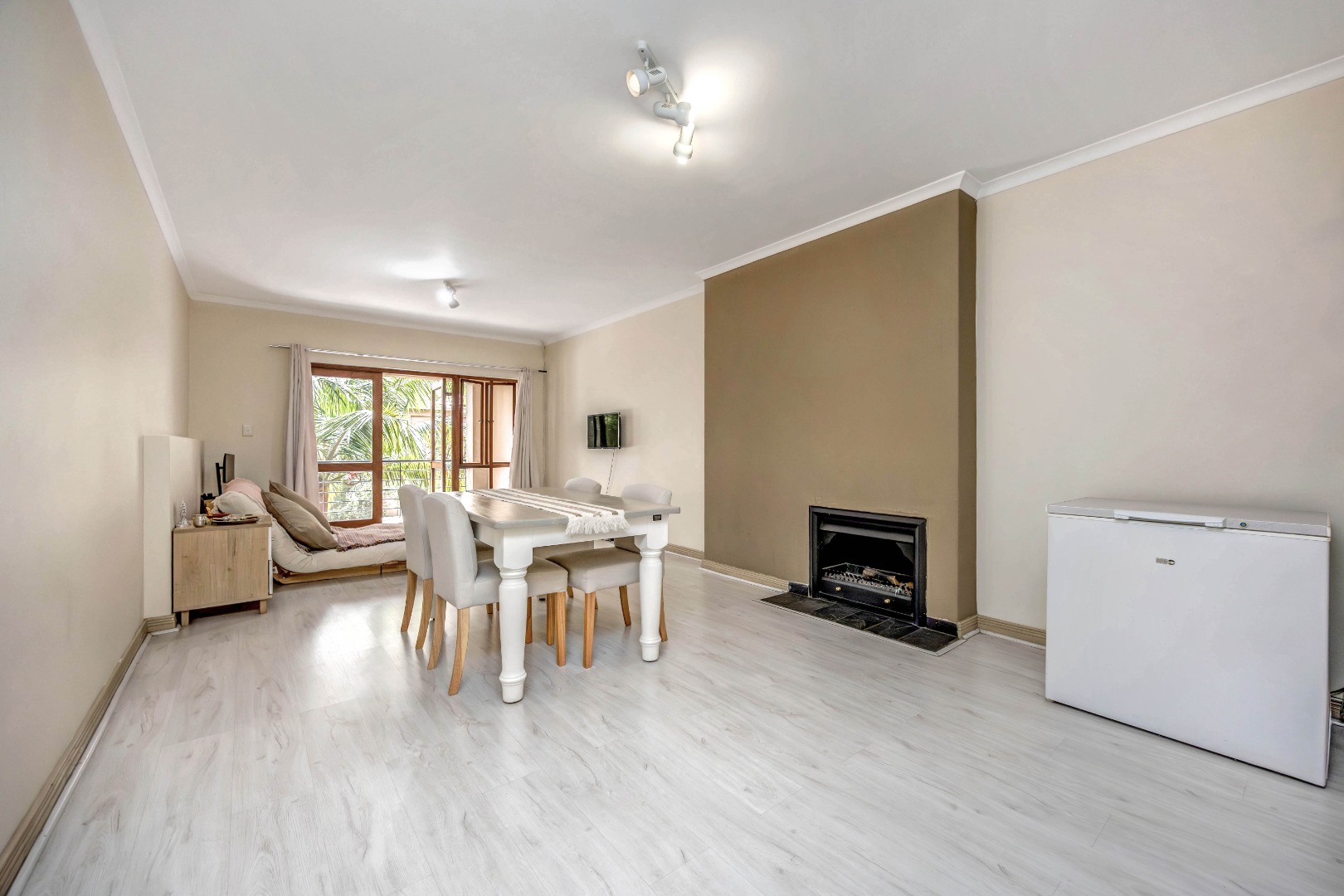 • A bright and airy open plan lounge and dining room with a built-in fireplace