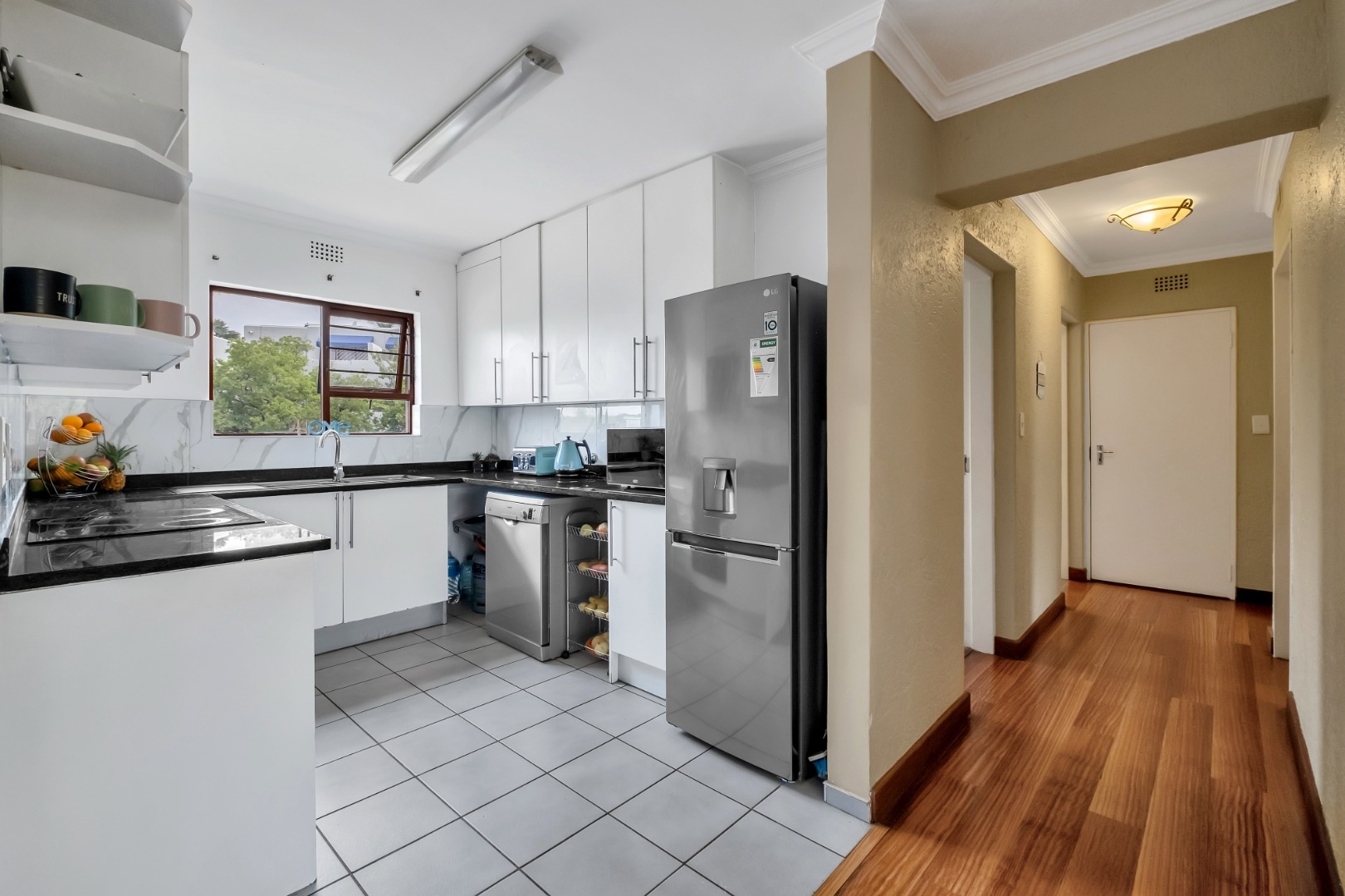 Beautiful real wood floors extend through the spacious open plan lounge and dining area, which opens out to a good-sized covered balcony from where you can admire the delightful gardens below.