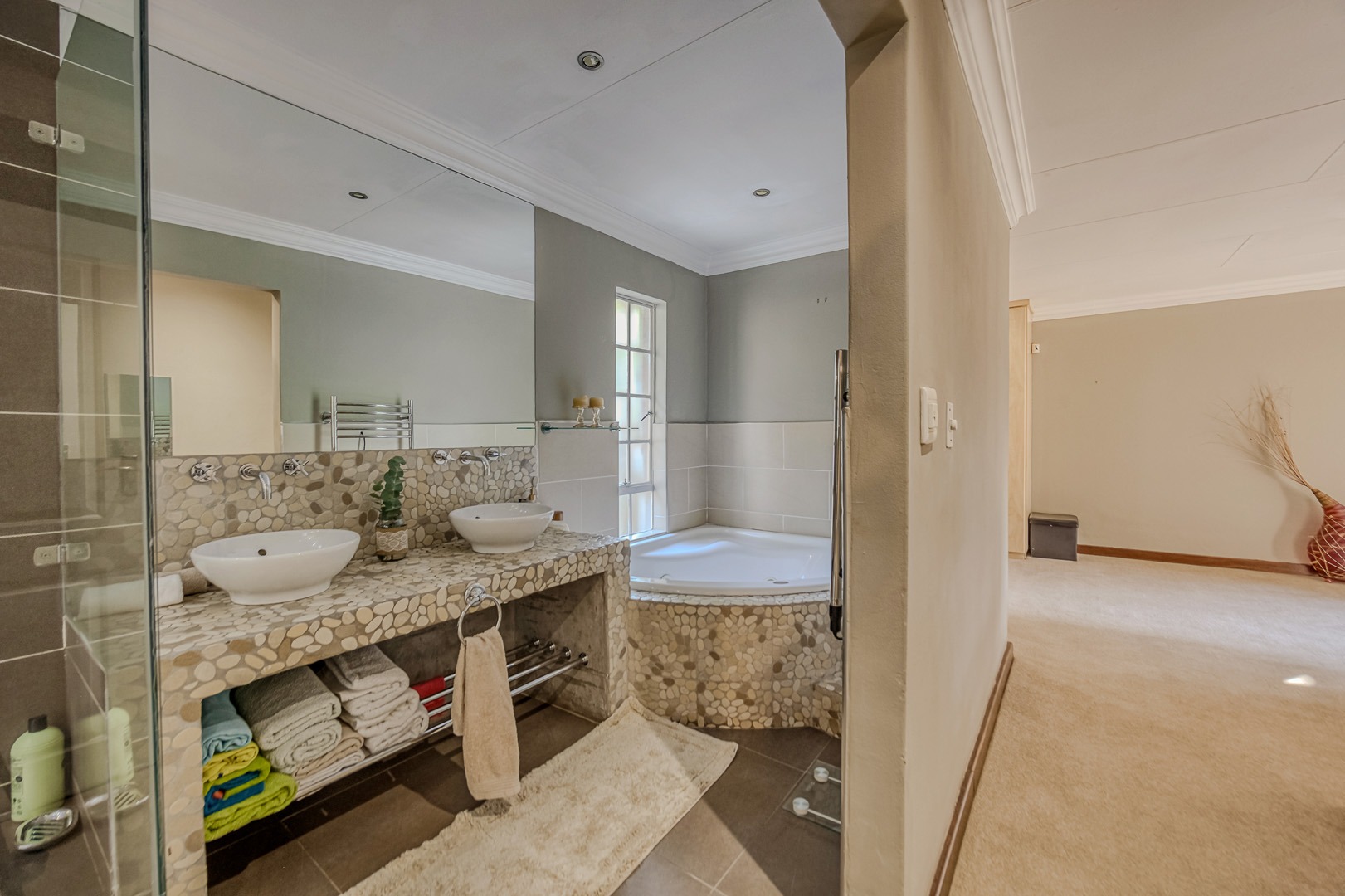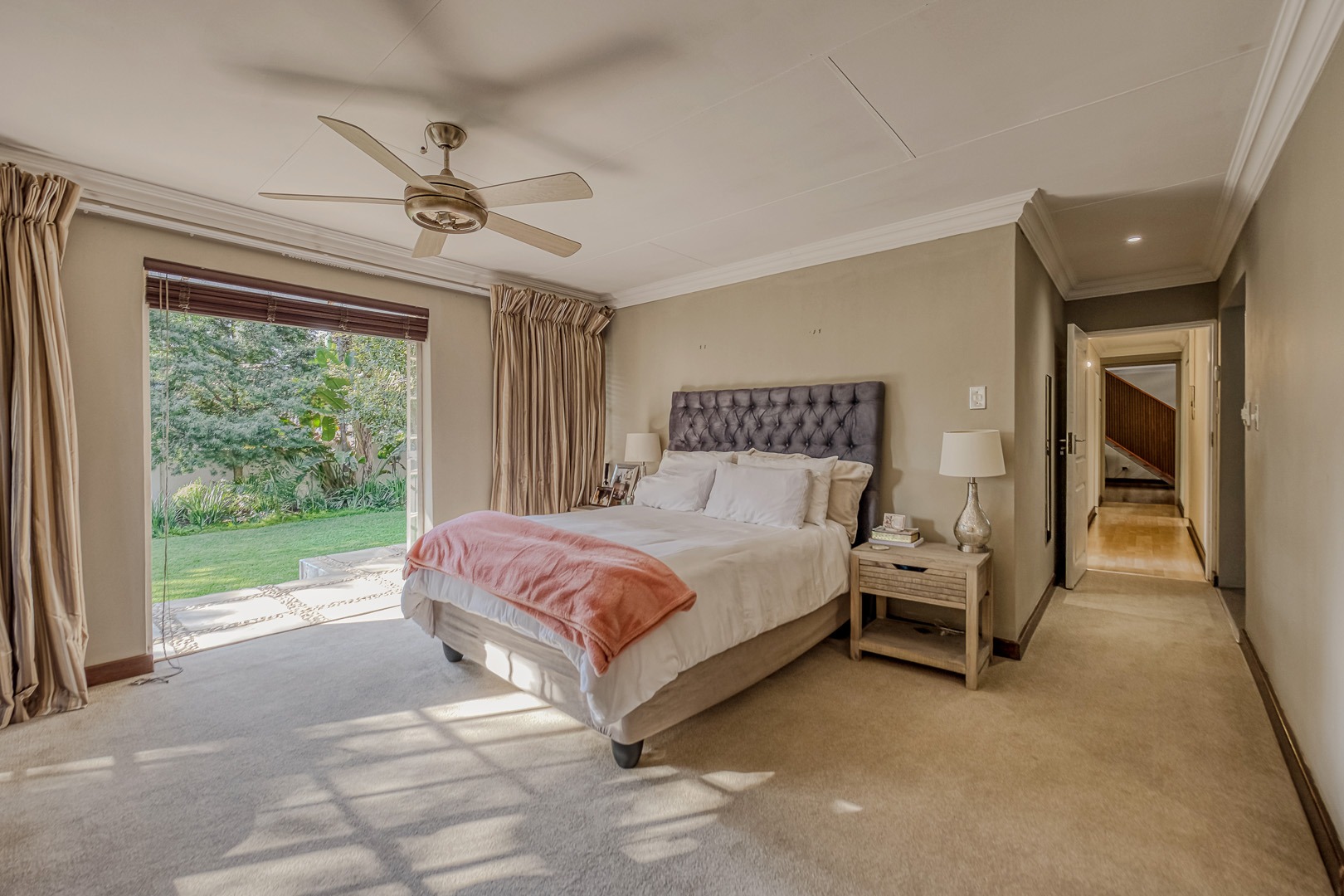 There are three generously sized bedrooms downstairs. The king-sized main bedroom has French doors to its own patio, the 2nd and 3rd bedrooms are extended to provide study/seating areas. Two attractive full bathrooms in subtle neutral tones, the large main ensuite has a jet bath and rain shower. Upstairs is a huge 4th bedroom with lounge area and balcony with expansive views.