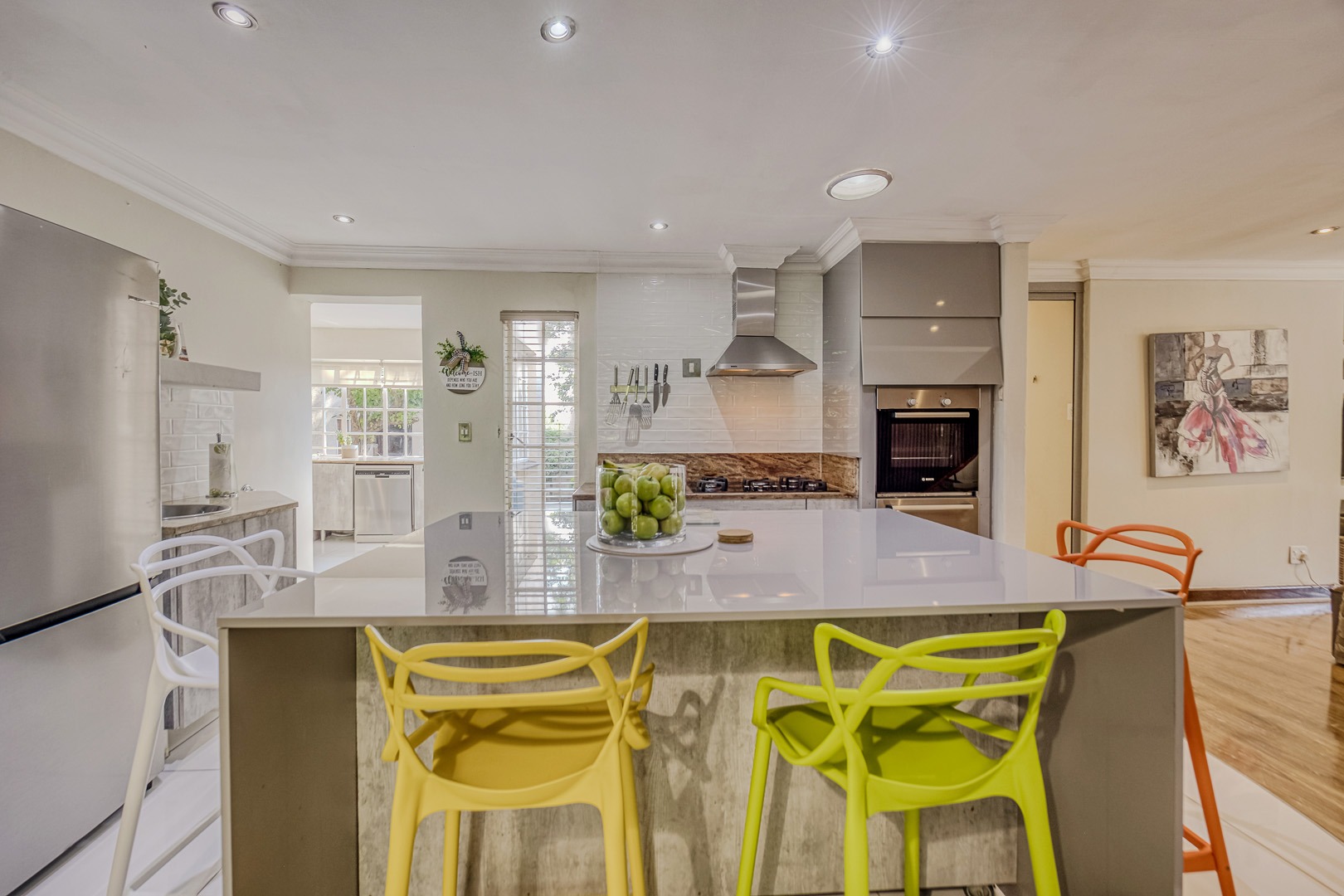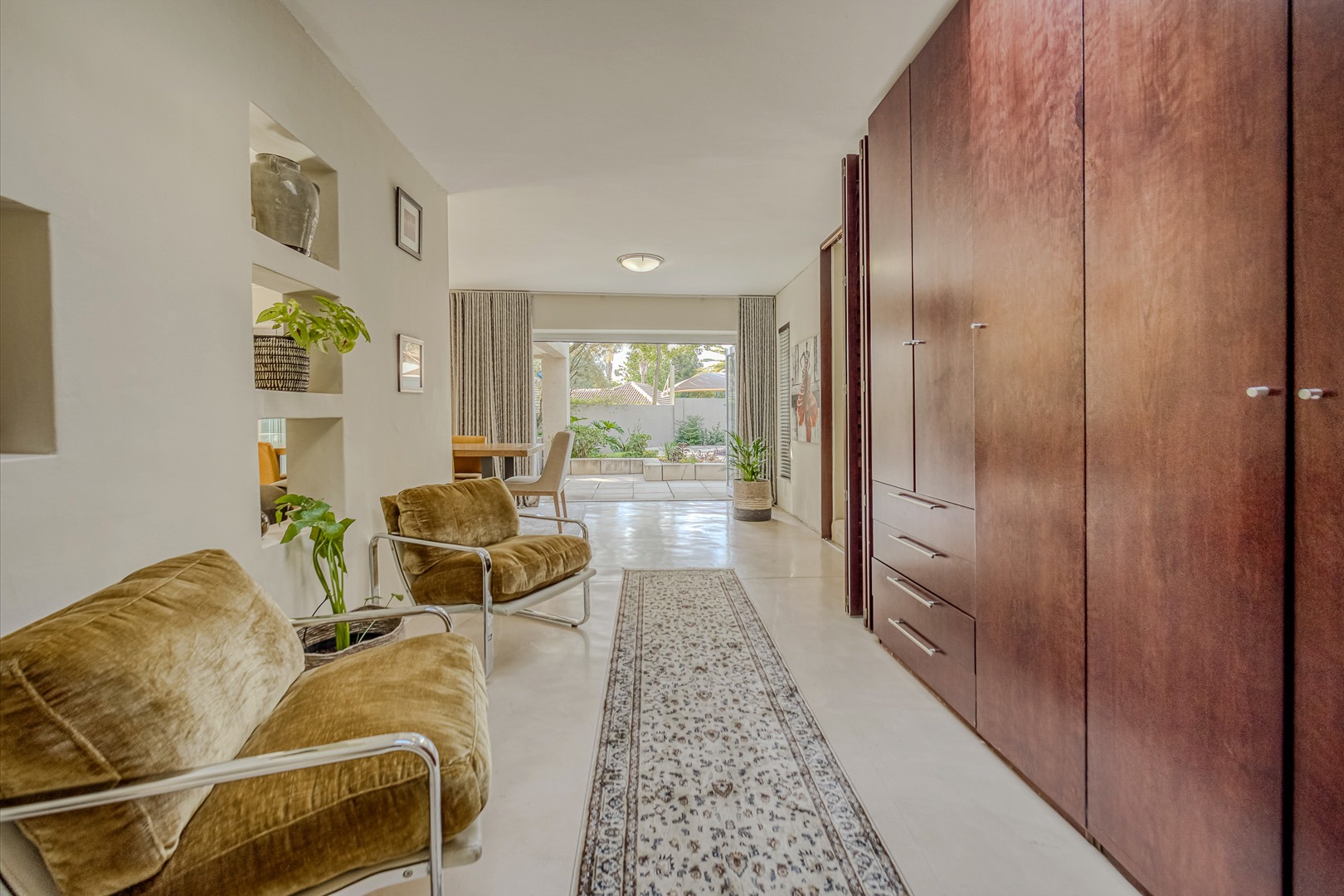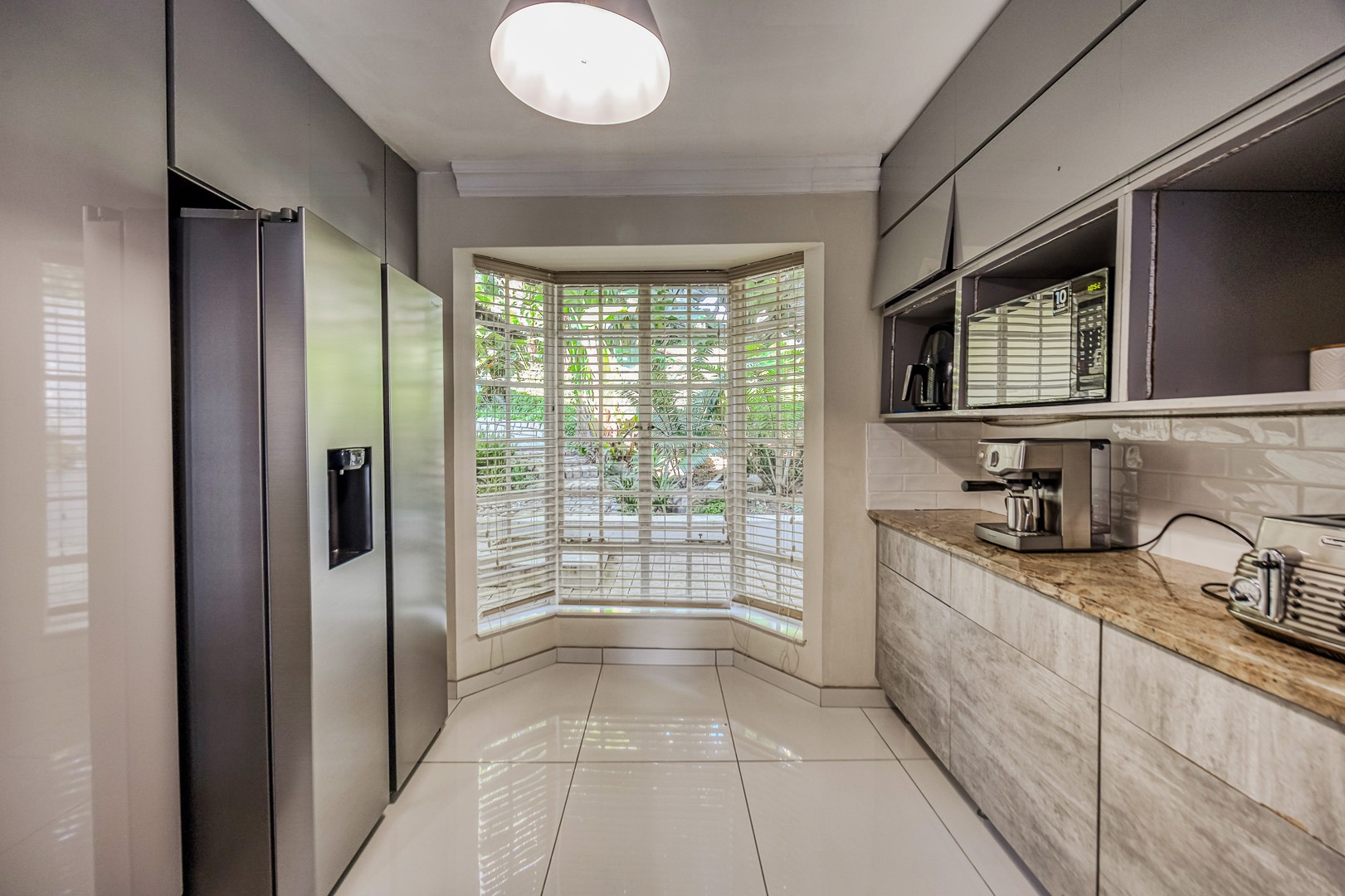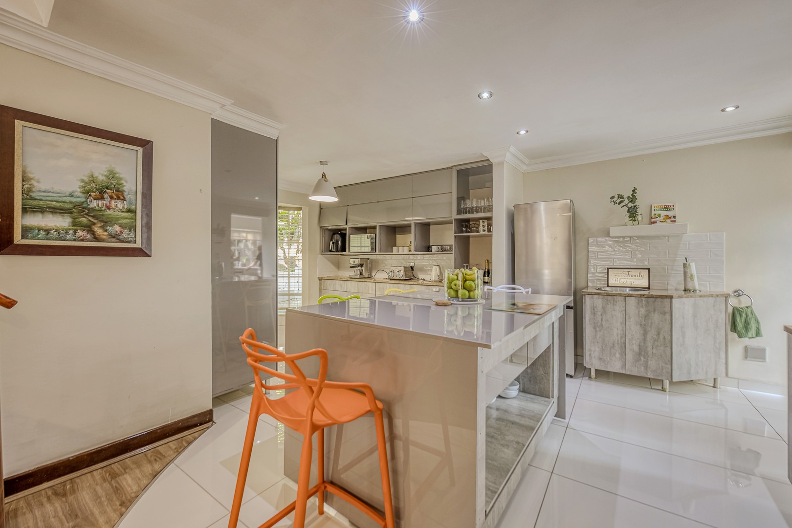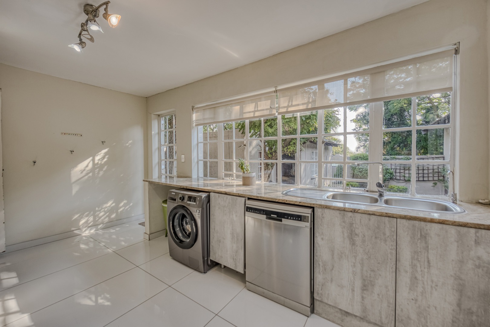 sophisticated quartz kitchen with feature lighting, gas hob and eyelevel oven. The large separate scullery with double sink, banks of fitted cupboards and space for 3 appliances opens to a pretty walled courtyard. The double auto garage leads into the scullery, giving direct access to the home.