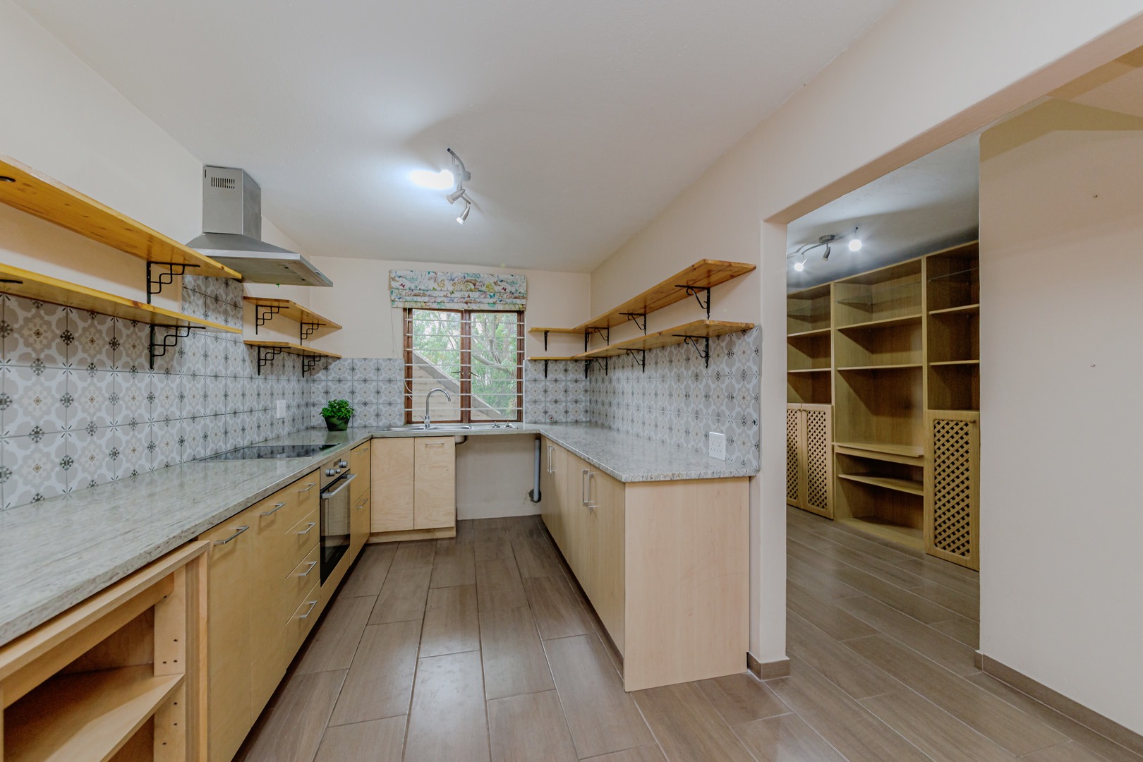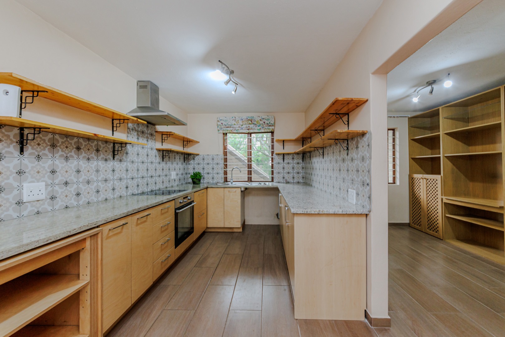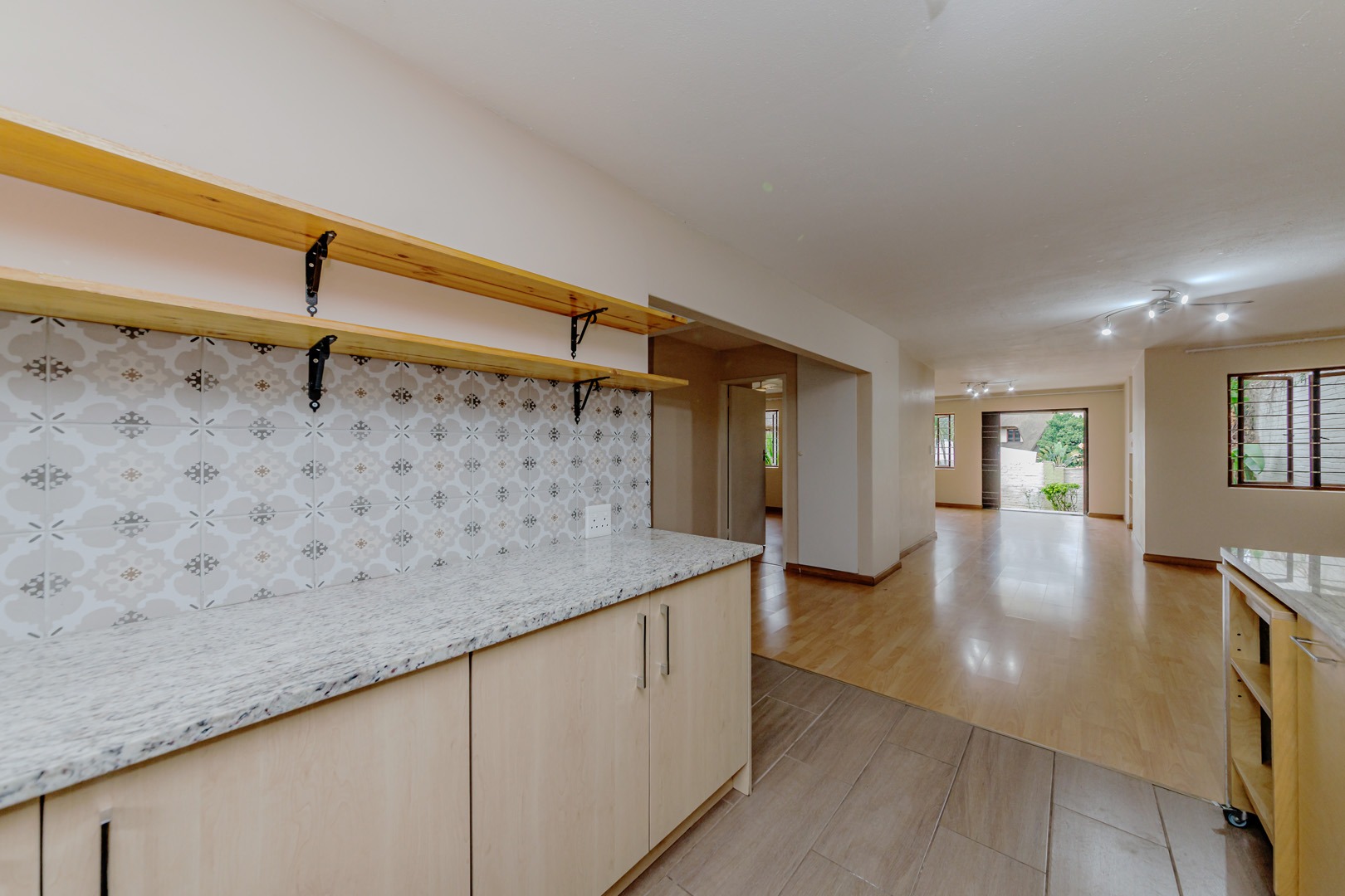 - Modern open-plan kitchen with ample cupboard space and connection for one under-counter appliance