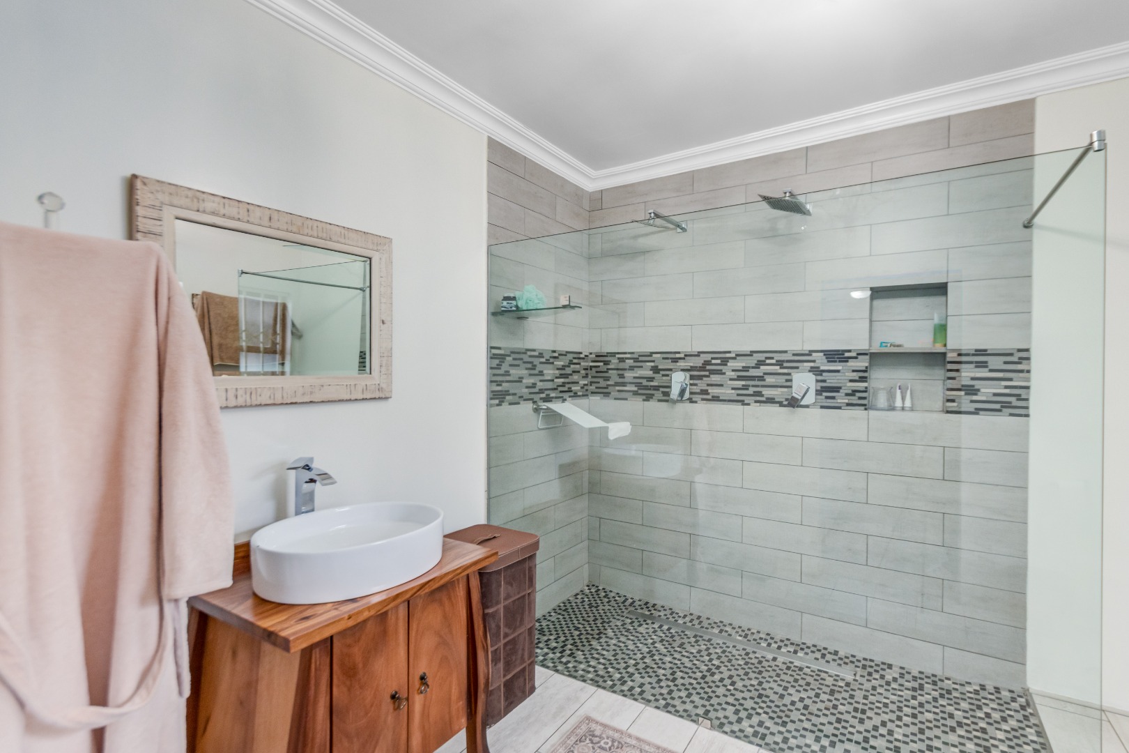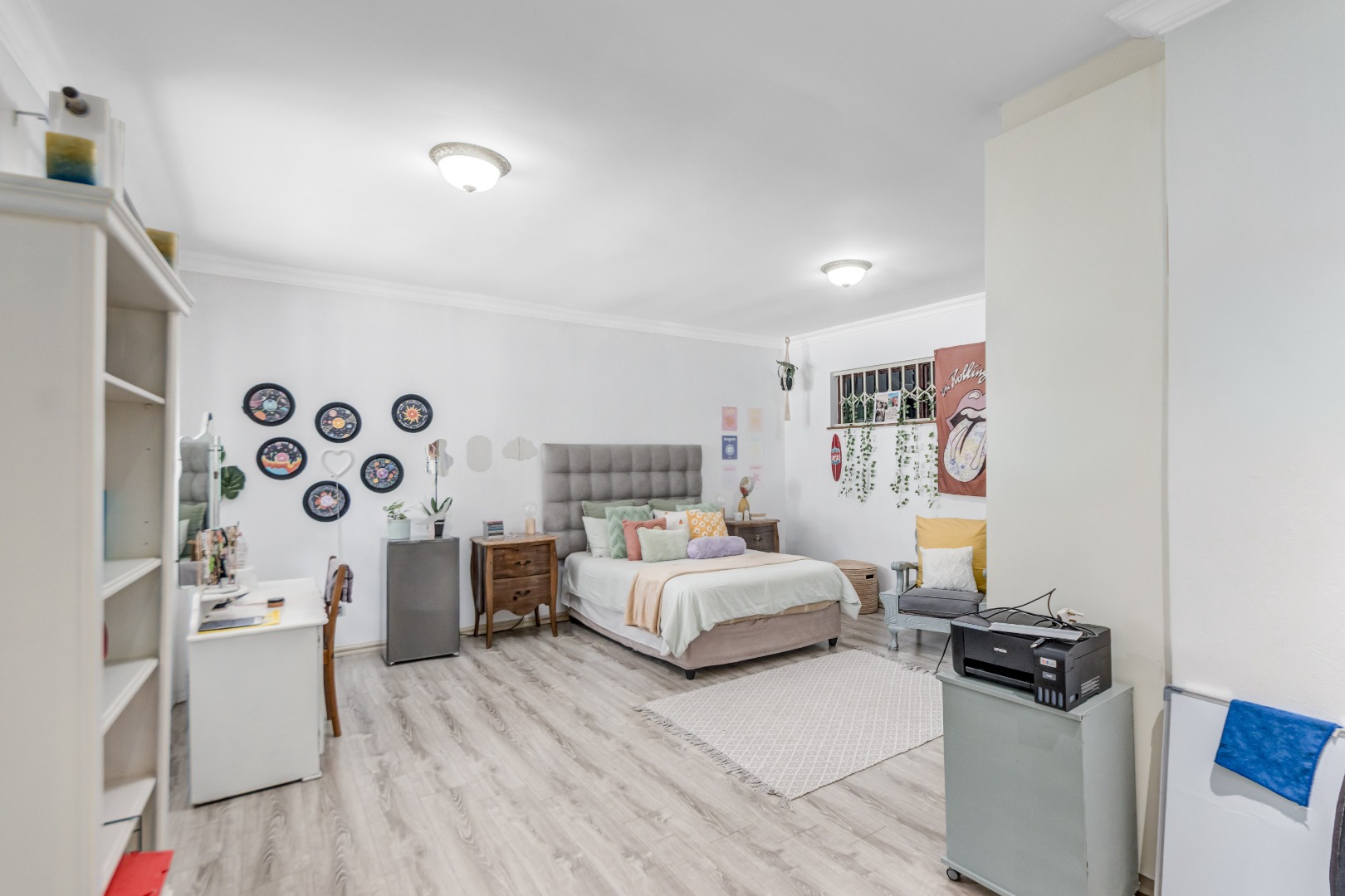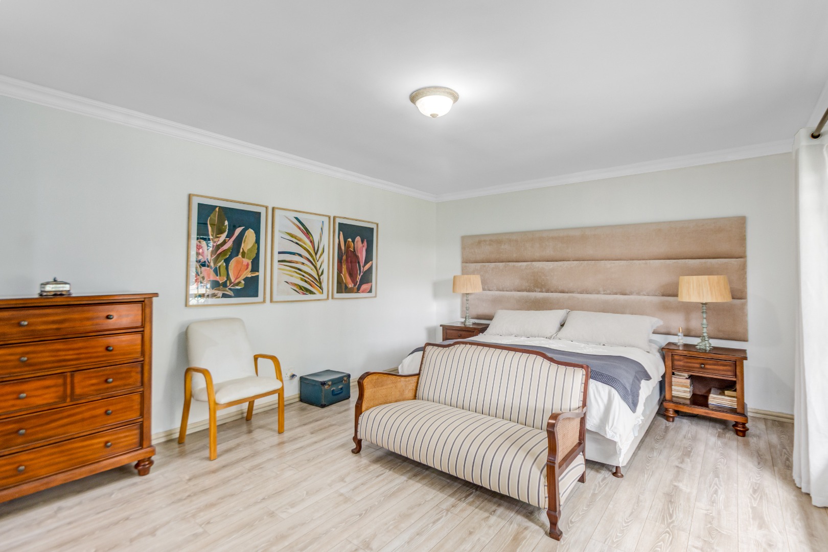 The home offers five spacious bedrooms, all finished with warm laminate wood-look flooring. The accommodation includes a spacious third bathroom off the hallway, a fourth bedroom with its own en-suite bathroom, and an exceptional master suite featuring generous walk-in cupboards and a luxurious en-suite bathroom with a large walk-in shower.