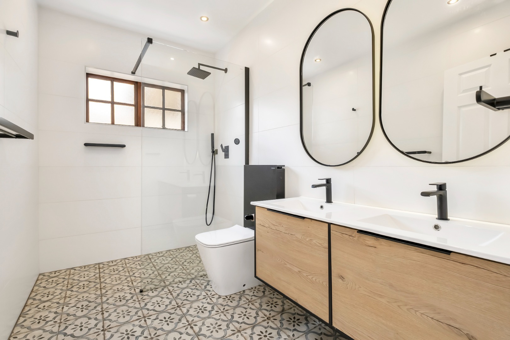 The North-facing master bedroom enjoys a modern en-suite bathroom with double vanities and a walk-in shower.