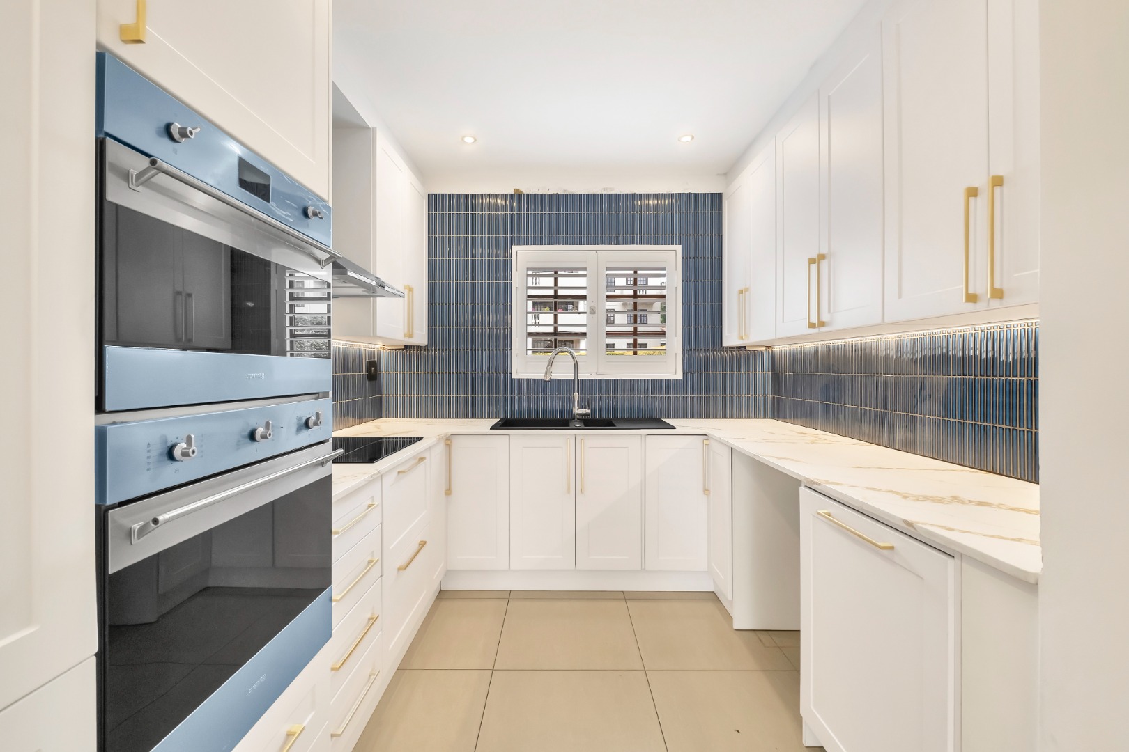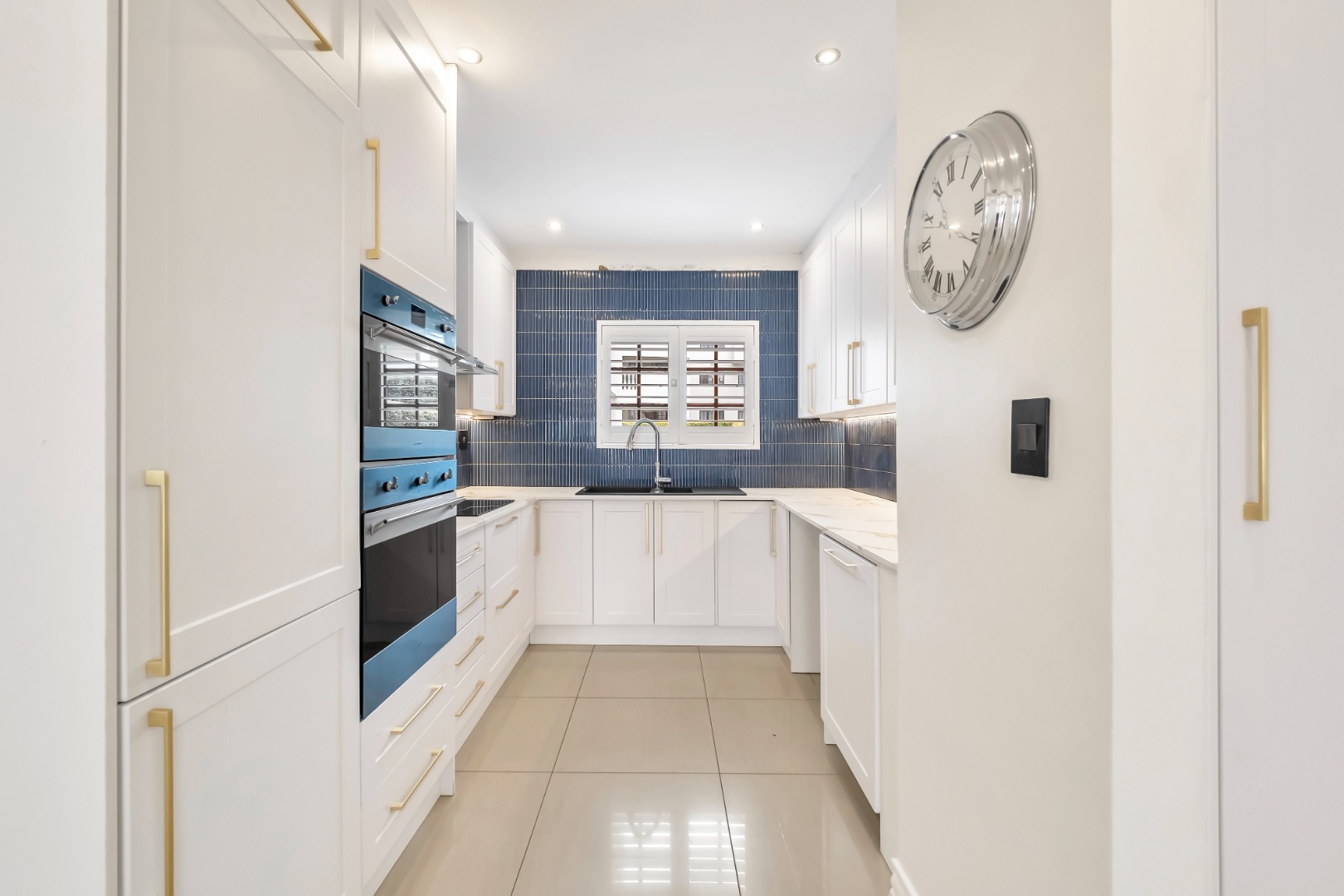 A spectacular open plan kitchen offers luxurious Caesarstone counters and fresh white cabinets enhanced by gold accents. Brand new SMEG appliances have been fitted including an induction stovetop with extractor, eye-level oven, grill microwave and integrated dishwasher as well an integrated Grundig fridge-freezer and a Laveo double sink. Allowance has been made for an additional undercounter appliance.