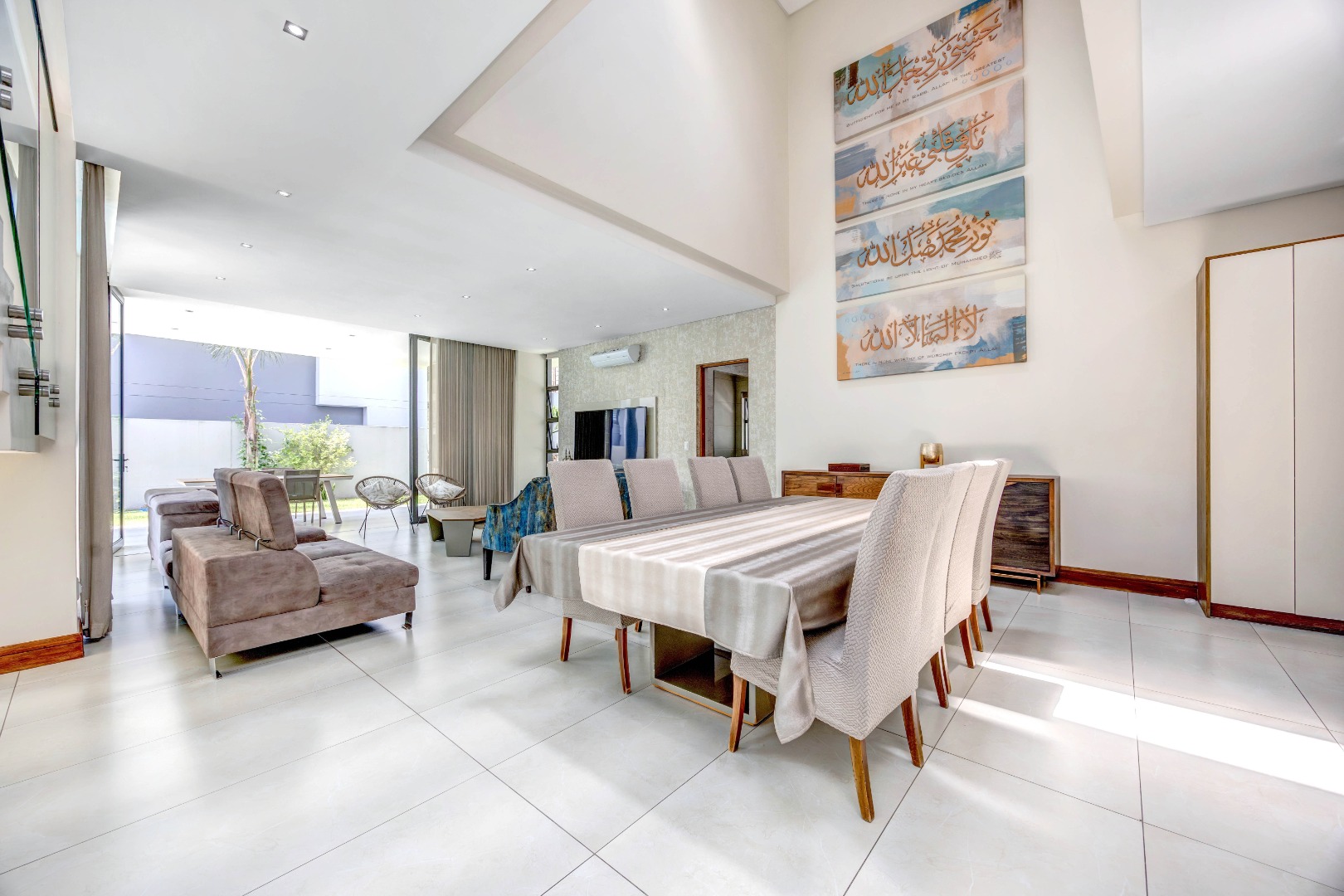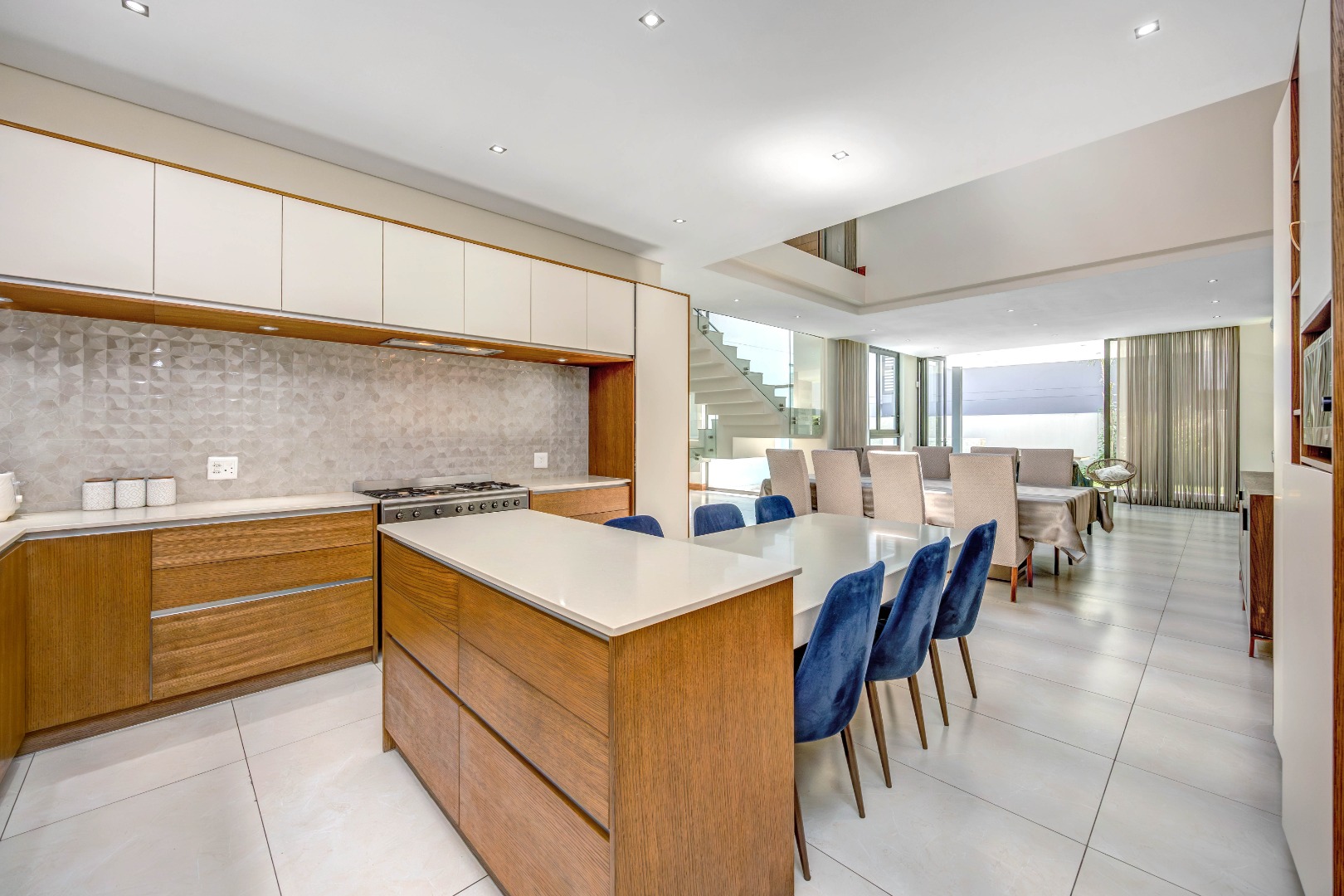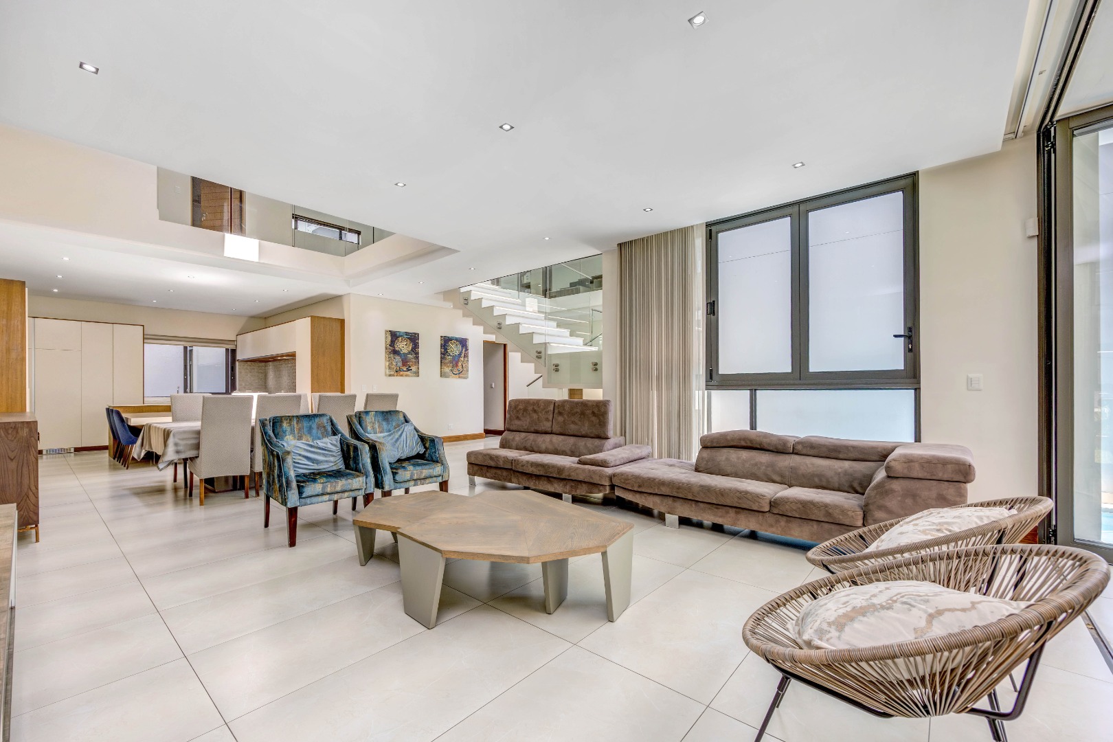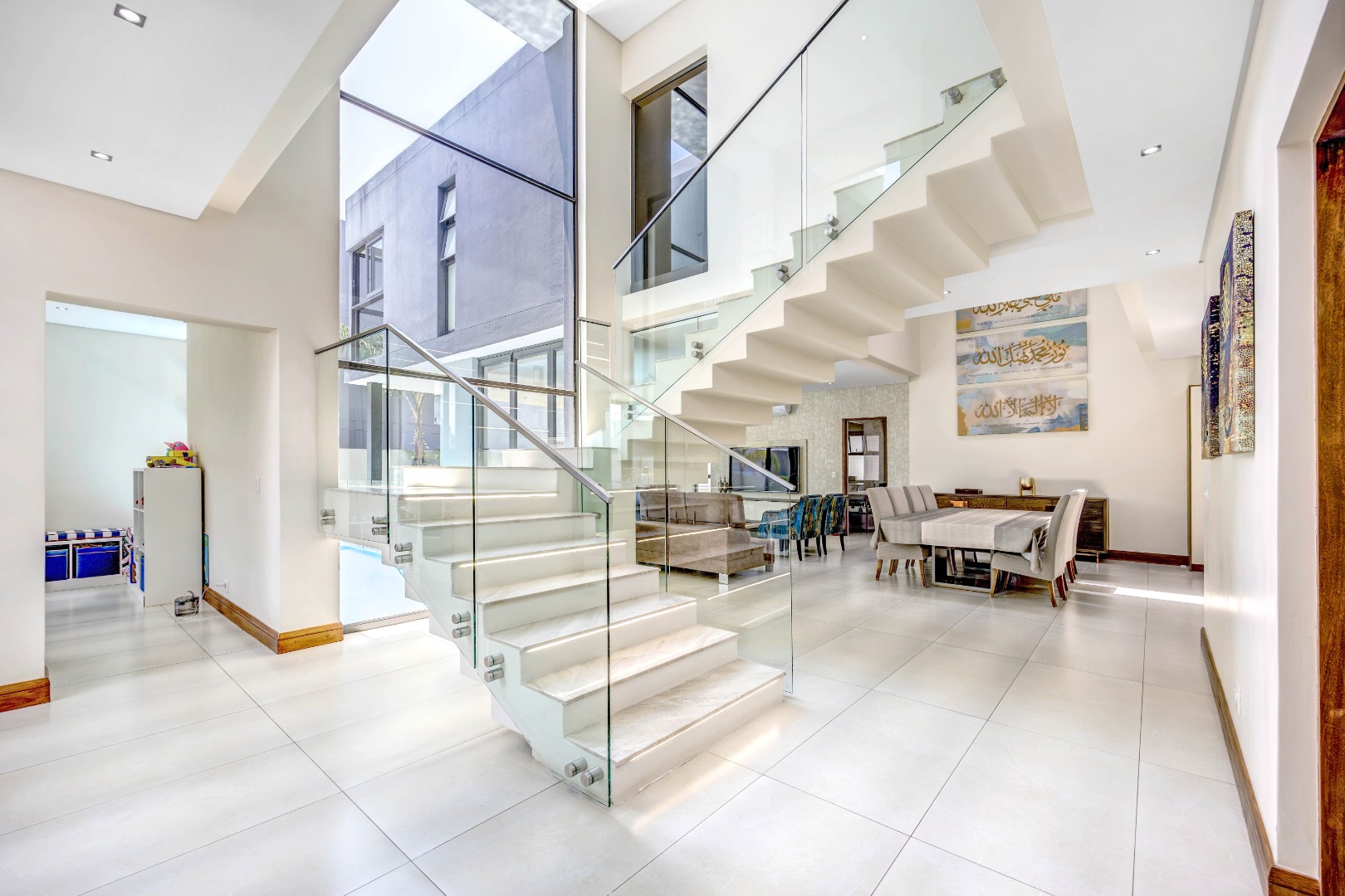 A striking double-volume entrance hall creates an immediate sense of scale and sophistication, setting the tone for the beautifully designed interiors beyond. The home flows effortlessly into expansive open-plan living areas, comprising a stylish lounge, generous dining space, and a sleek designer kitchen with ample cupboard space and a separate scullery, ideal for both everyday living and effortless entertaining.