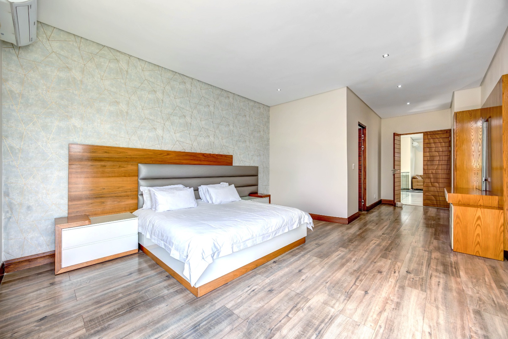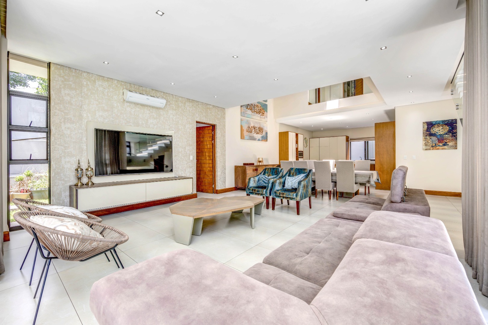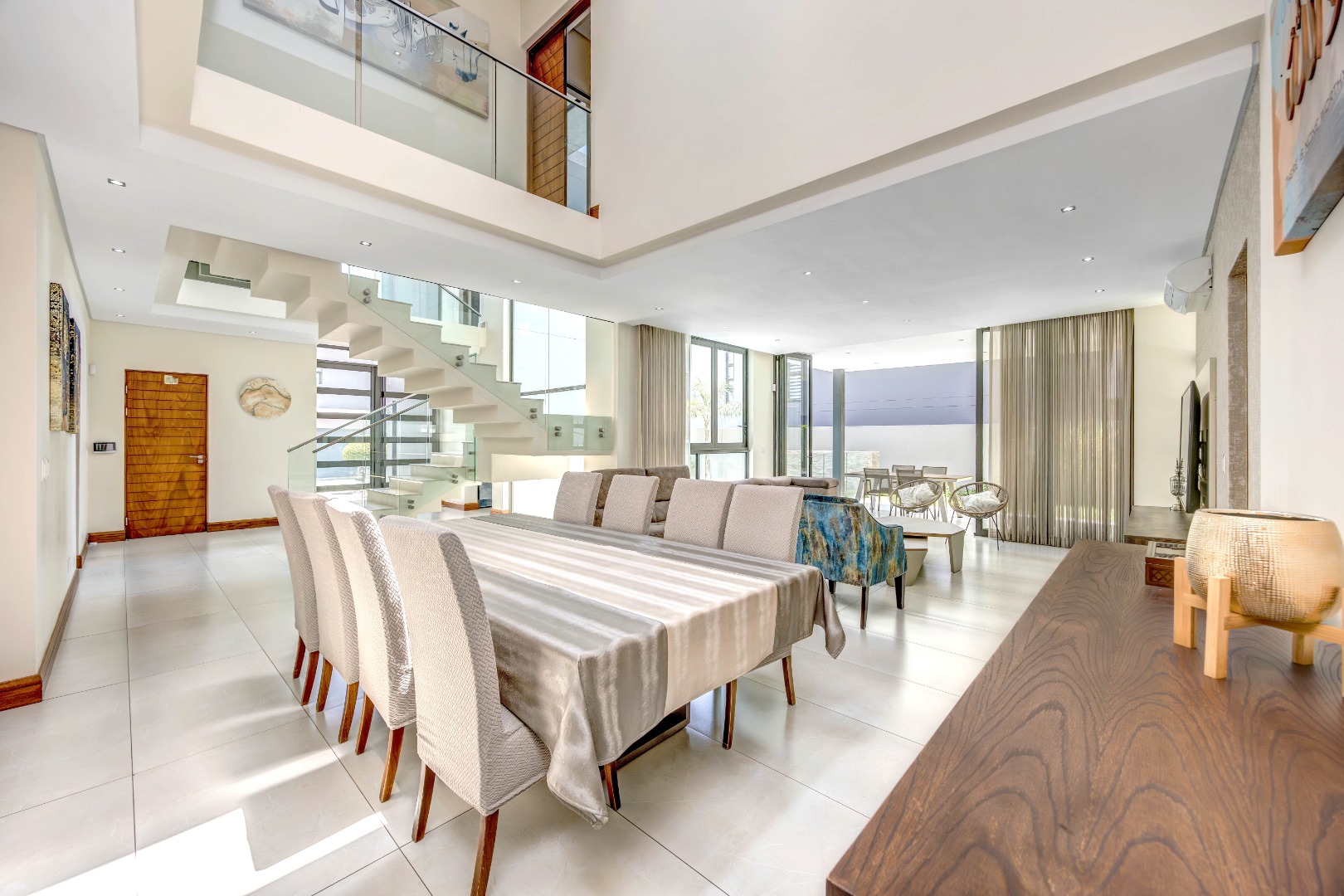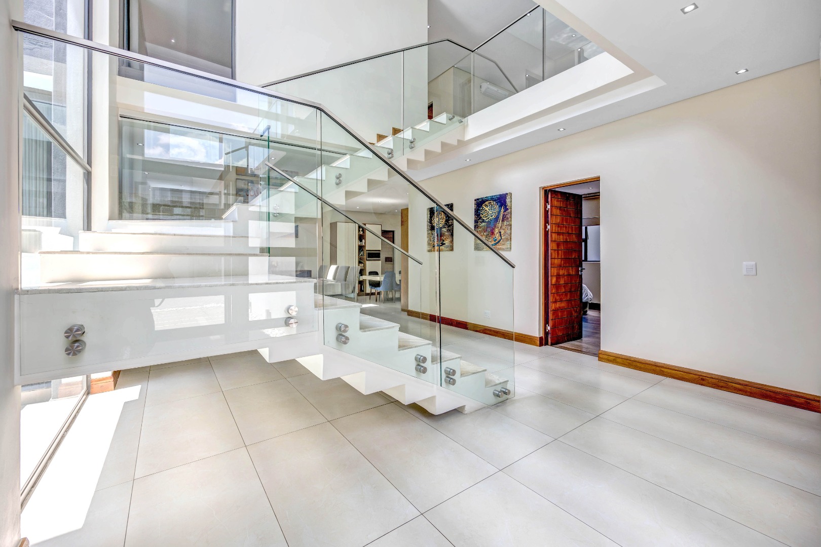 A striking double-volume entrance hall creates an immediate sense of scale and sophistication, setting the tone for the beautifully designed interiors beyond. The home flows effortlessly into expansive open-plan living areas, comprising a stylish lounge, generous dining space, and a sleek designer kitchen with ample cupboard space and a separate scullery, ideal for both everyday living and effortless entertaining.