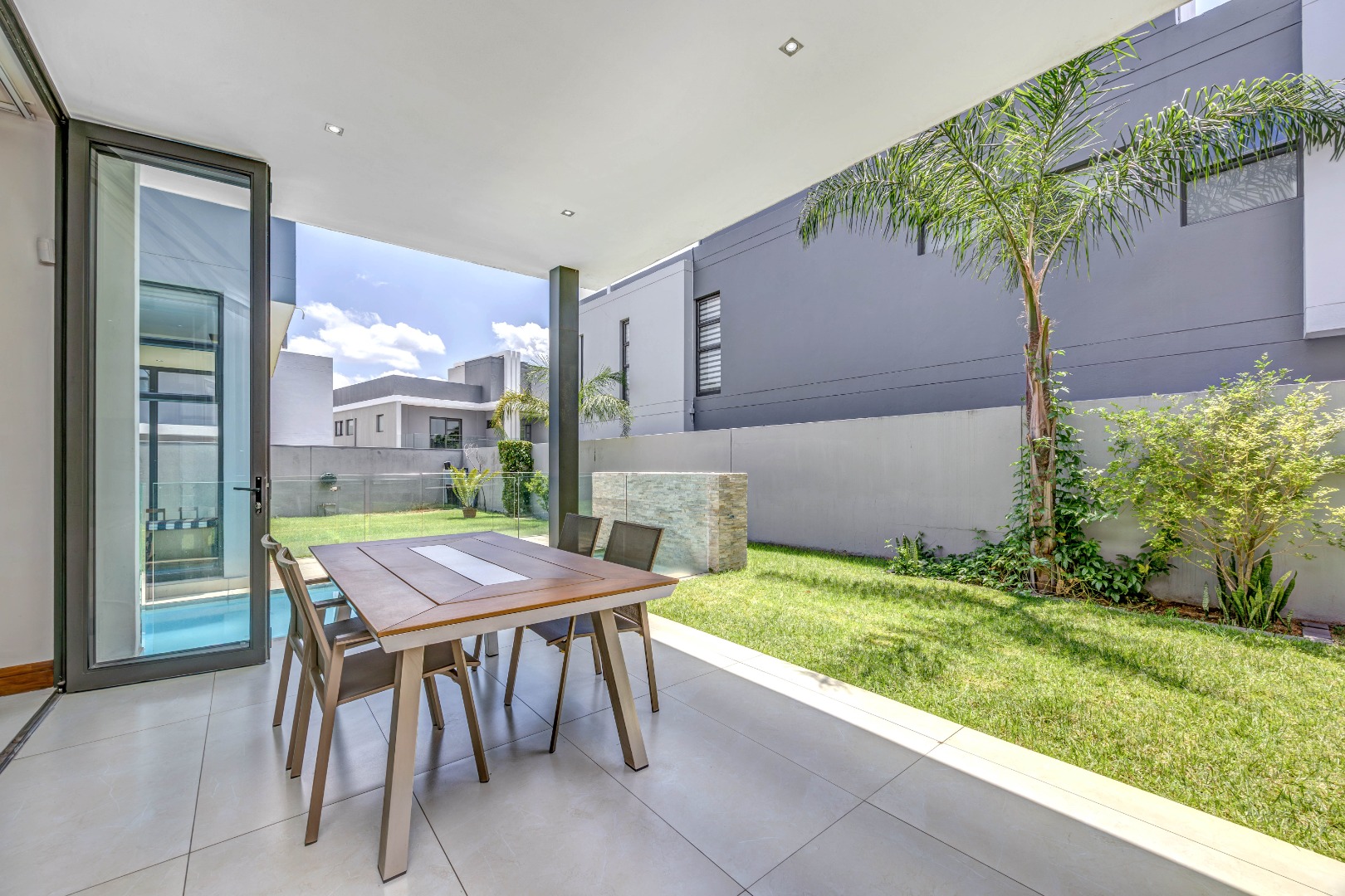 The living and dining areas open seamlessly onto a covered patio with built-in braai, overlooking a sparkling swimming pool and a well-sized, landscaped garden, creating the perfect setting for family gatherings, entertaining guests, or relaxed outdoor living.