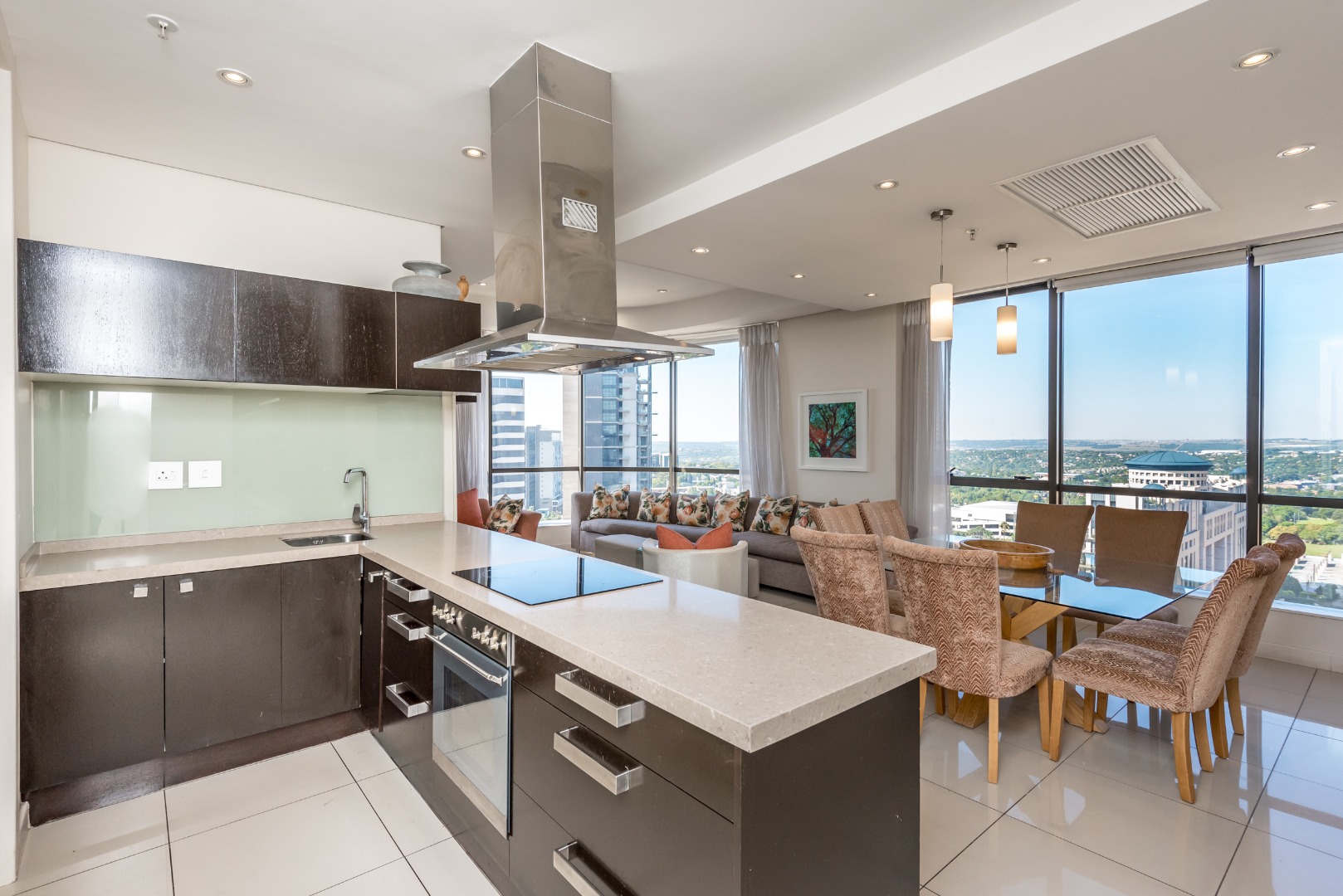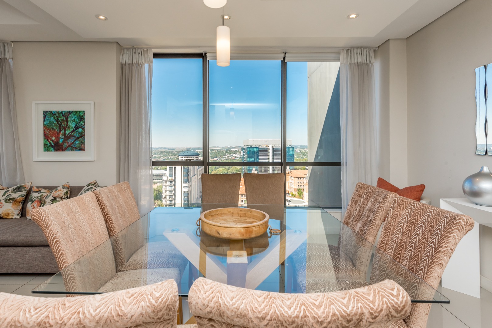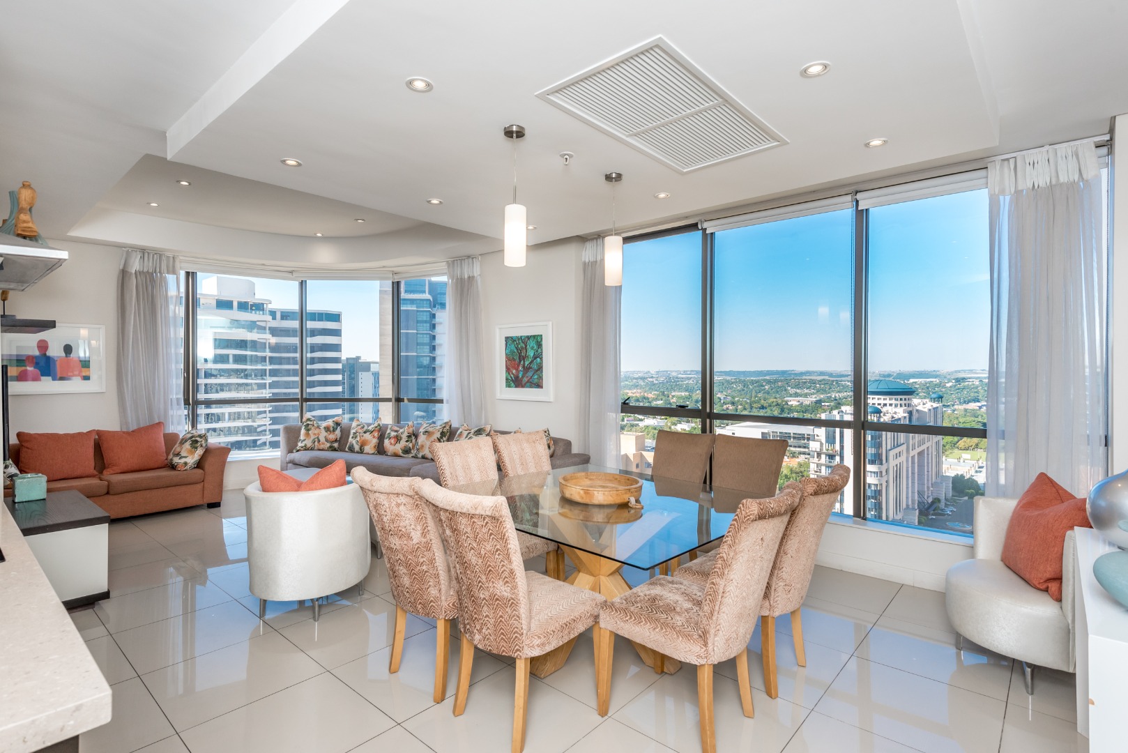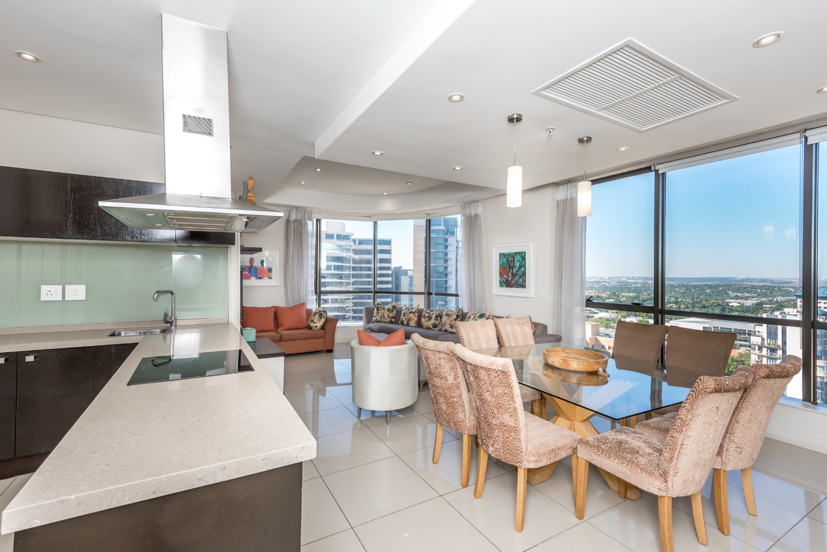 The spacious open-plan lounge and dining area is framed by dramatic floor-to-ceiling windows that flood the apartment with natural light while showcasing spectacular birds-eye views across Sandton and beyond.